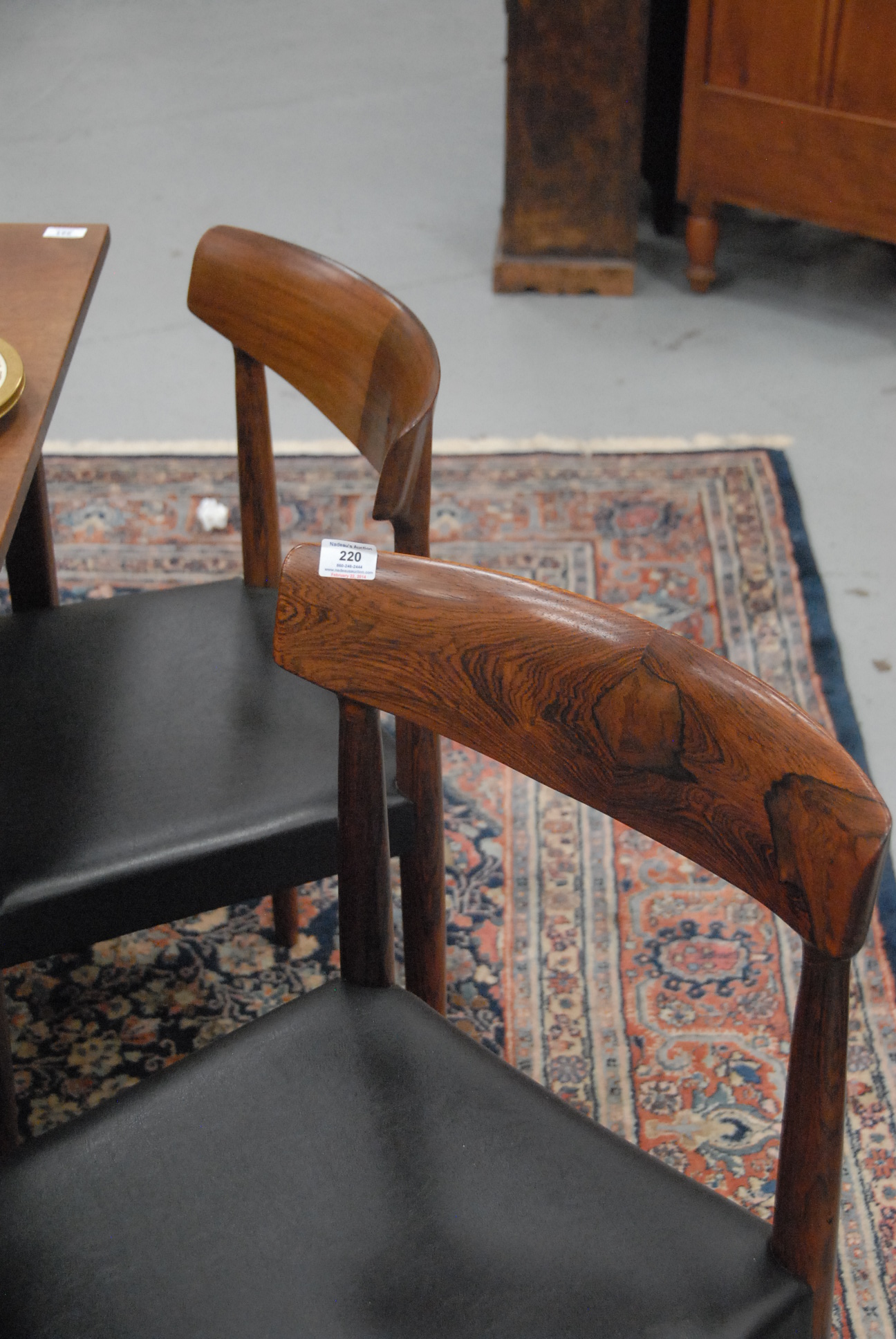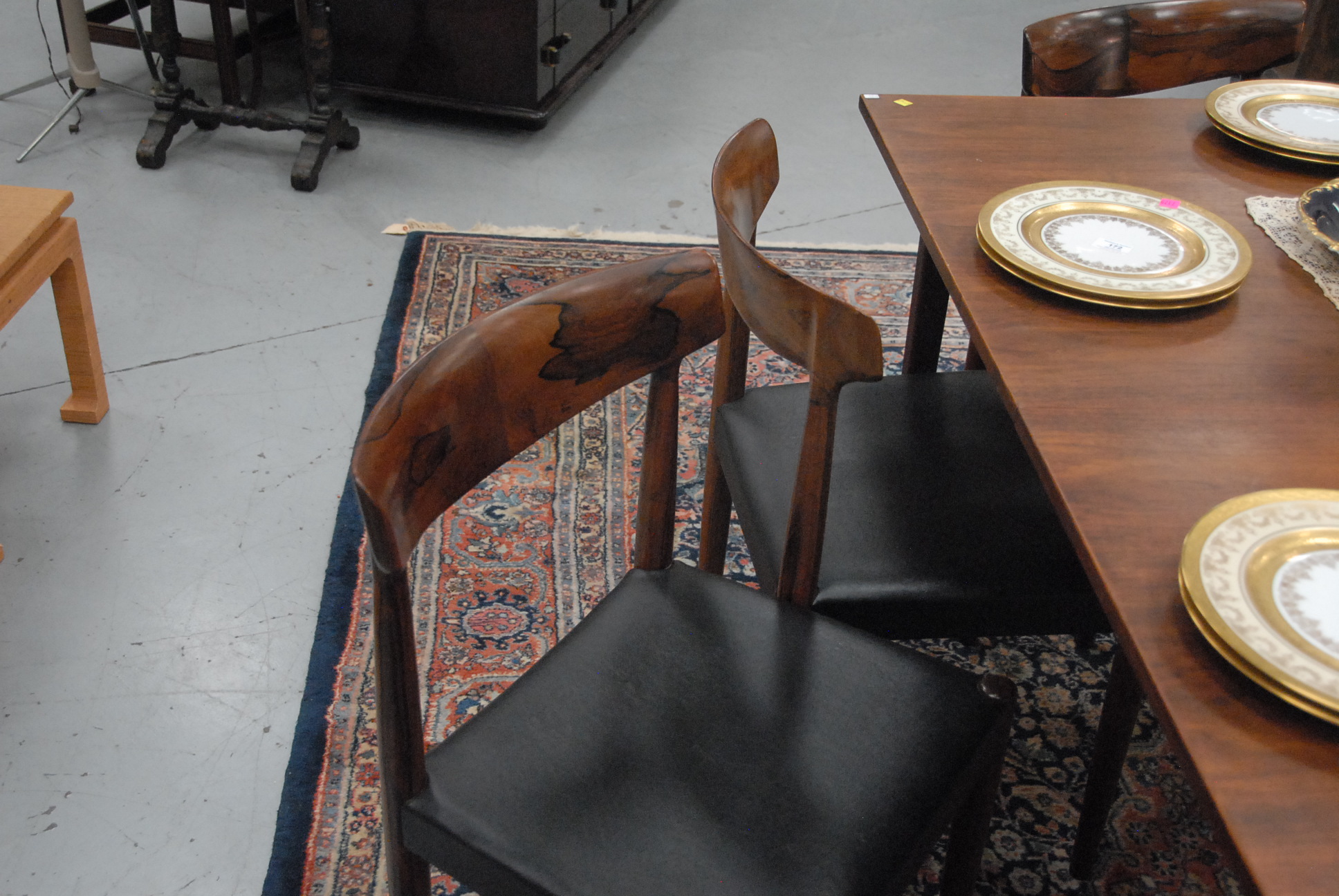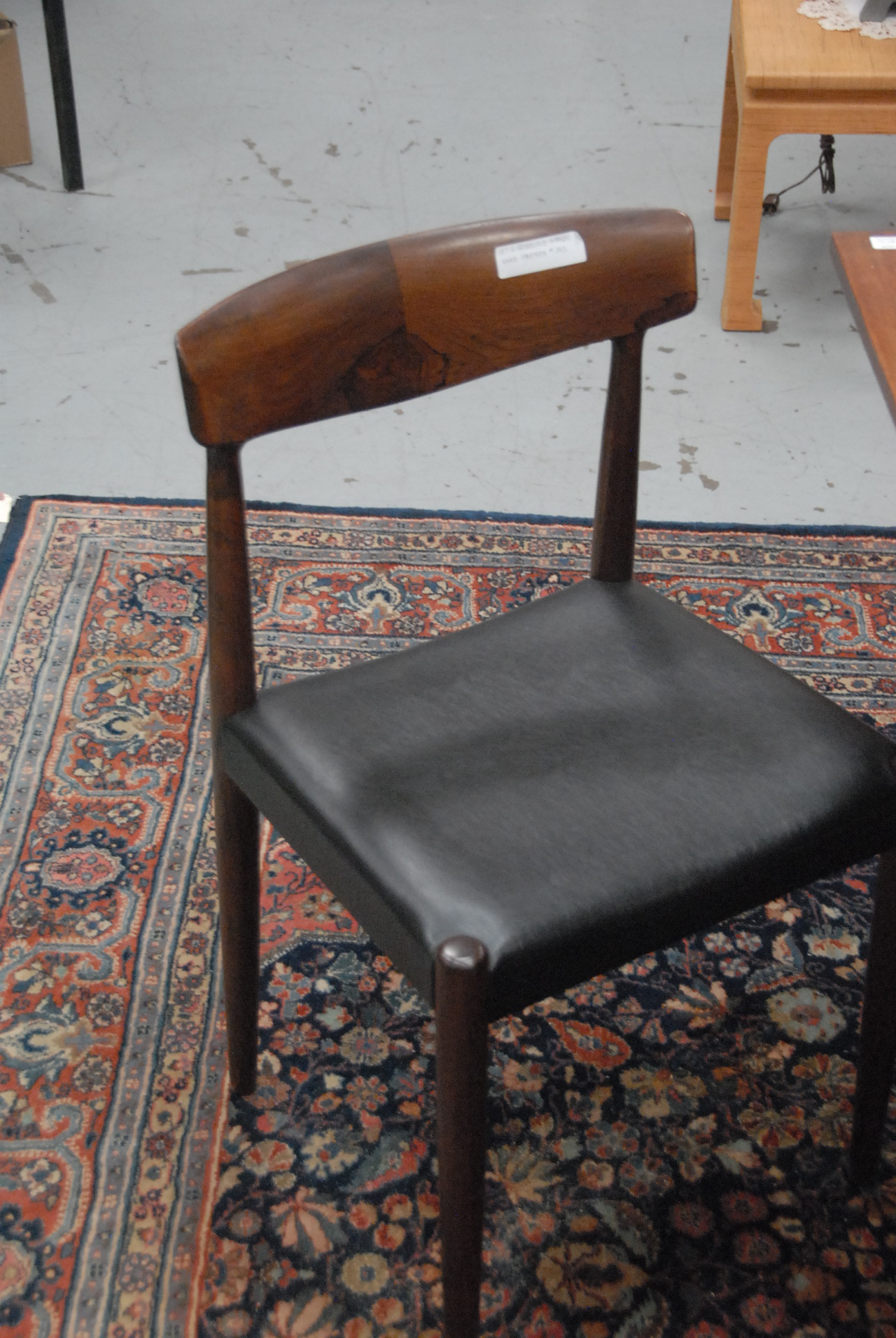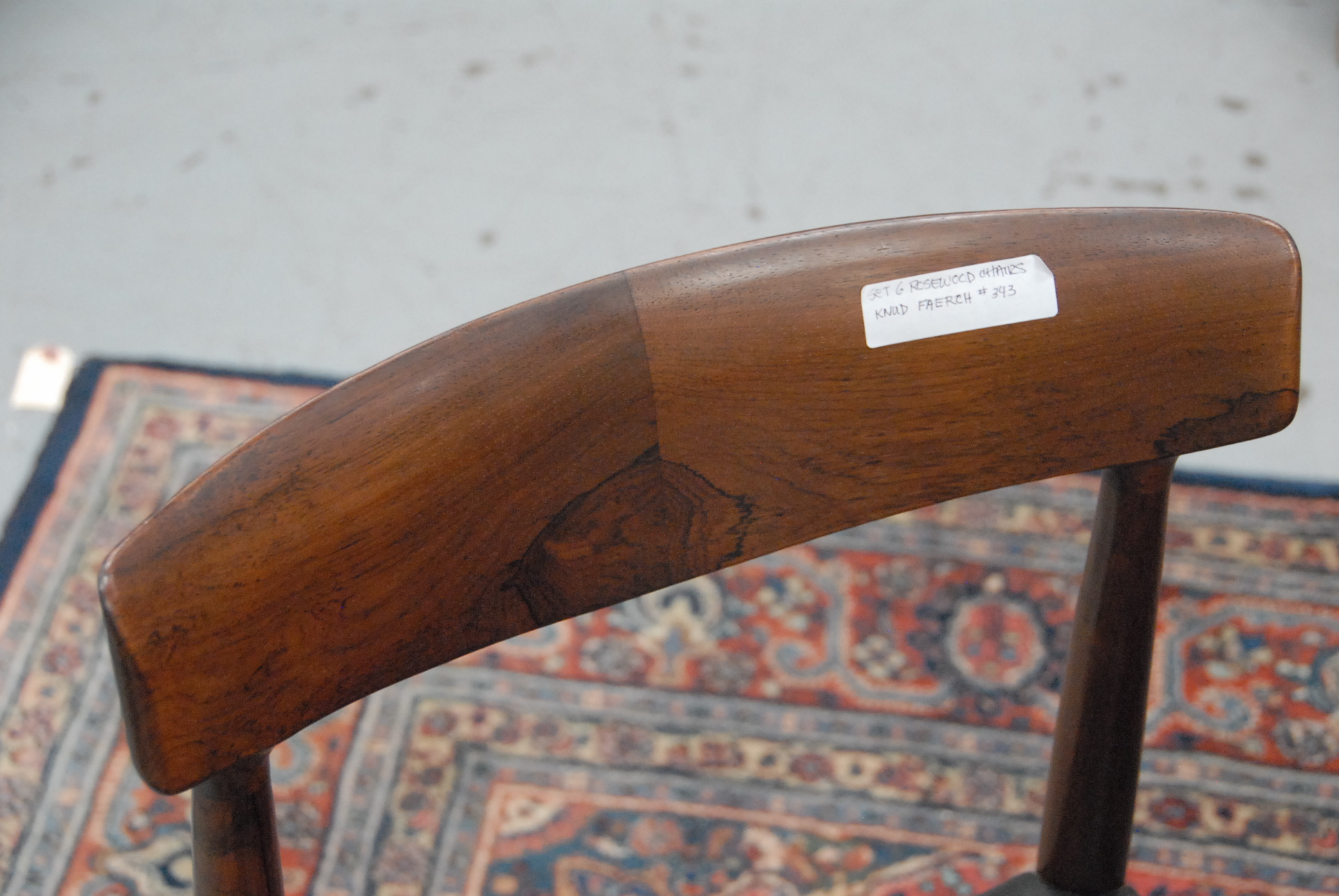 Lot 220: Knud Faerch set of six rosewood and leather chairs model #343 curvilinear back rail with black leather seat on four tapered legs.