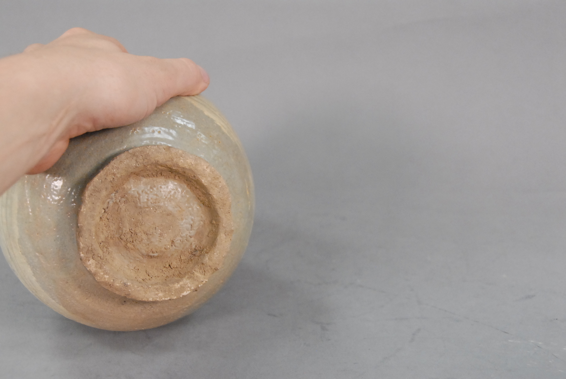 Korean pottery pear shaped vase with incised lines.