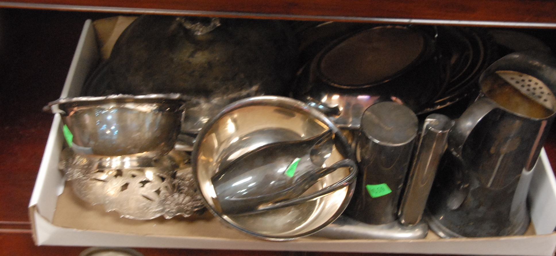 Large grouping of silverplate four covered dishes, small platters, bowls, pitcher, etc.