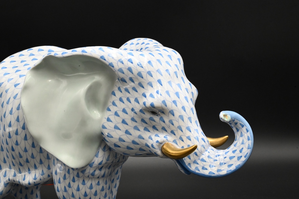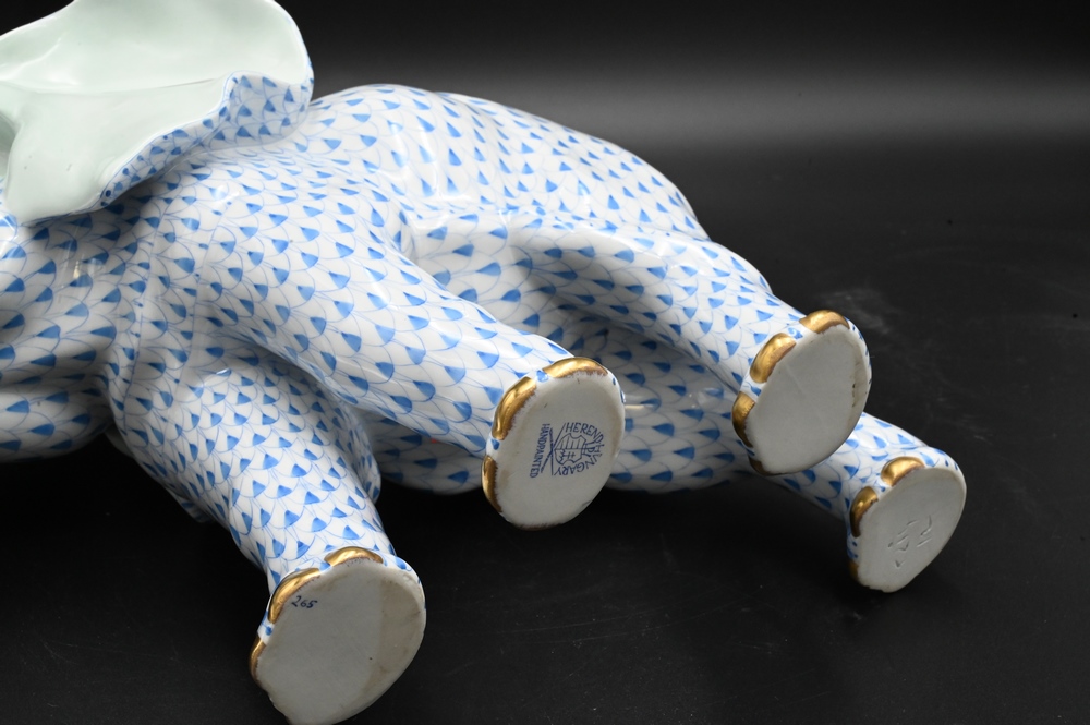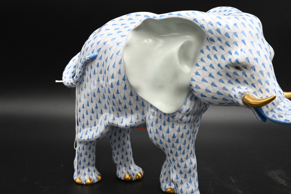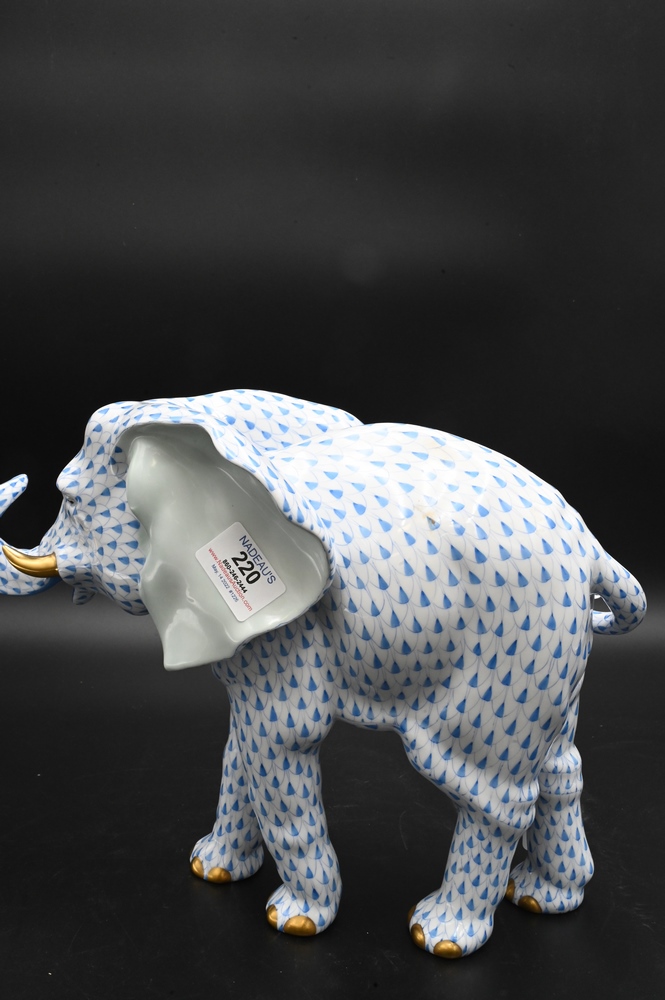 Lot 220: Large Herend Porcelain Elephant, blue fishnet pattern, marked for Herend, height 10 inches, length 15 inches.