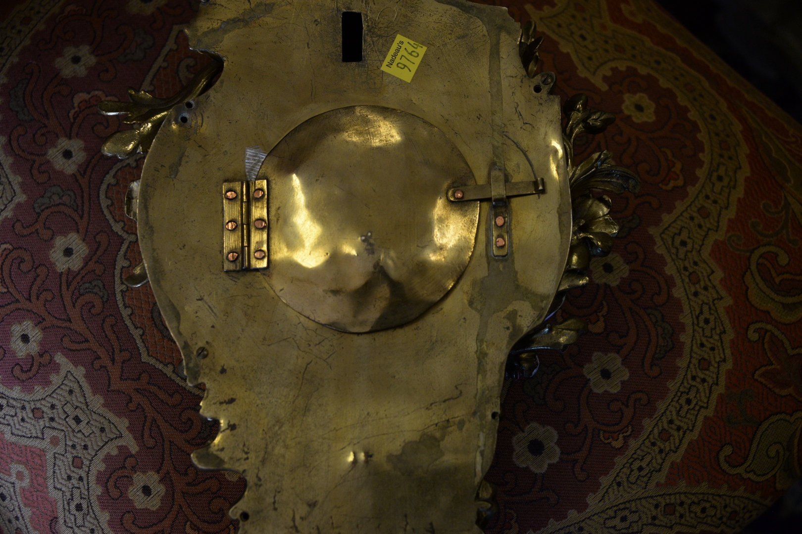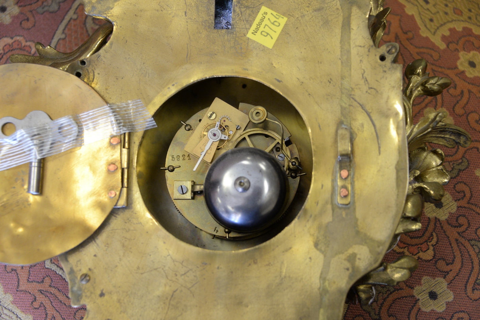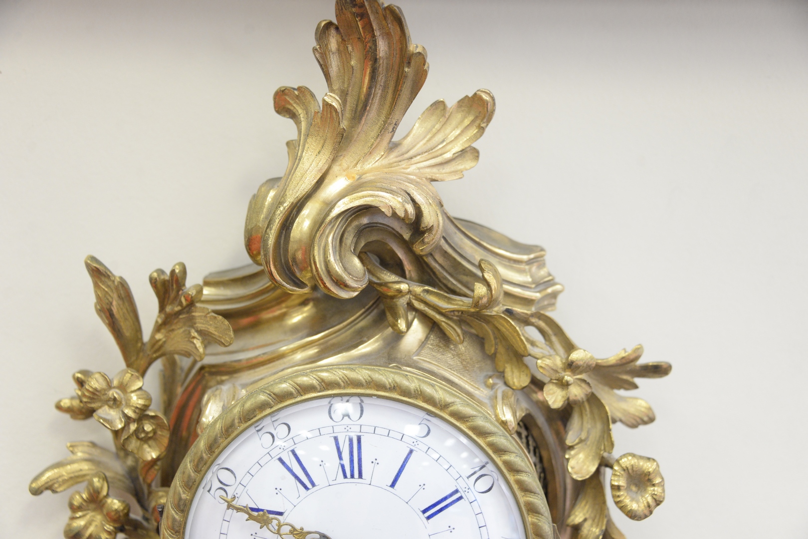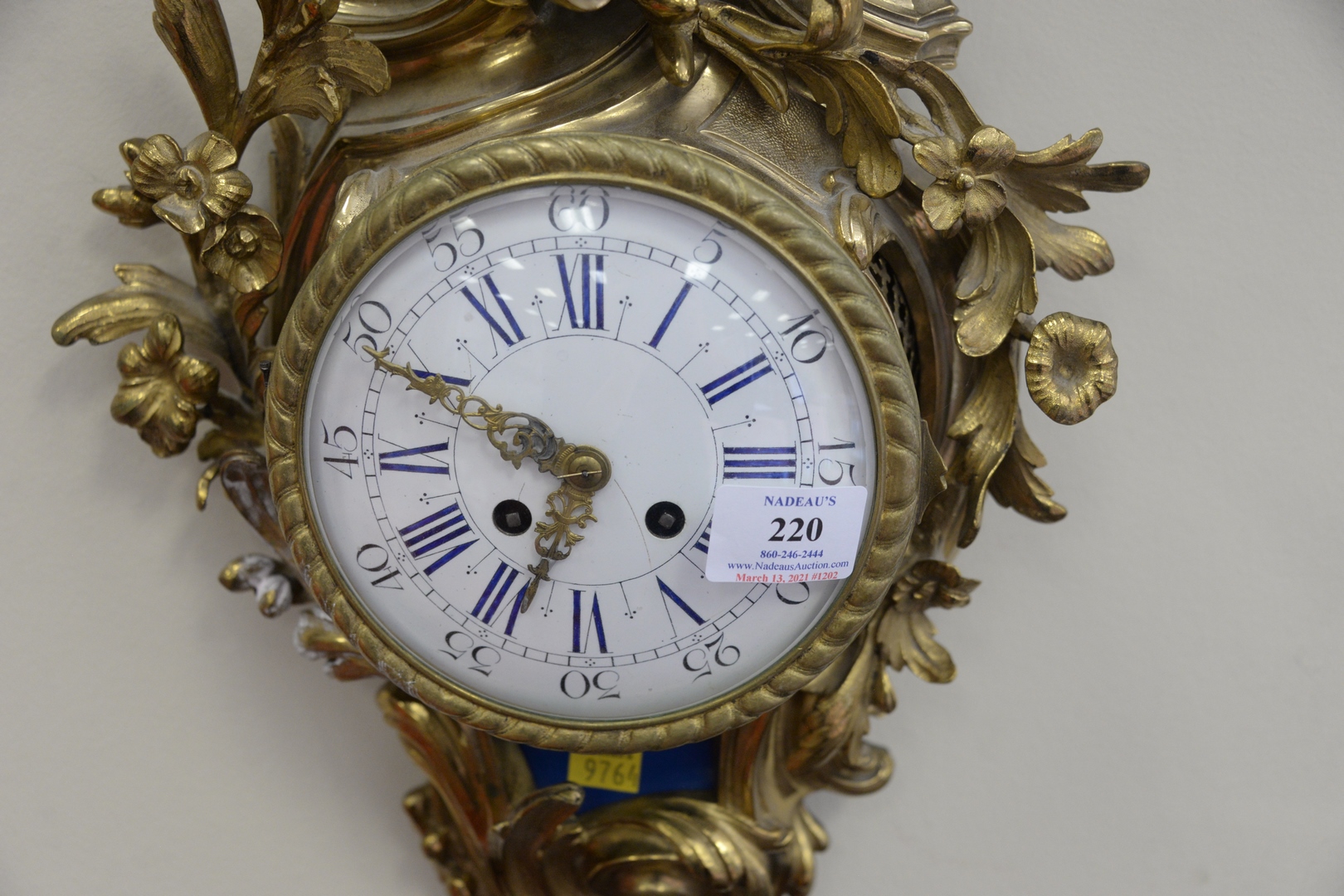 Lot 220: Louis XV Style French Wall Clock, brass with porcelain dial, small hairline in dial, height 19 inches.