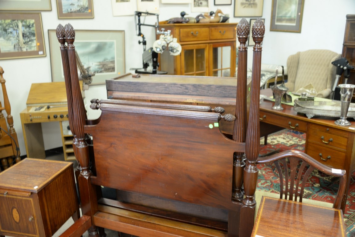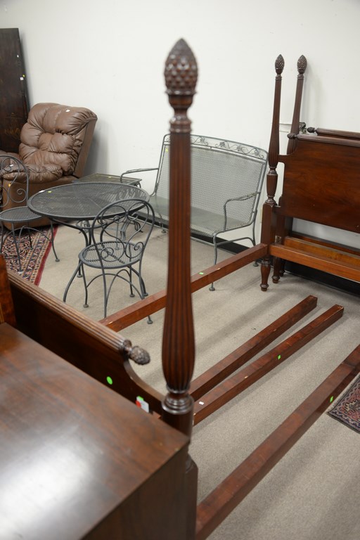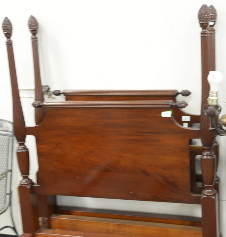 Lot 220: Pair of custom mahogany four post twin beds with pineapple tops, attributed to Margolis imperfection on one low pineapple. ht. 61 in.