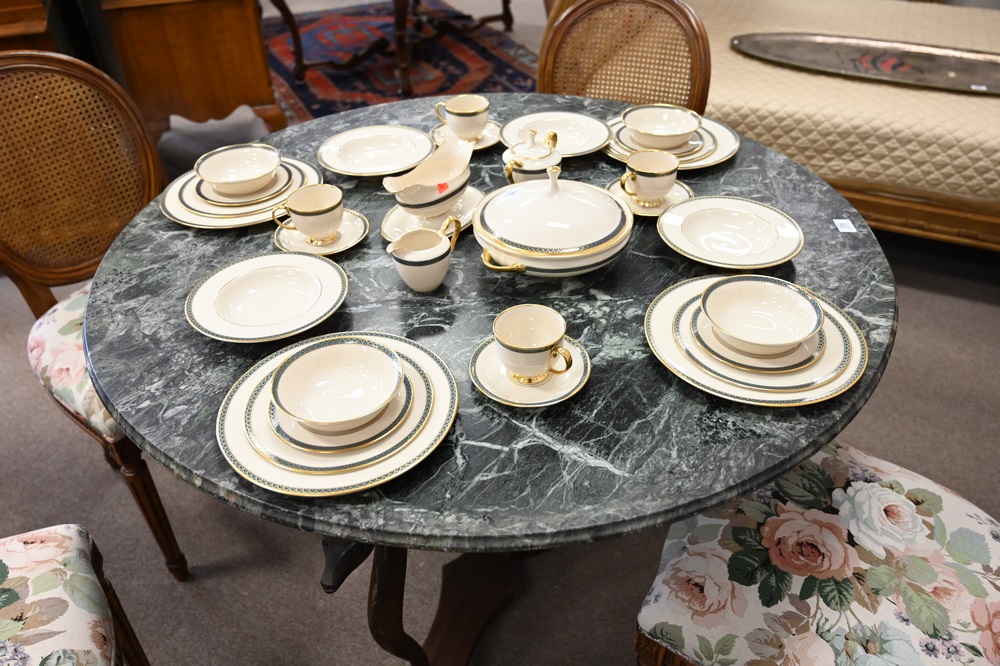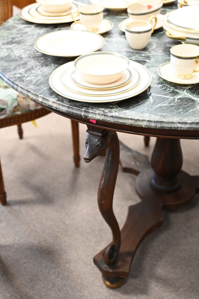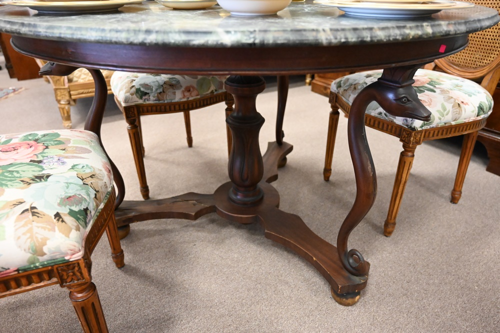 Lot 220: Round Marble Top Table, on center support having three serpent supports, minor veneer damage on base, height 30 1/2 inches, diameter 47 inches.