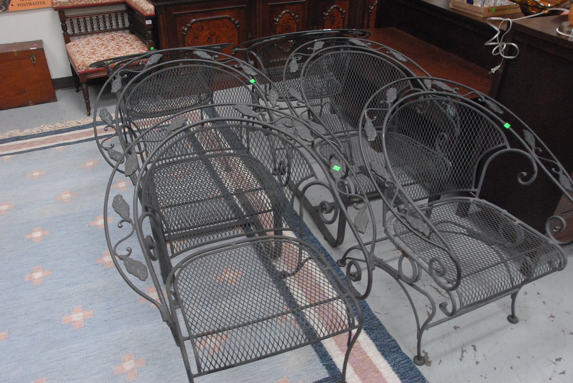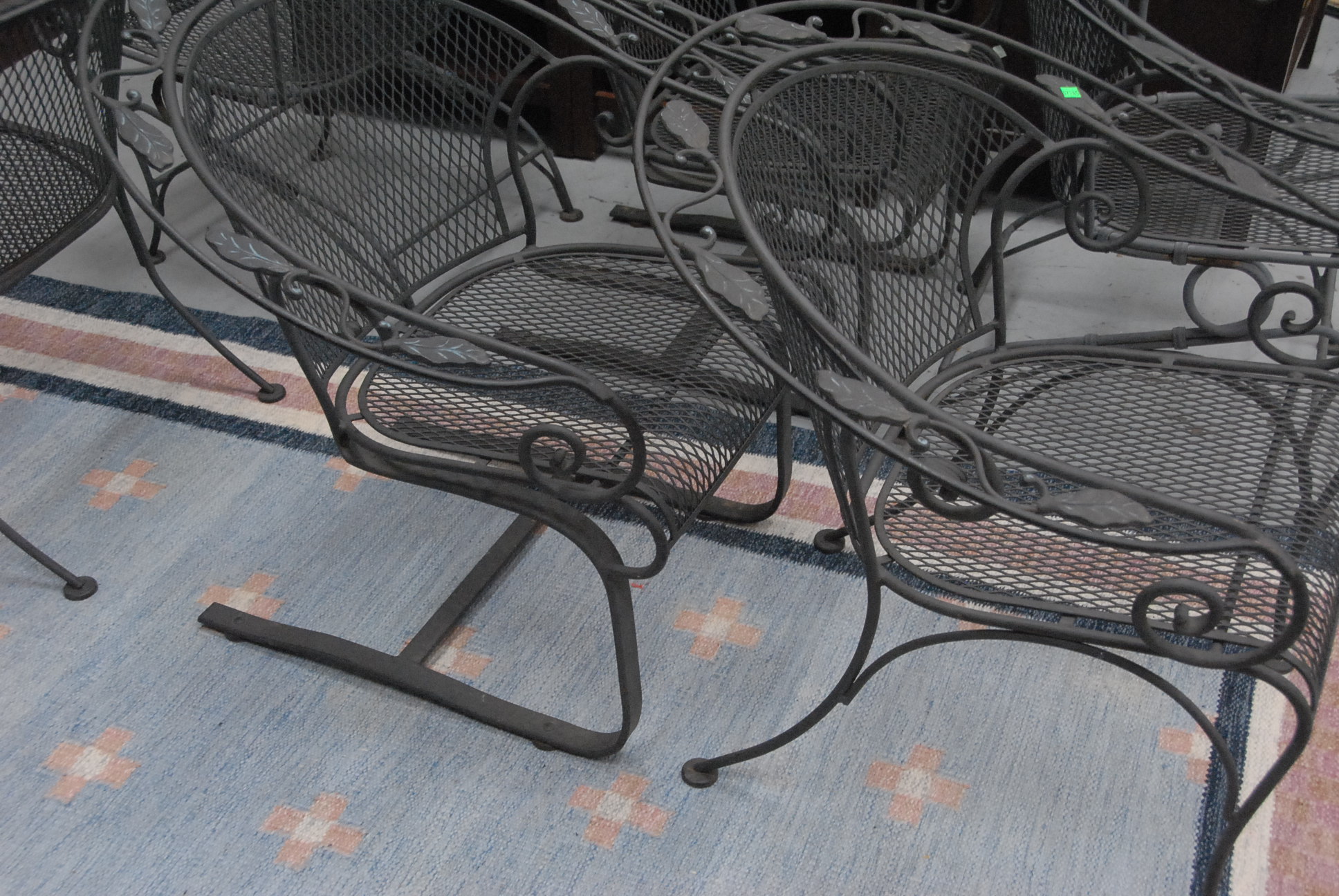 Six piece lot to include two mesh iron armchairs and four rockers.