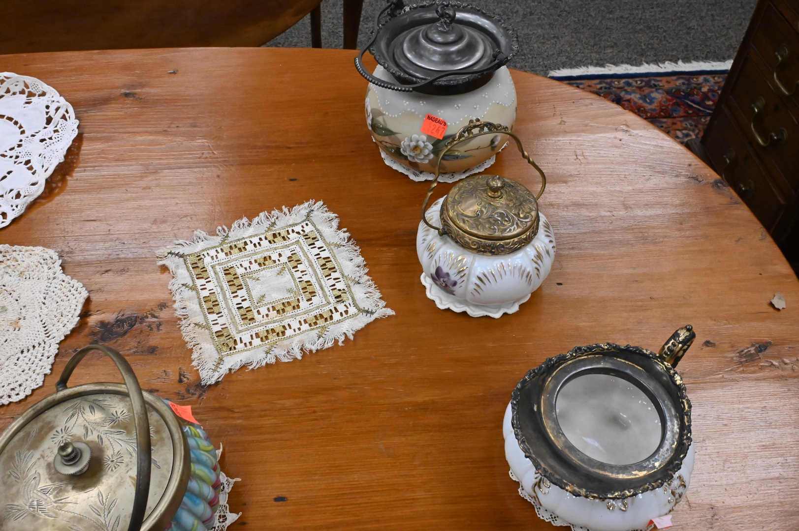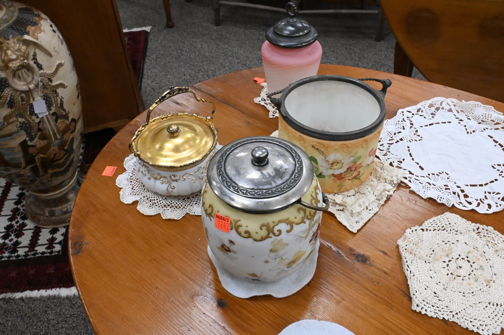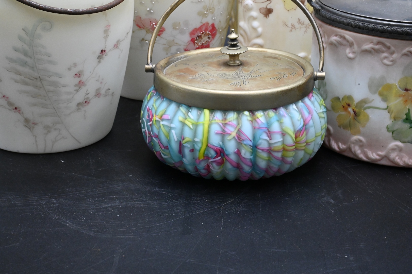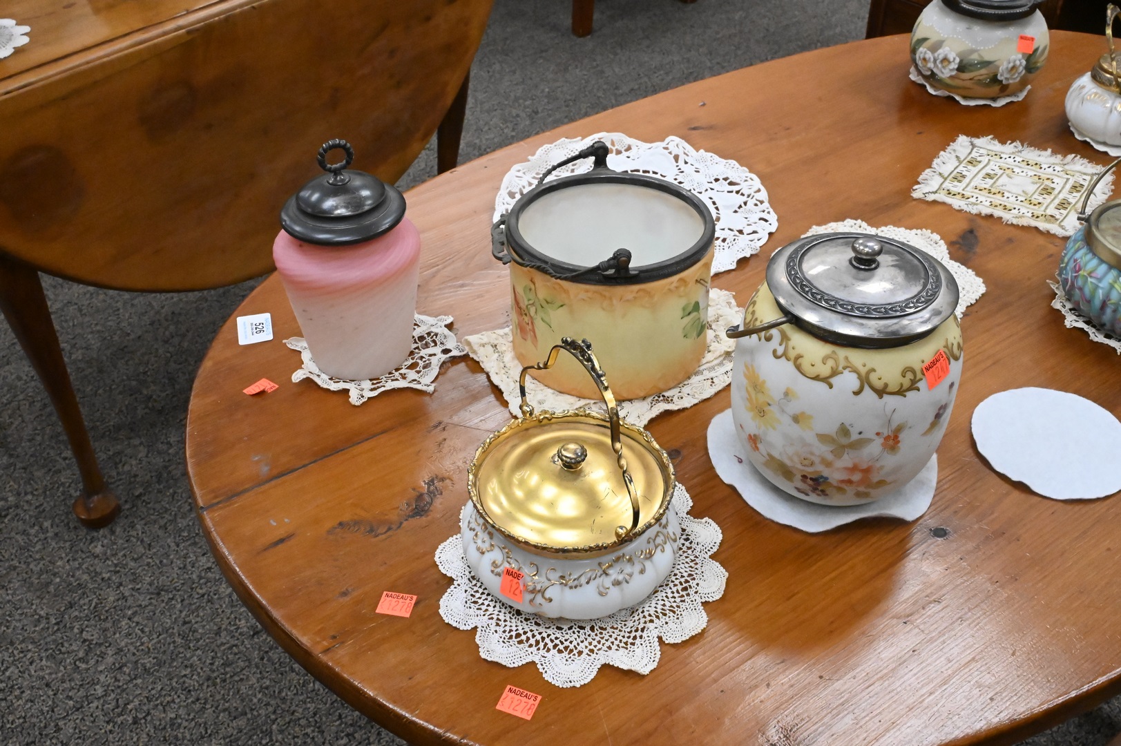Twelve Piece Misc. Victorian Glass Biscuit Jars, misc. items, Mt. Washington art glass, etc.; tallest 6 1/2 inches. Provenance: From the Estate of Elwyn W. Lemon, Enfield, Connecticut.