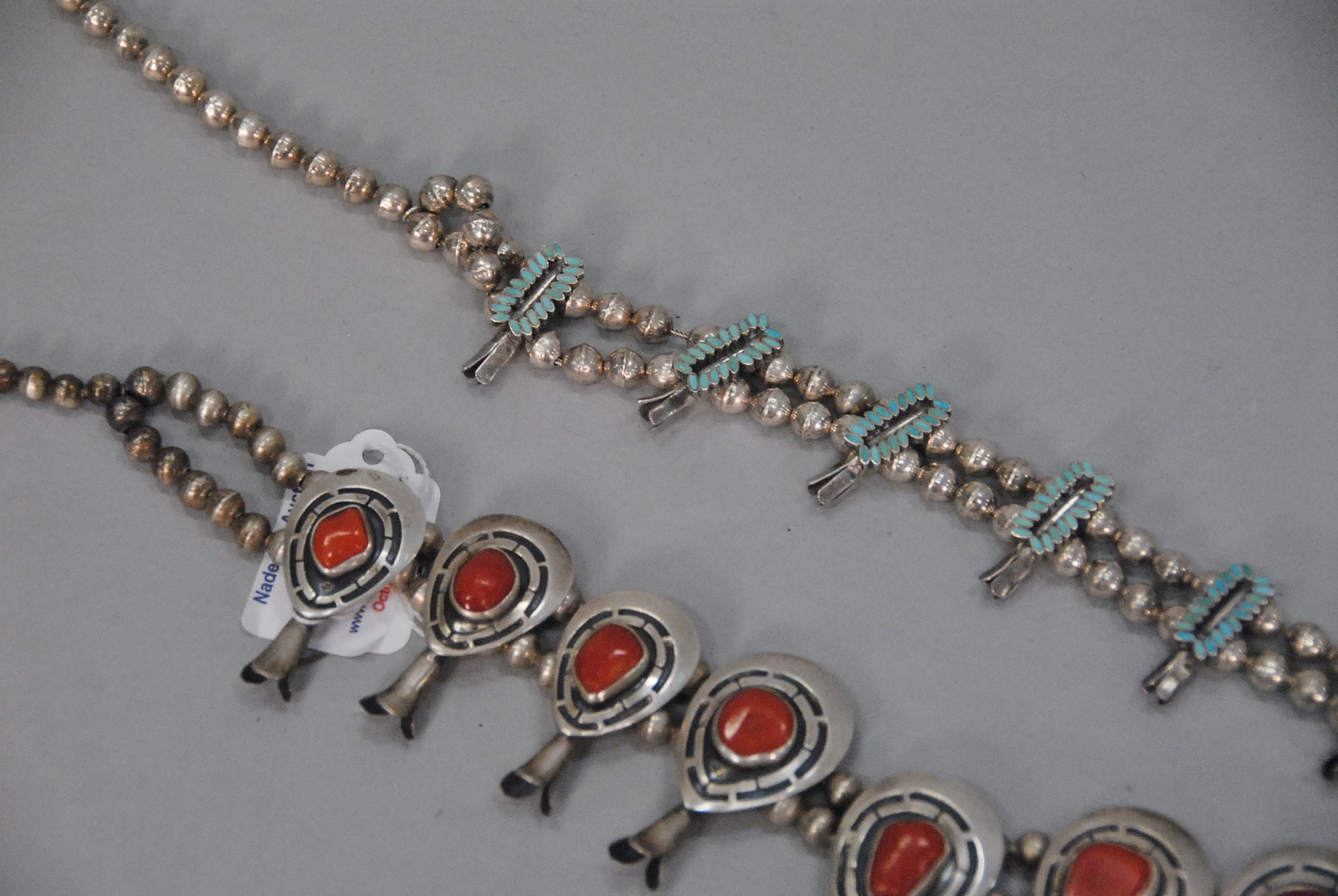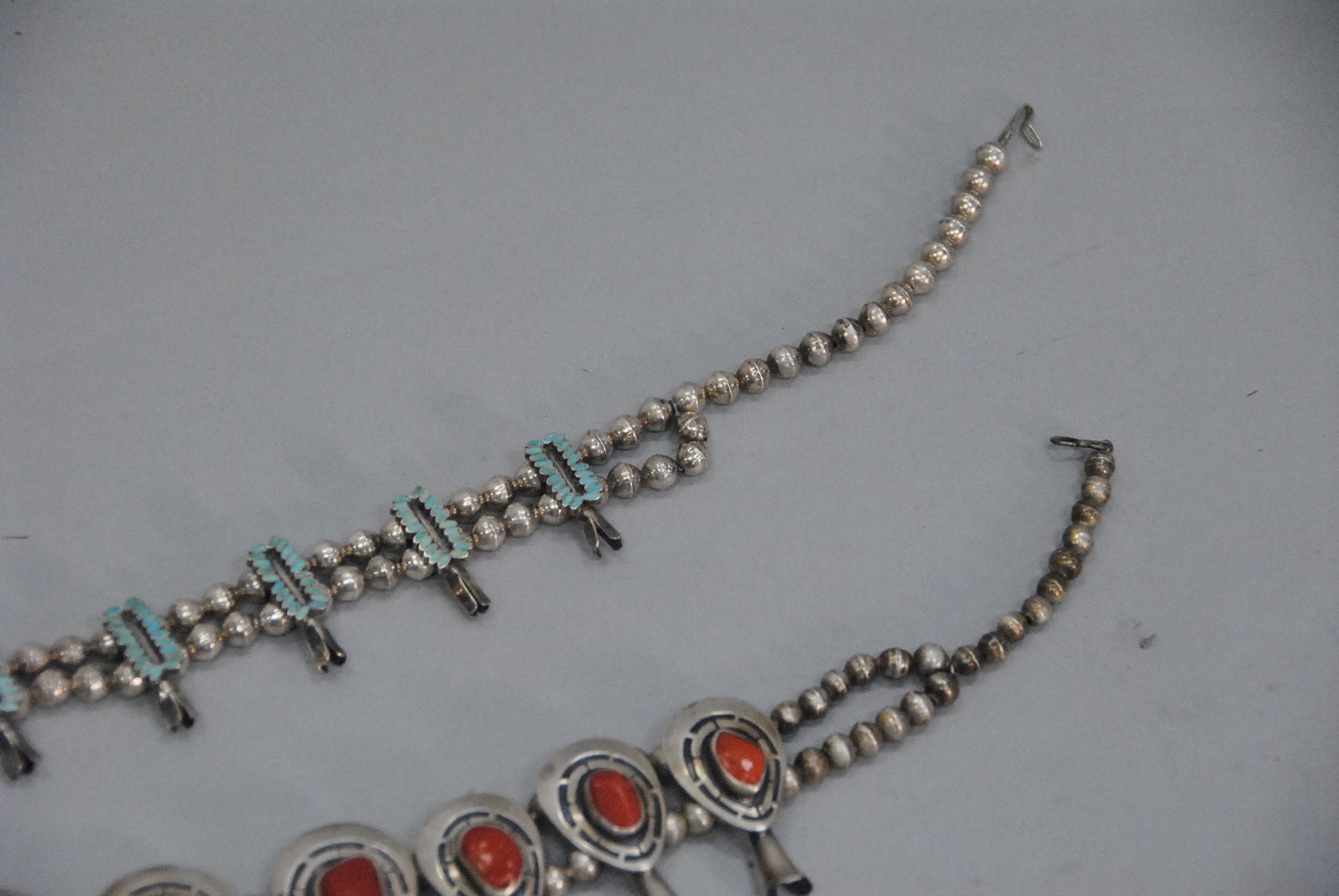 Two silver necklaces mounted with turquoise and red stones. lg. 28in.