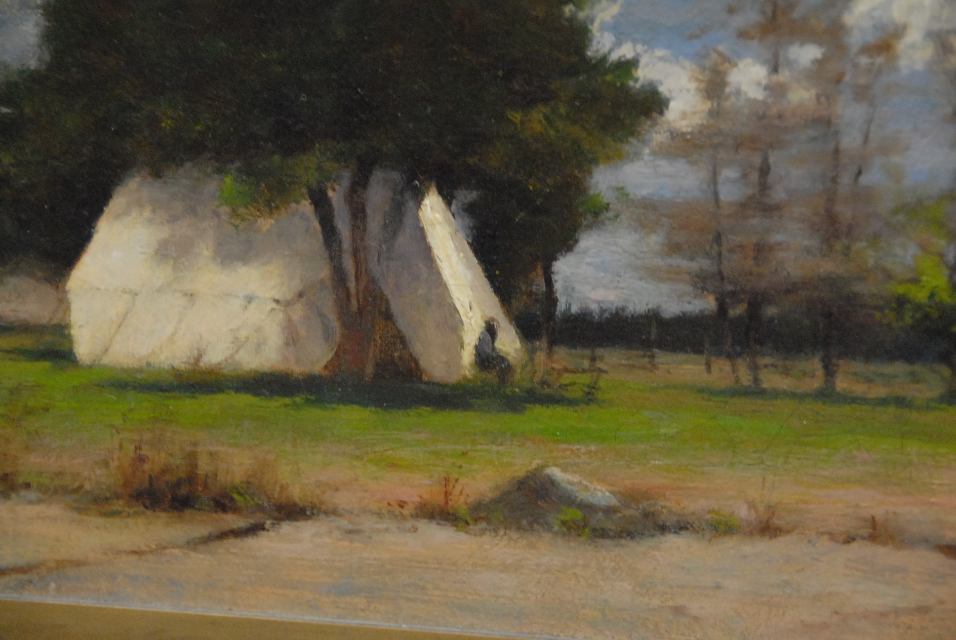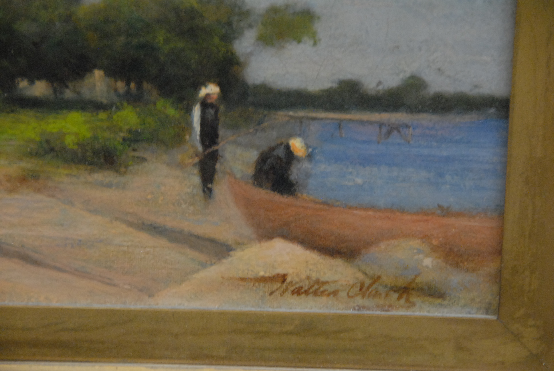 Walter Clark 1848-1917 HOUSE ON LAKE’S EDGE oil on canvas signed lower right Walter Clark 8 x 20