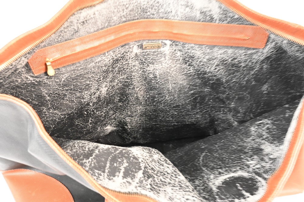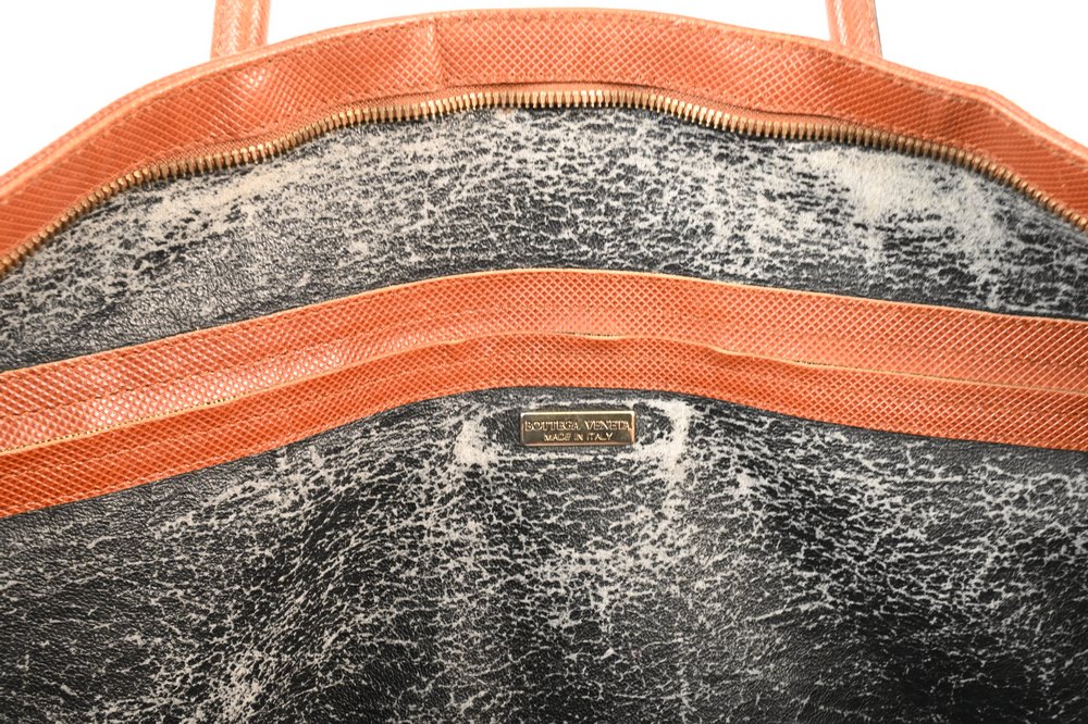 Bottega Veneta Large Black Leather Travel Bag, having black leather, brown accents, double handle, brass feet, interior zip pocket, in pre-owned condition, lining very worn, losses to leather on outside corners, height 14 inches, width 28 inches.