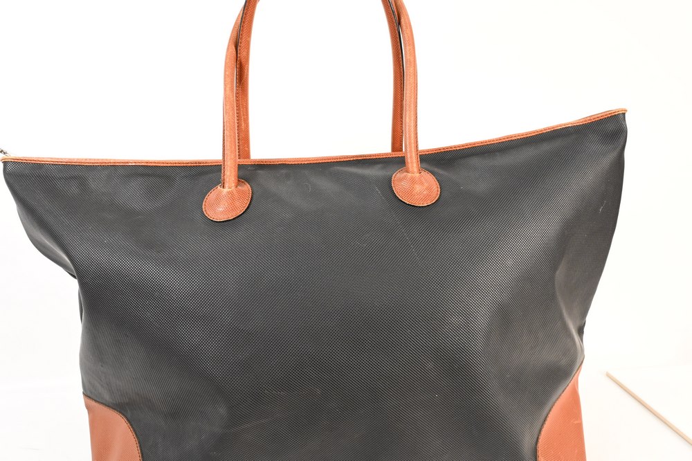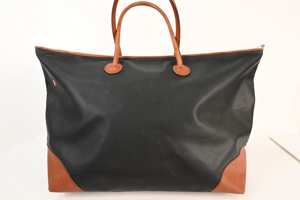 Lot 221: Bottega Veneta Large Black Leather Travel Bag, having black leather, brown accents, double handle, brass feet, interior zip pocket, …