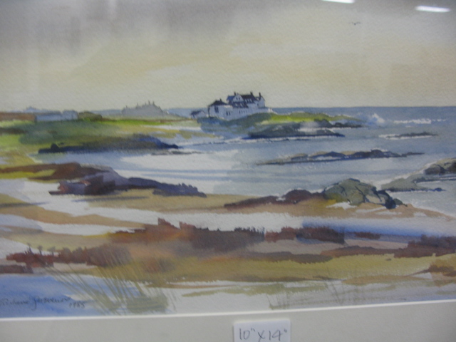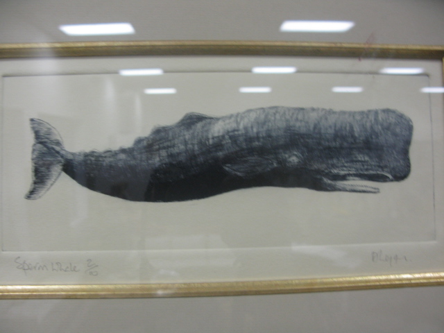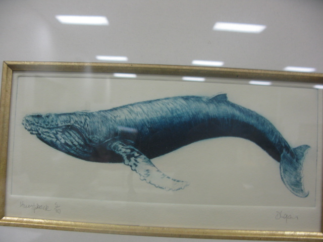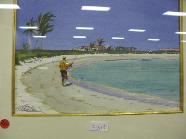 Eight piece lot including a print signed, pencil signed Ray Alice, a man fly fishing for bone fish signed CD Clark, couple whale pictures, and two coastal watercolors signed Richard Grosvenor, along with two movie posters