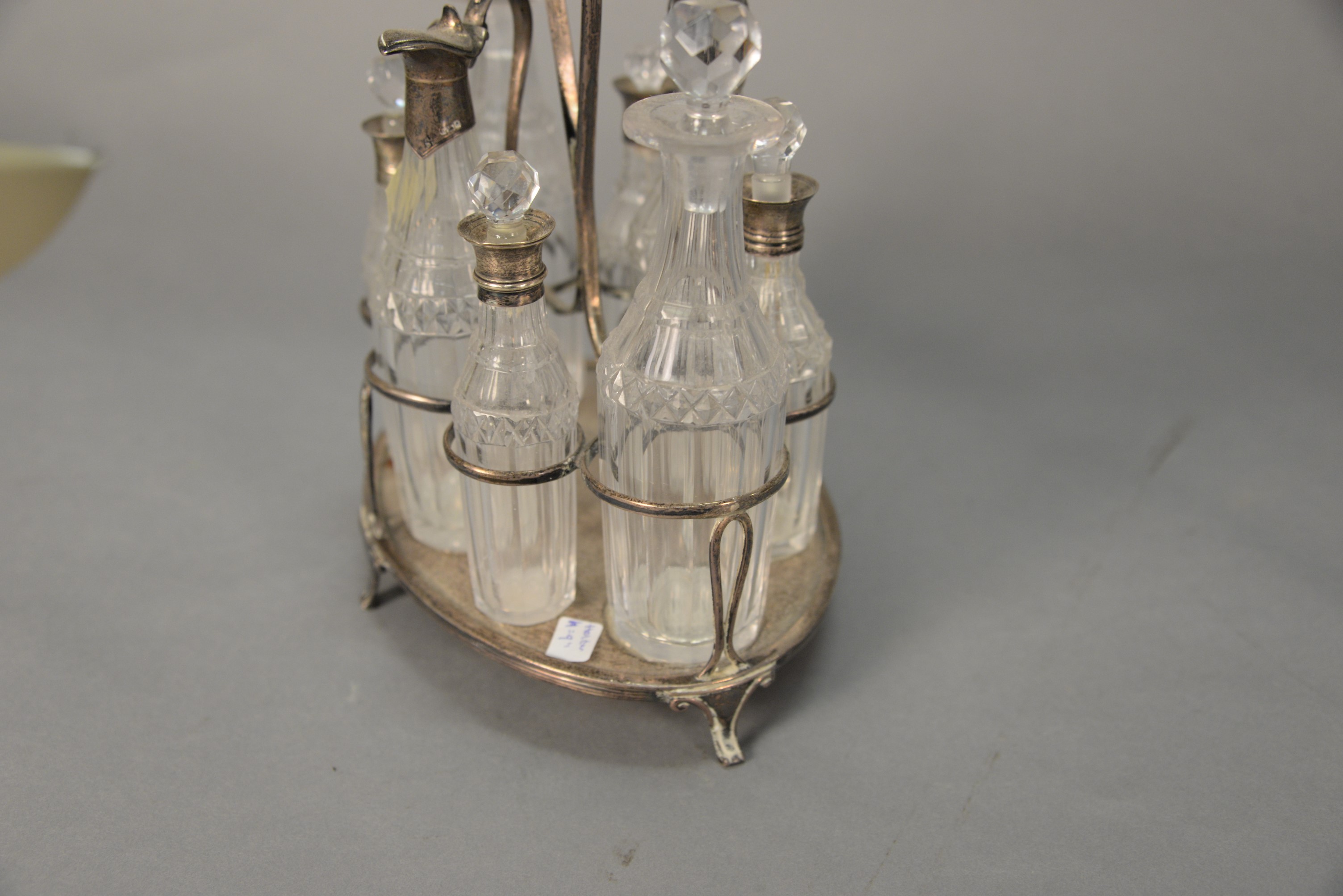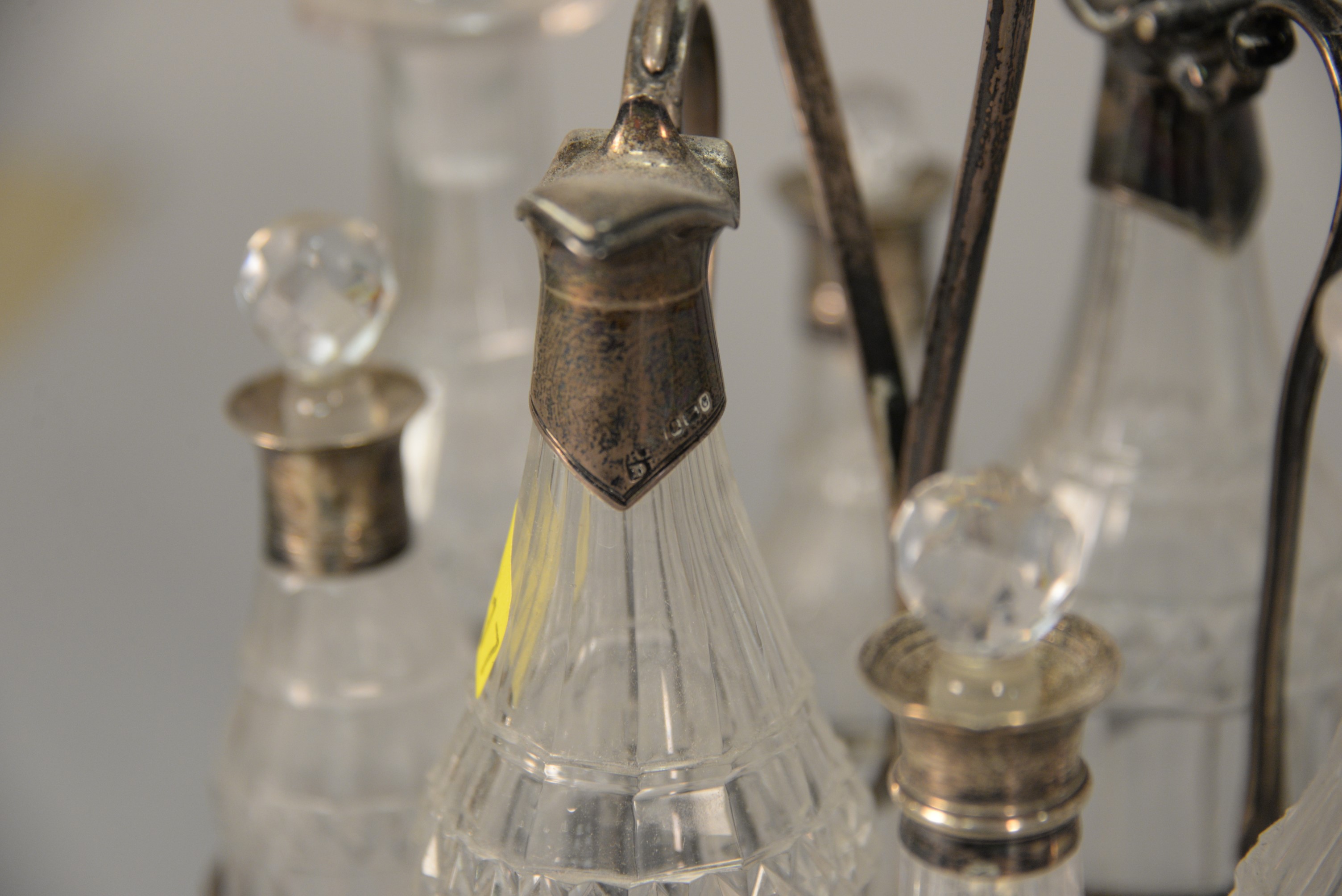 English eight bottle cruet set having silver tops in silver holder. ht. 9 in.