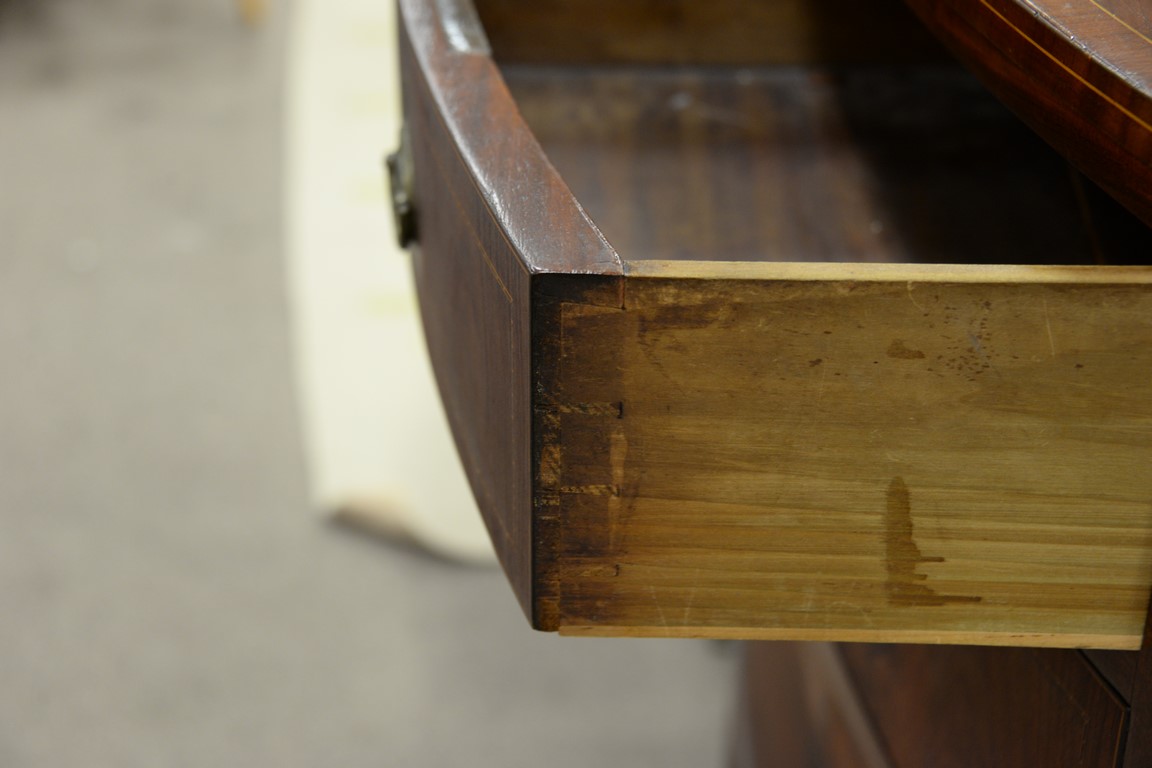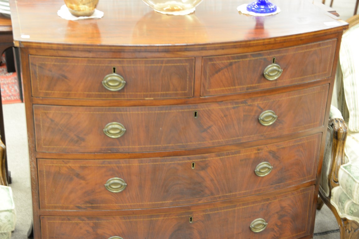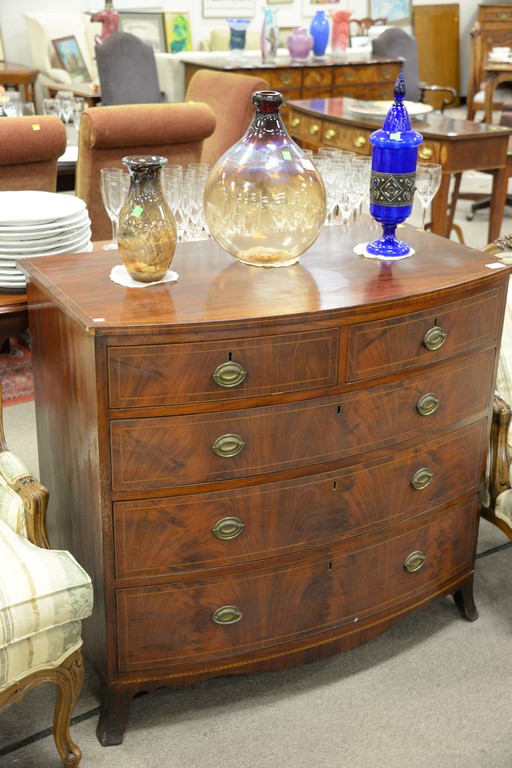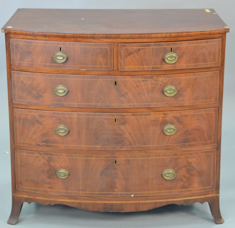 Lot 221: Federal mahogany two over three drawer bow front chest, mahogany with line inlays veneer chips. ht. 36in., wd. 39in., dp. 22in.