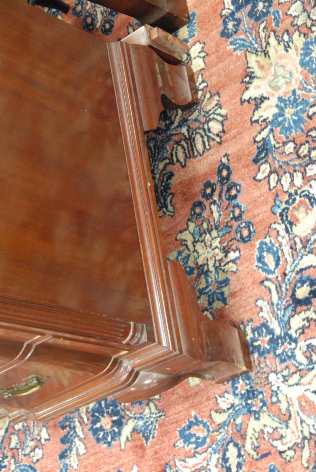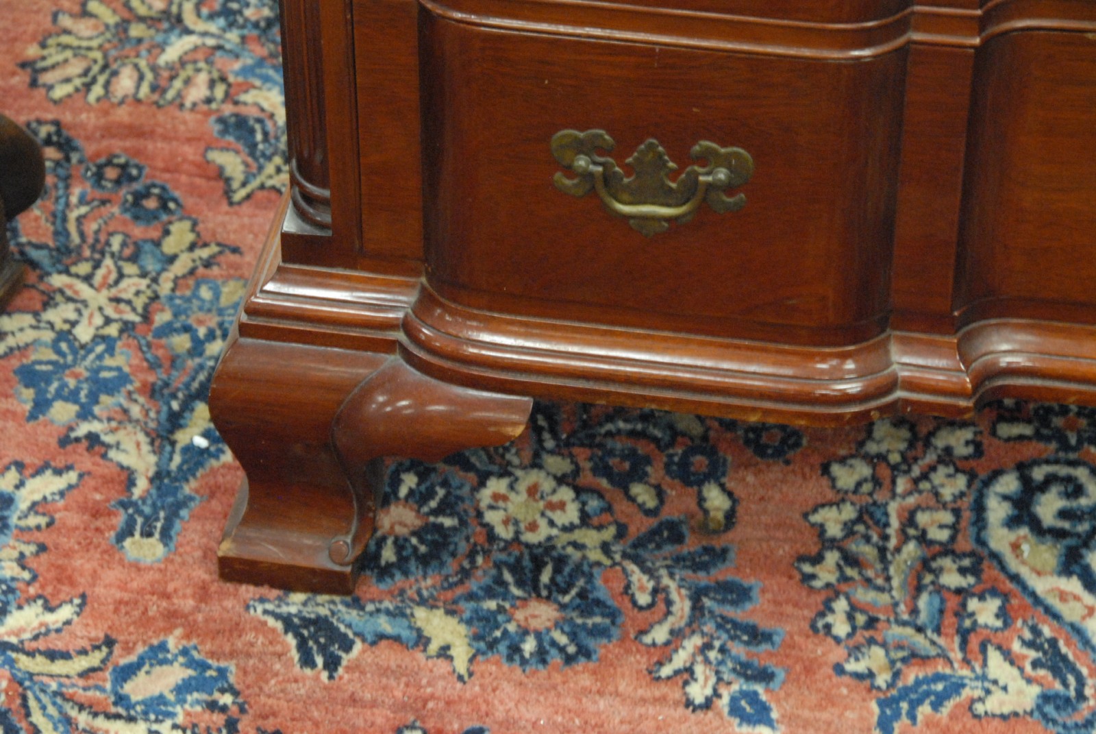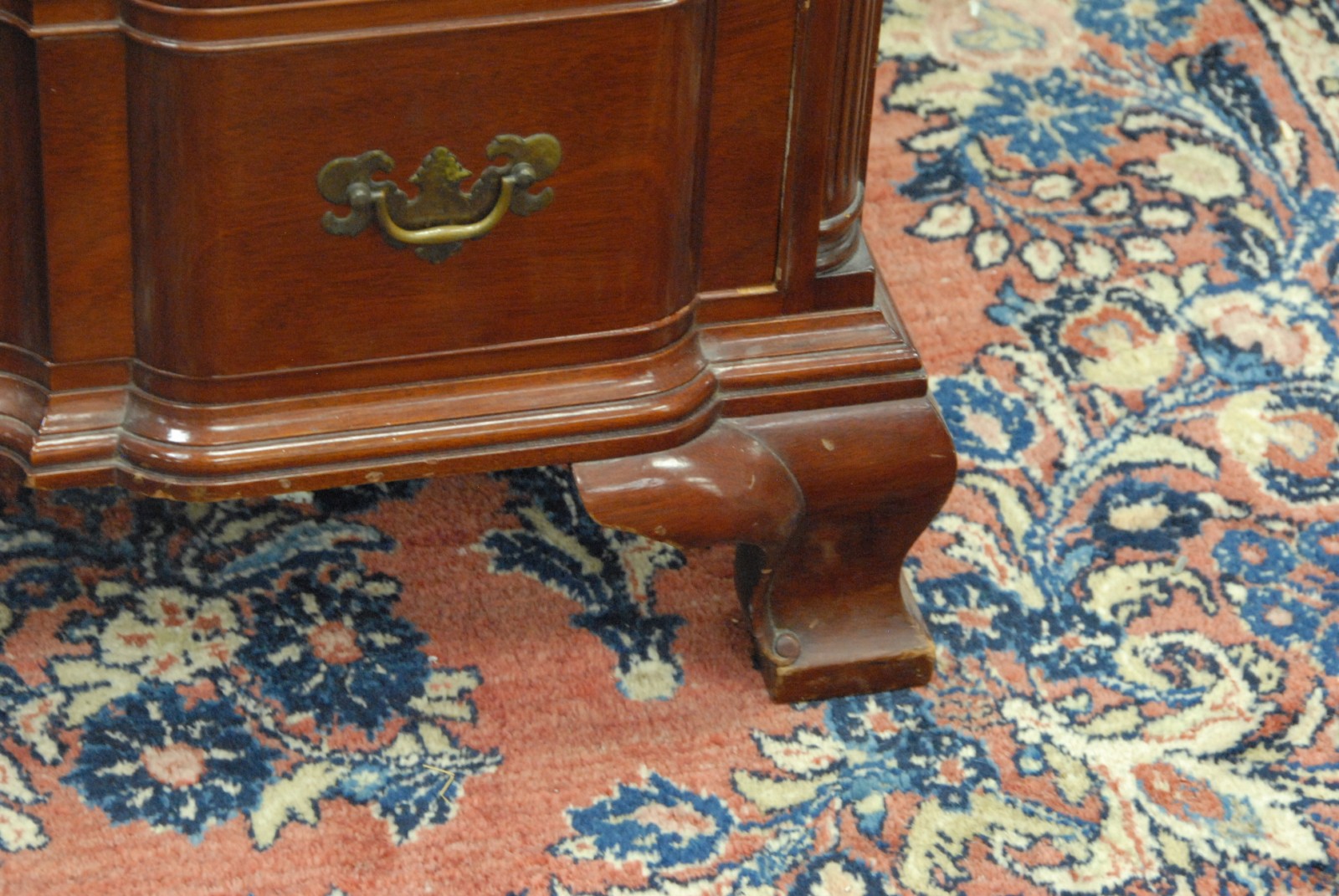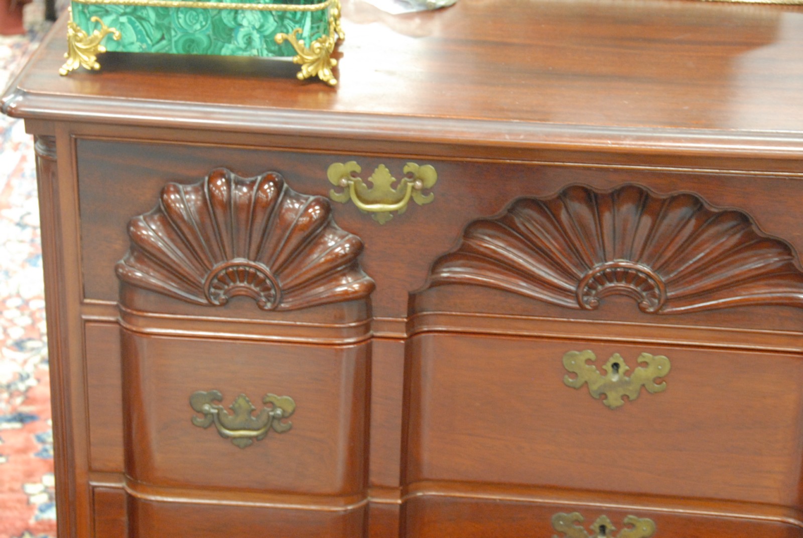 Fineberg custom mahogany block front chest of four drawers with triple shell carving, on ogee feet made by Fineberg, Hartford CT, circa 1940, along with Chippendale style mirror.