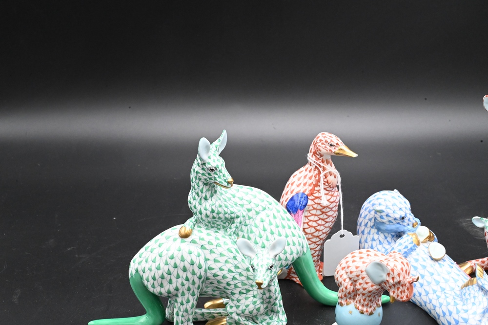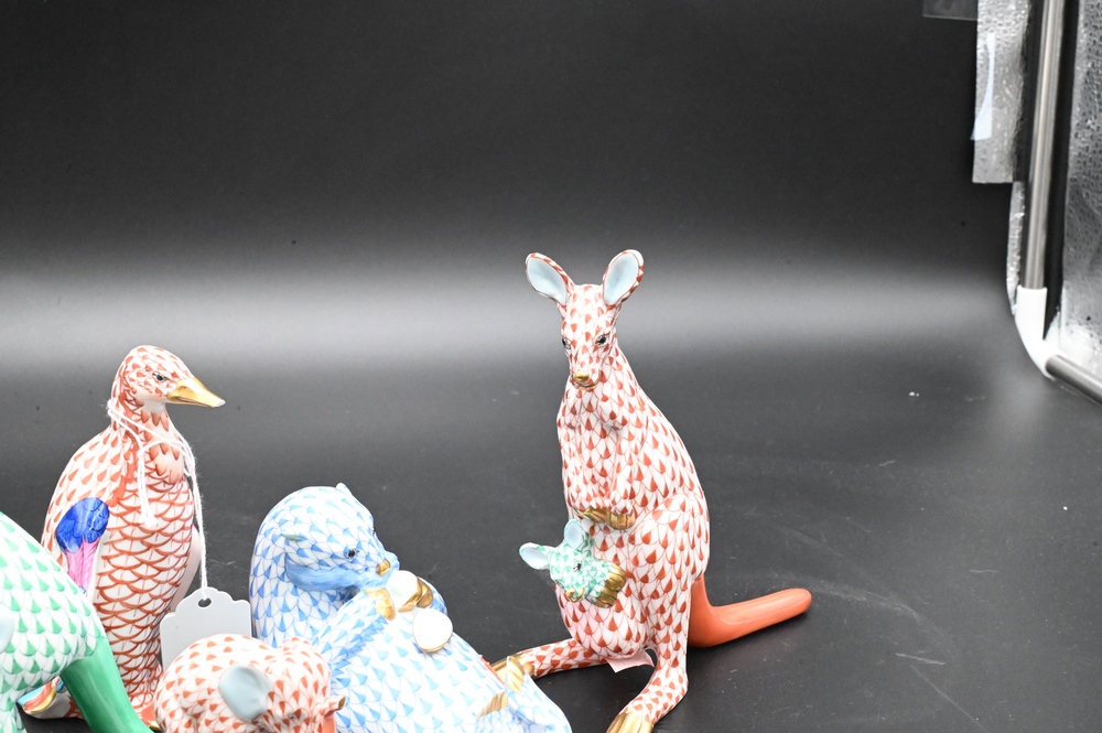 Five Herend Porcelain Figures, to include two kangaroo porcelain figures, green fishnet double figure, red fishnet figure, small elephant, blue seal/otter, along with a penguin (having chipped beak), kangaroo height 6 inches (tallest piece).