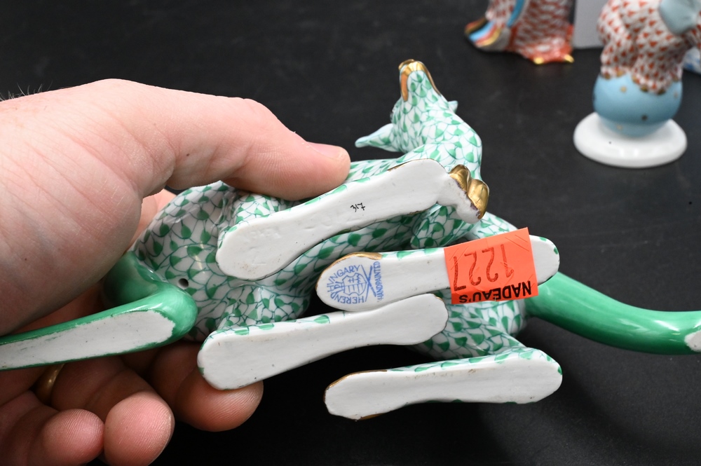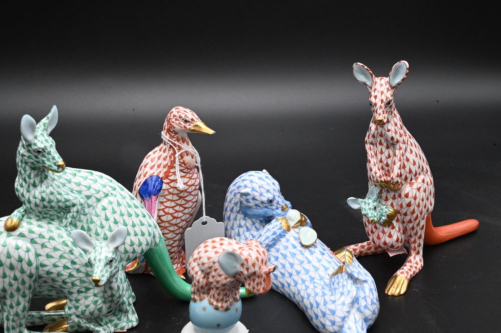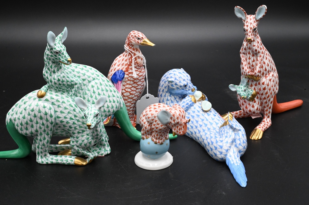 Lot 221: Five Herend Porcelain Figures, to include two kangaroo porcelain figures, green fishnet double figure, red fishnet figure, small elephant, blue seal/otter, along with a penguin (having chipped beak), kangaroo height 6 inches (tallest piece).