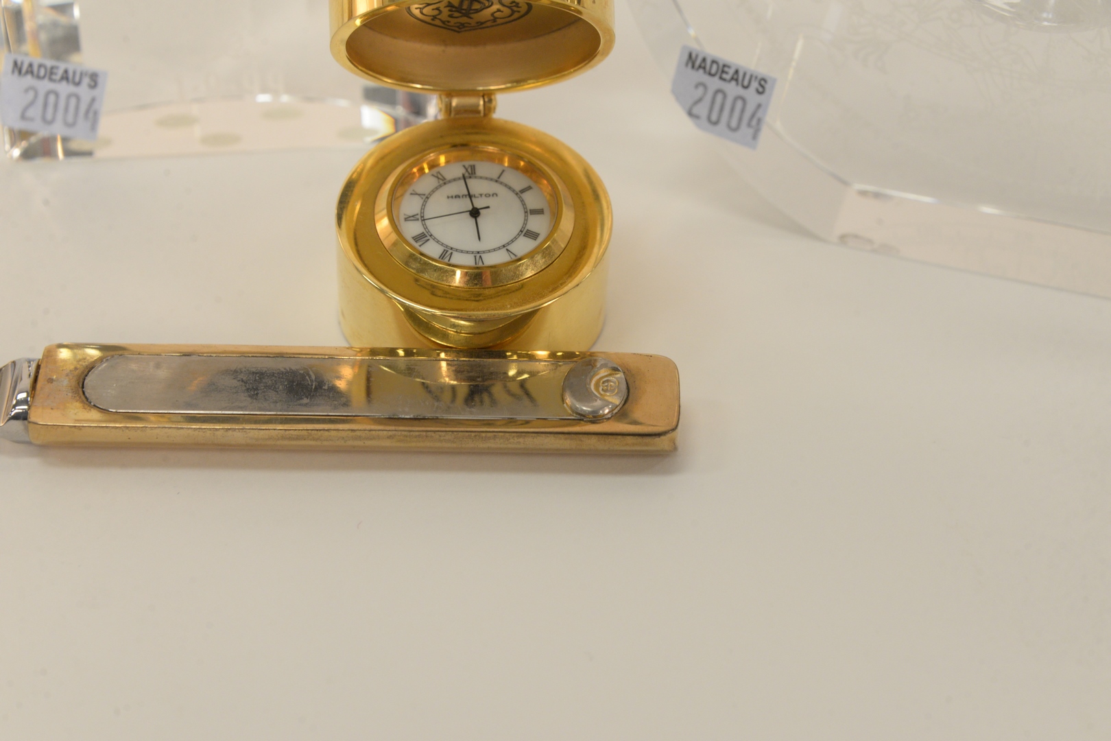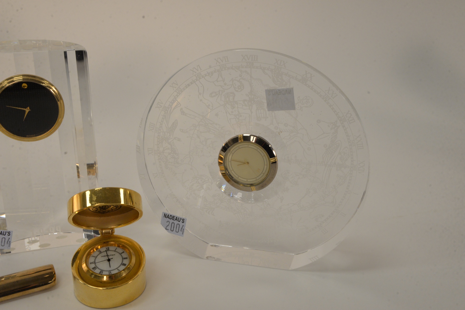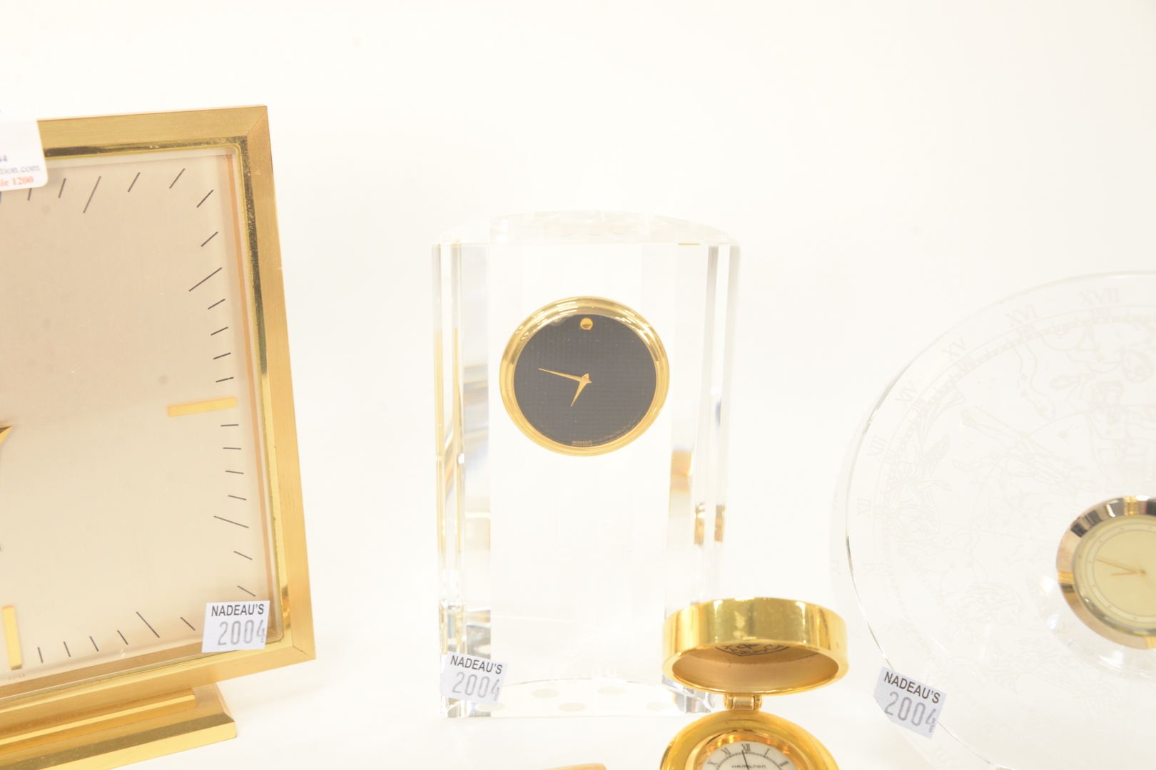 Five Piece Group, to include Movado crystal clock; square Baltman brass and glass 8-day clock; Hoya glass clock; brass Hamilton vanity clock, height 7 1/2 inches; and a Gucci olive knife. Provenance: The Estate of Alina Roisen, Park Avenue, New York.