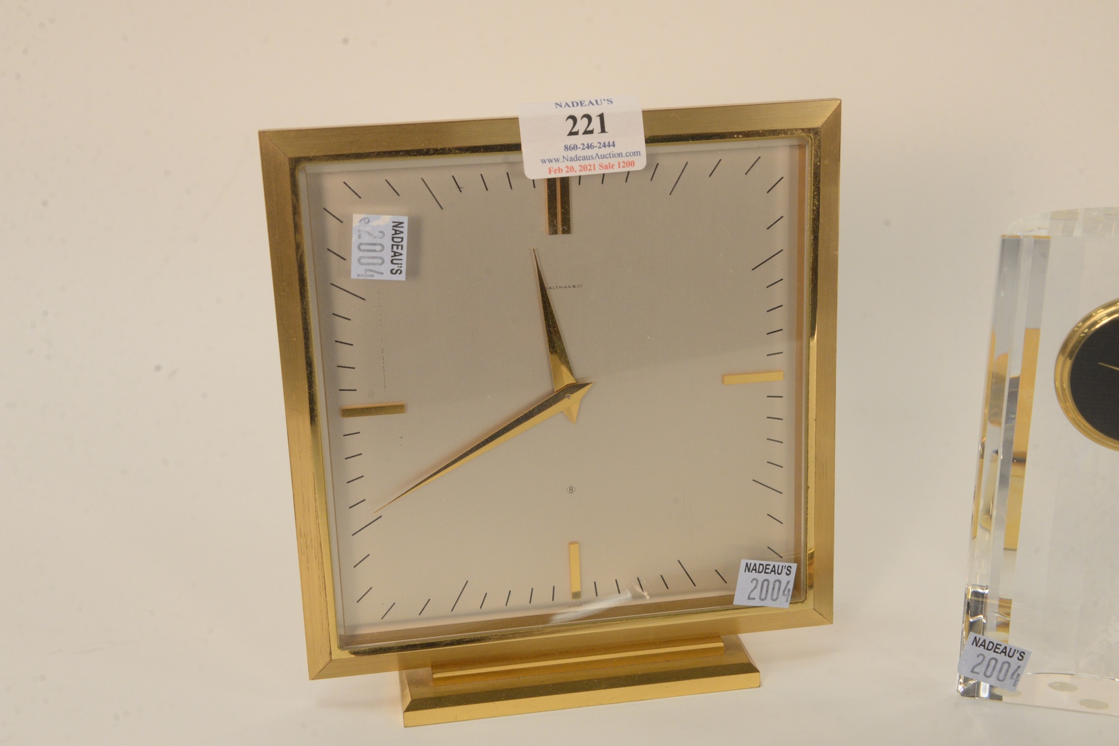 Lot 221: Five Piece Group, to include Movado crystal clock; square Baltman brass and glass 8-day clock; Hoya glass clock; brass Hamilton vanity clock, height 7 1/2 inches; and a Gucci olive knife. Provenance: The Estate of Alina Roisen, Park Avenue, New York.
