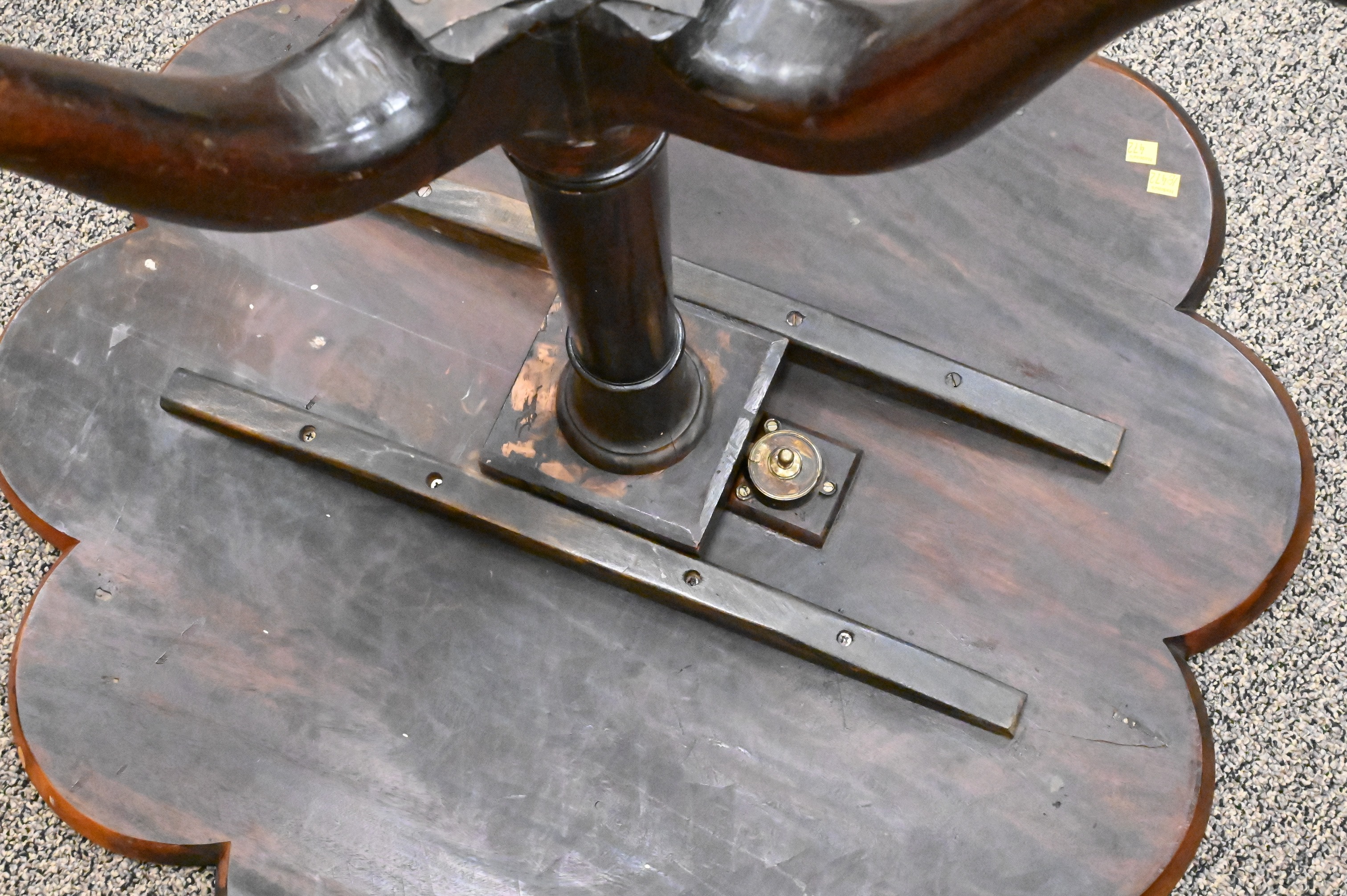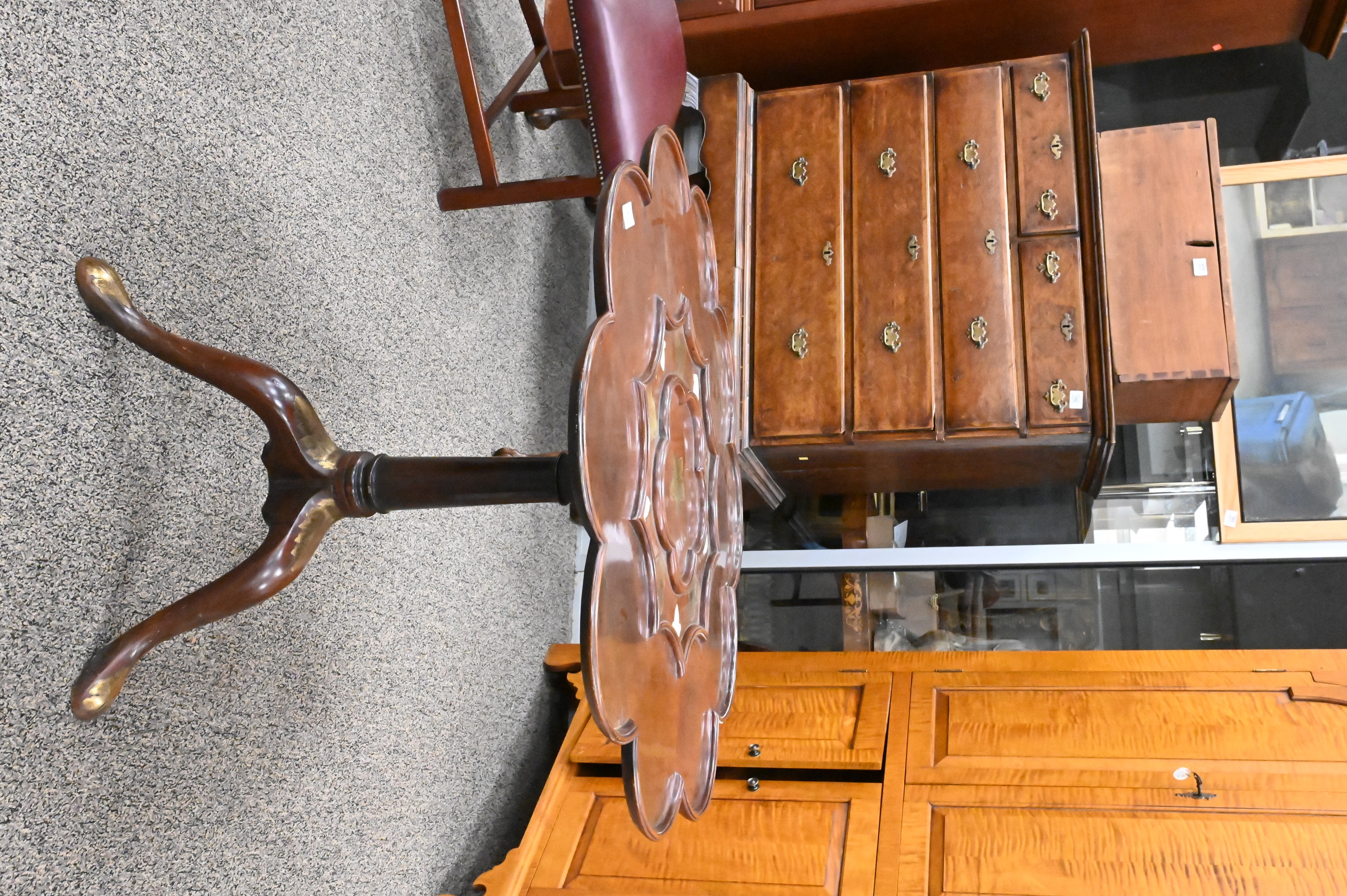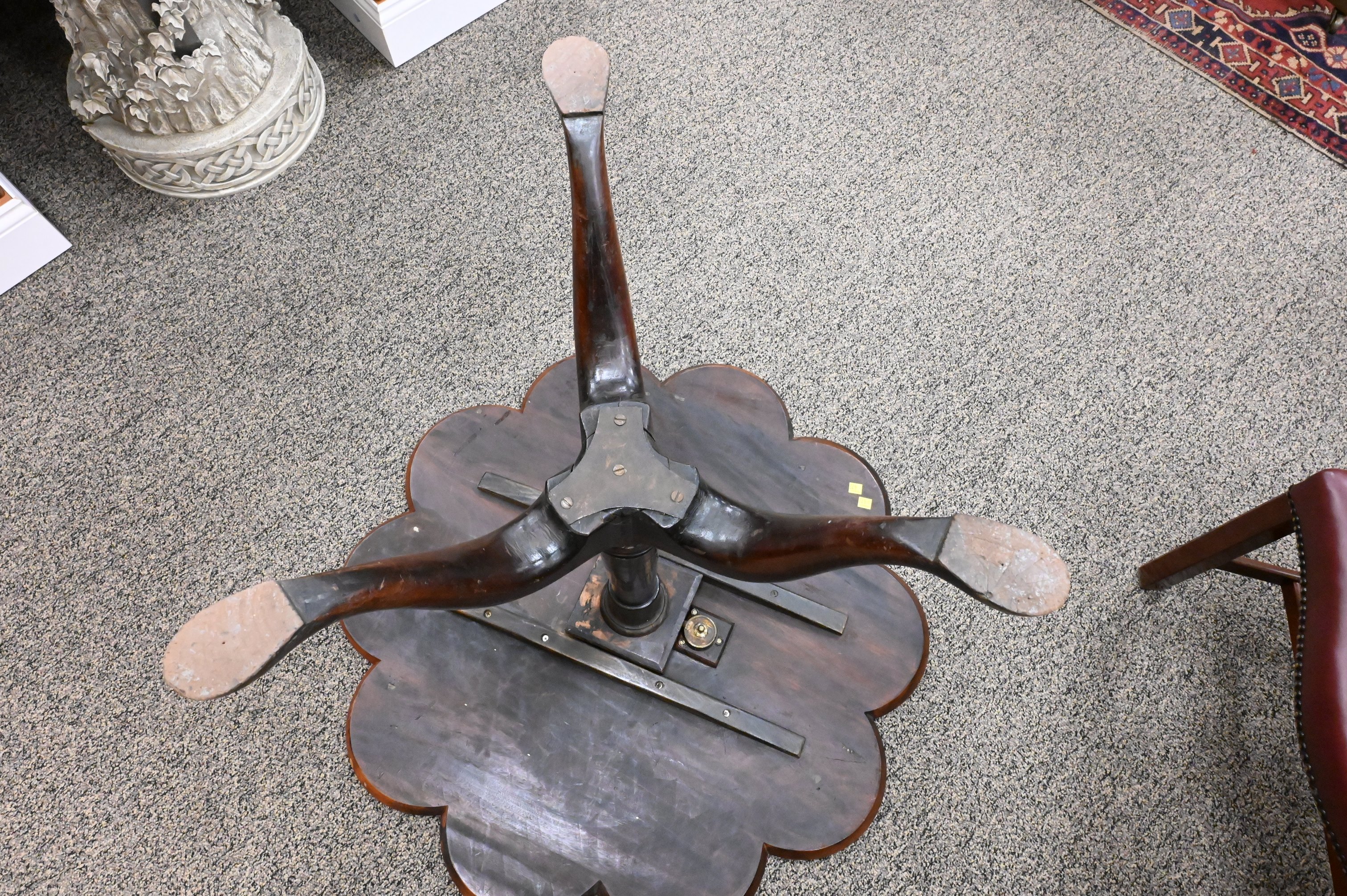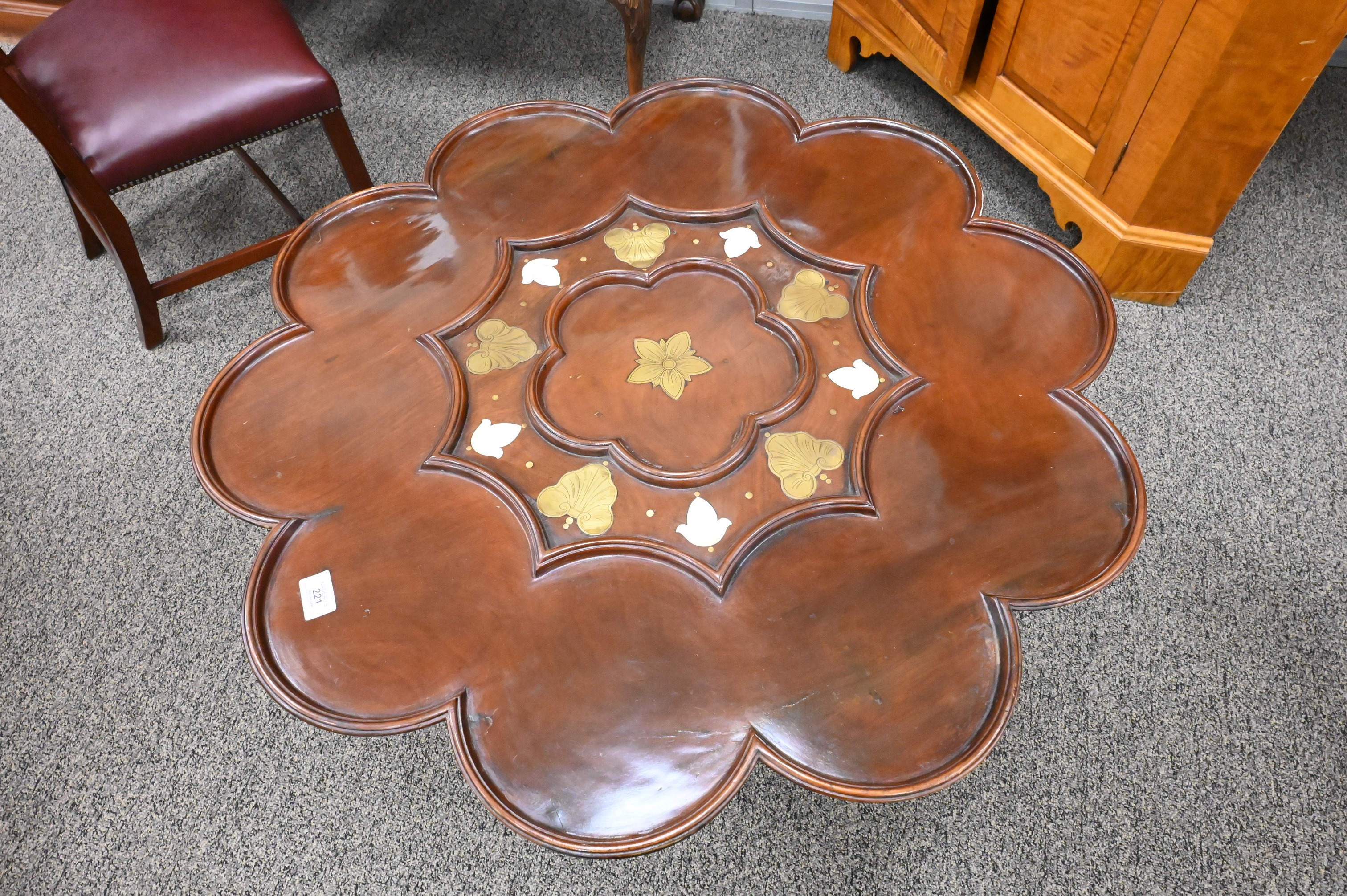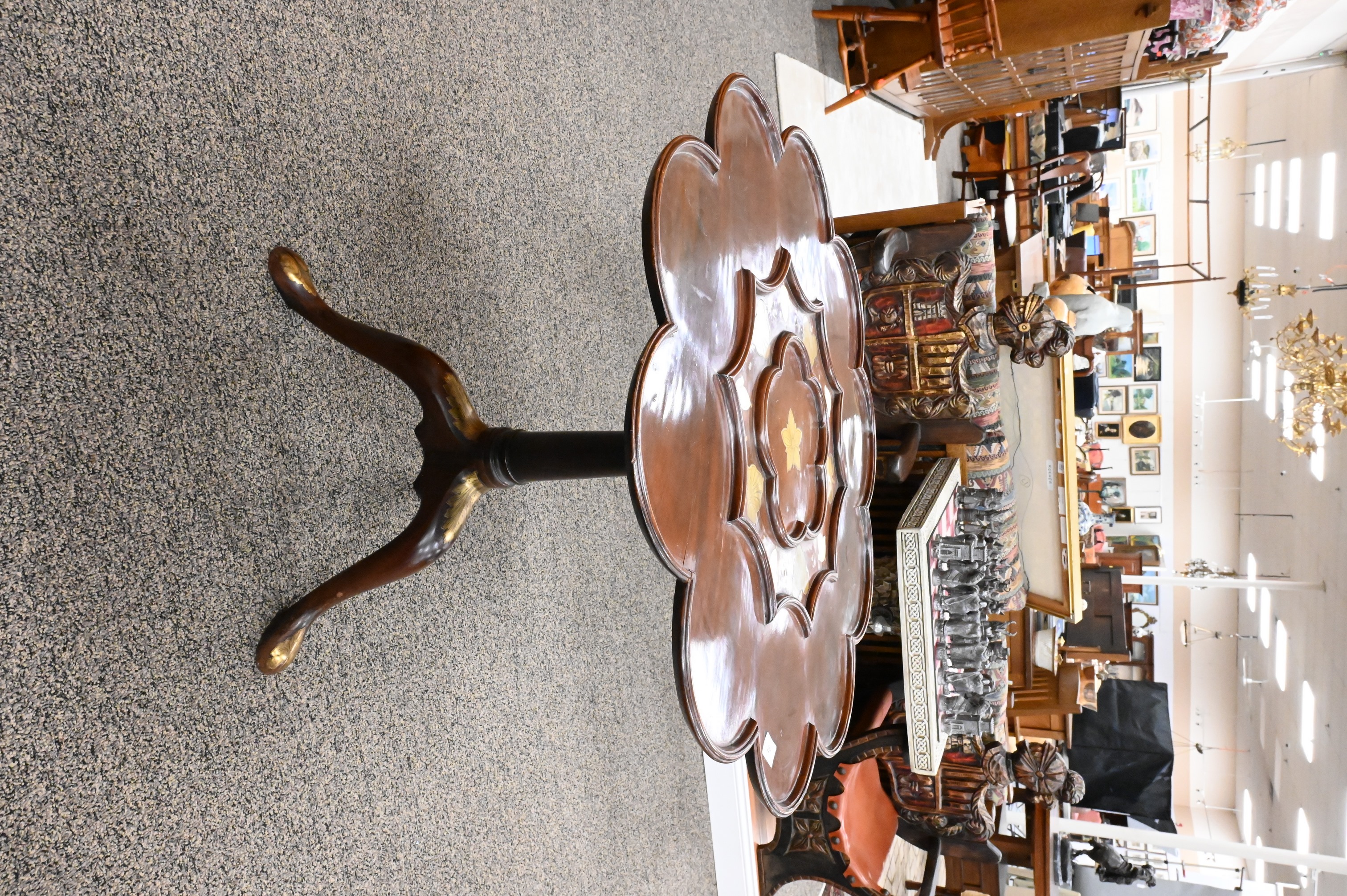 having molded shaped edge and sections with brass inlays on pedestal ending in tripod base, mounted with brass knees and feet
