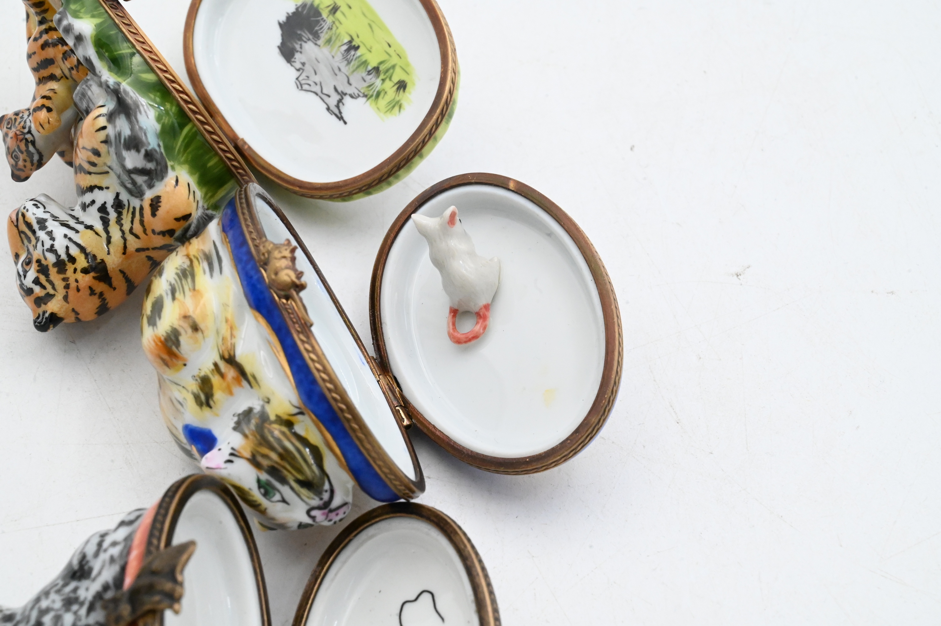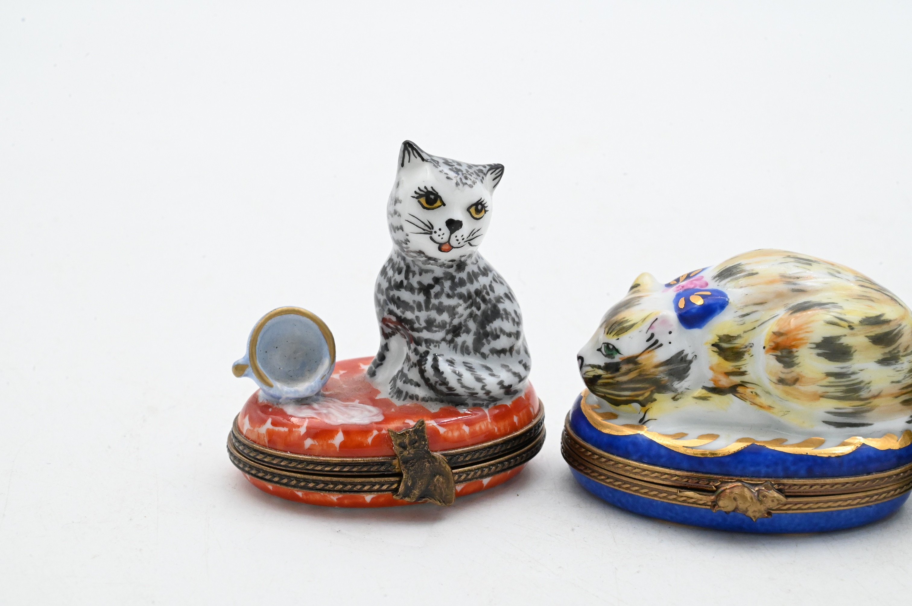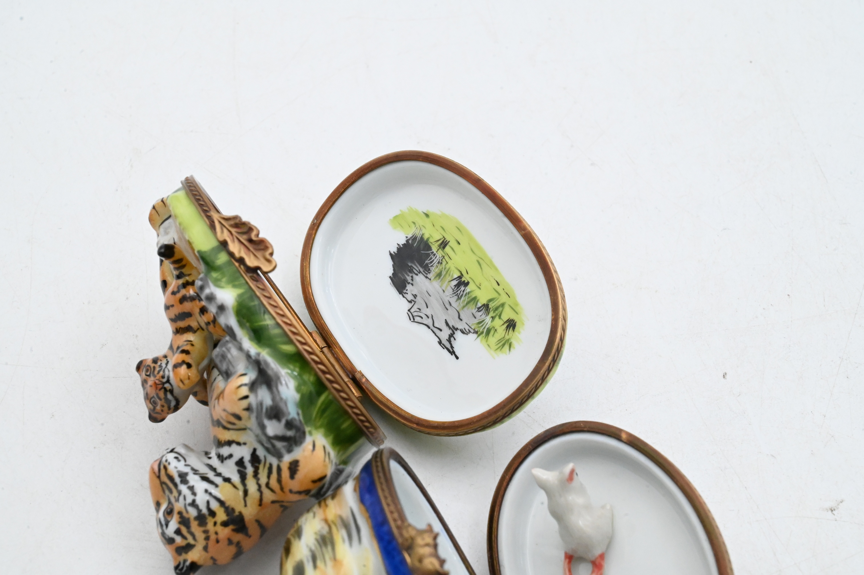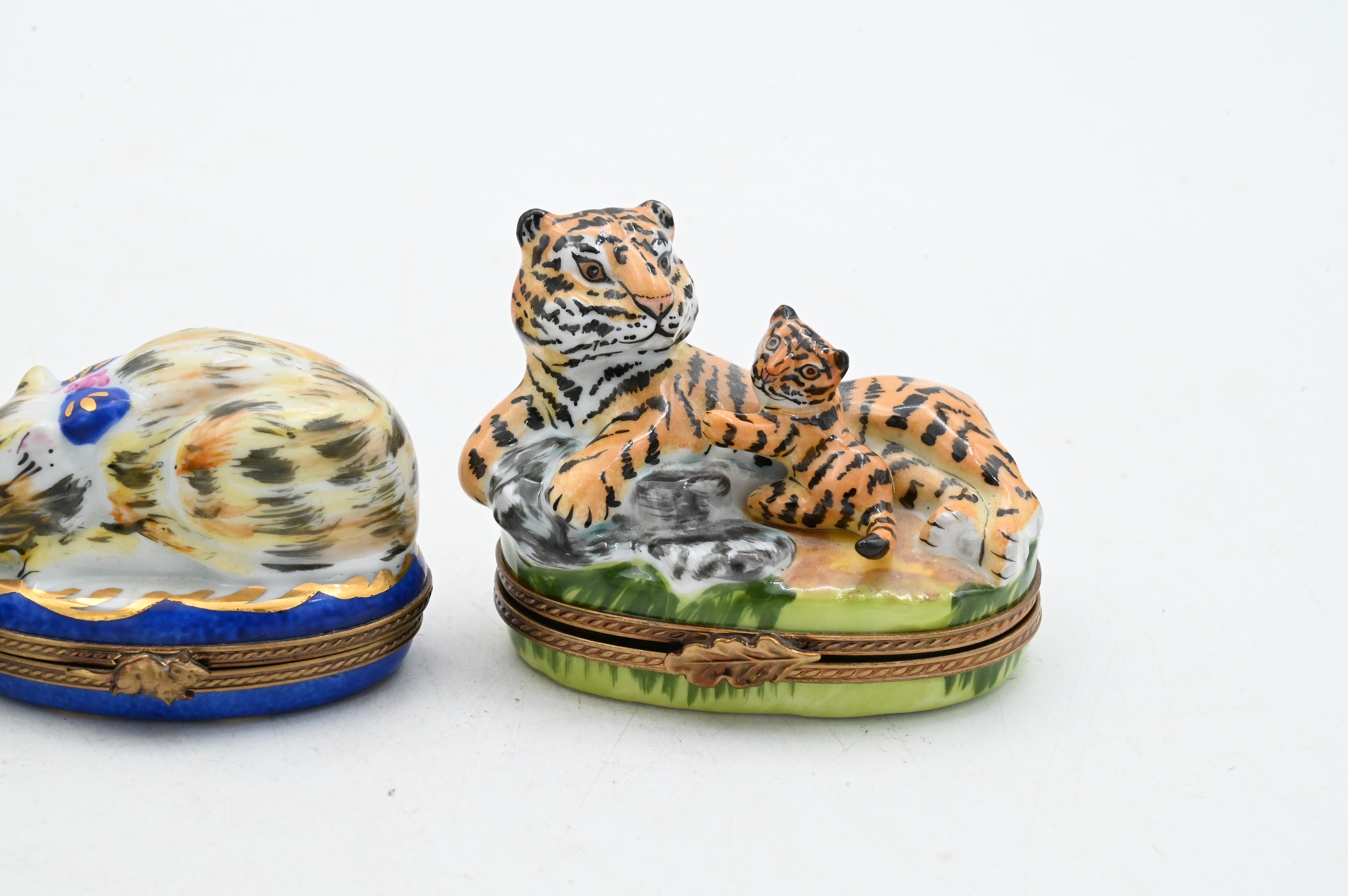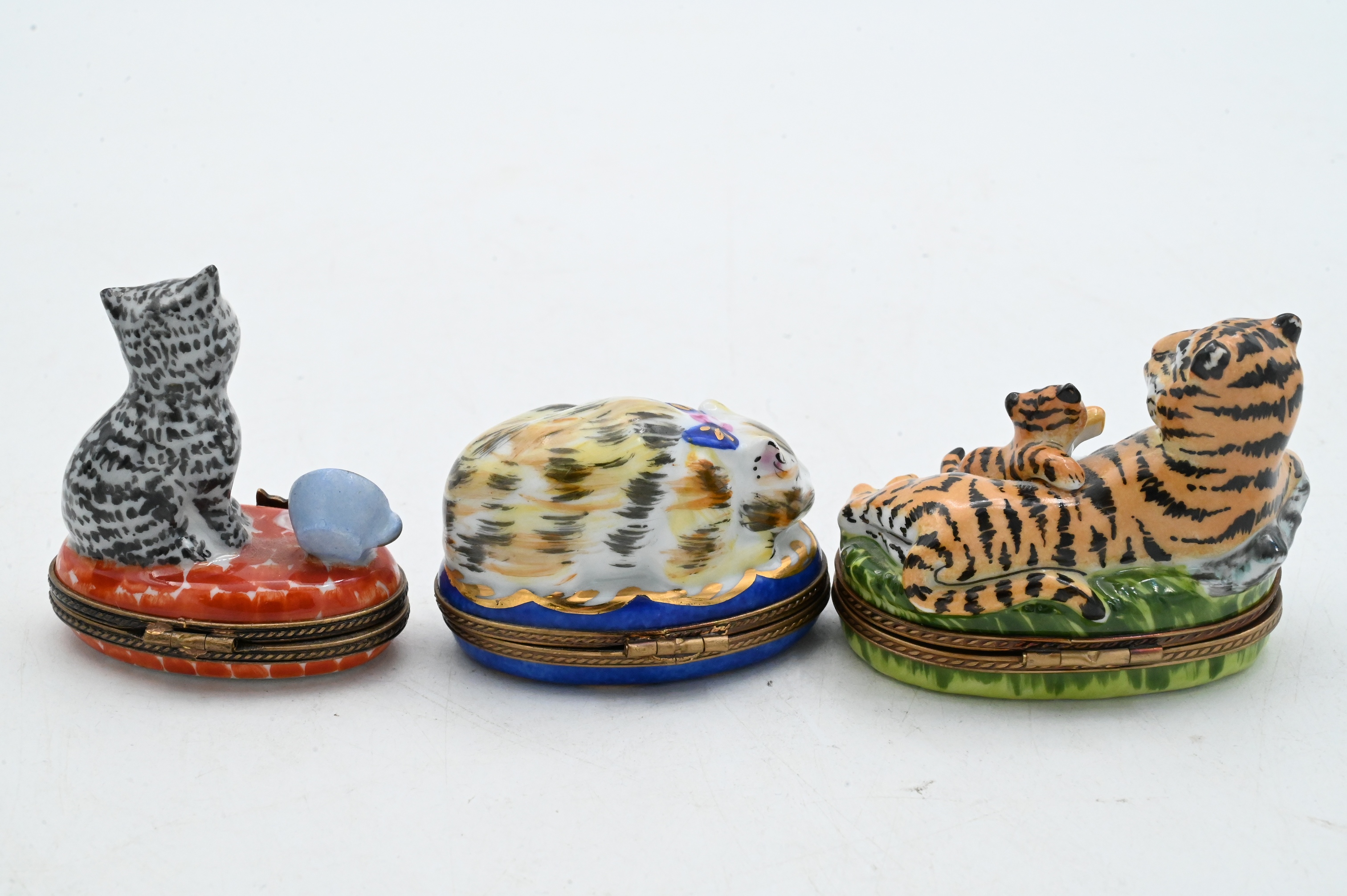 Including a sleeping cat with interior mouse, a seated cat with mirror, and a tiger with cub, each marked Peint Main Limoges France, one signed Rochard.