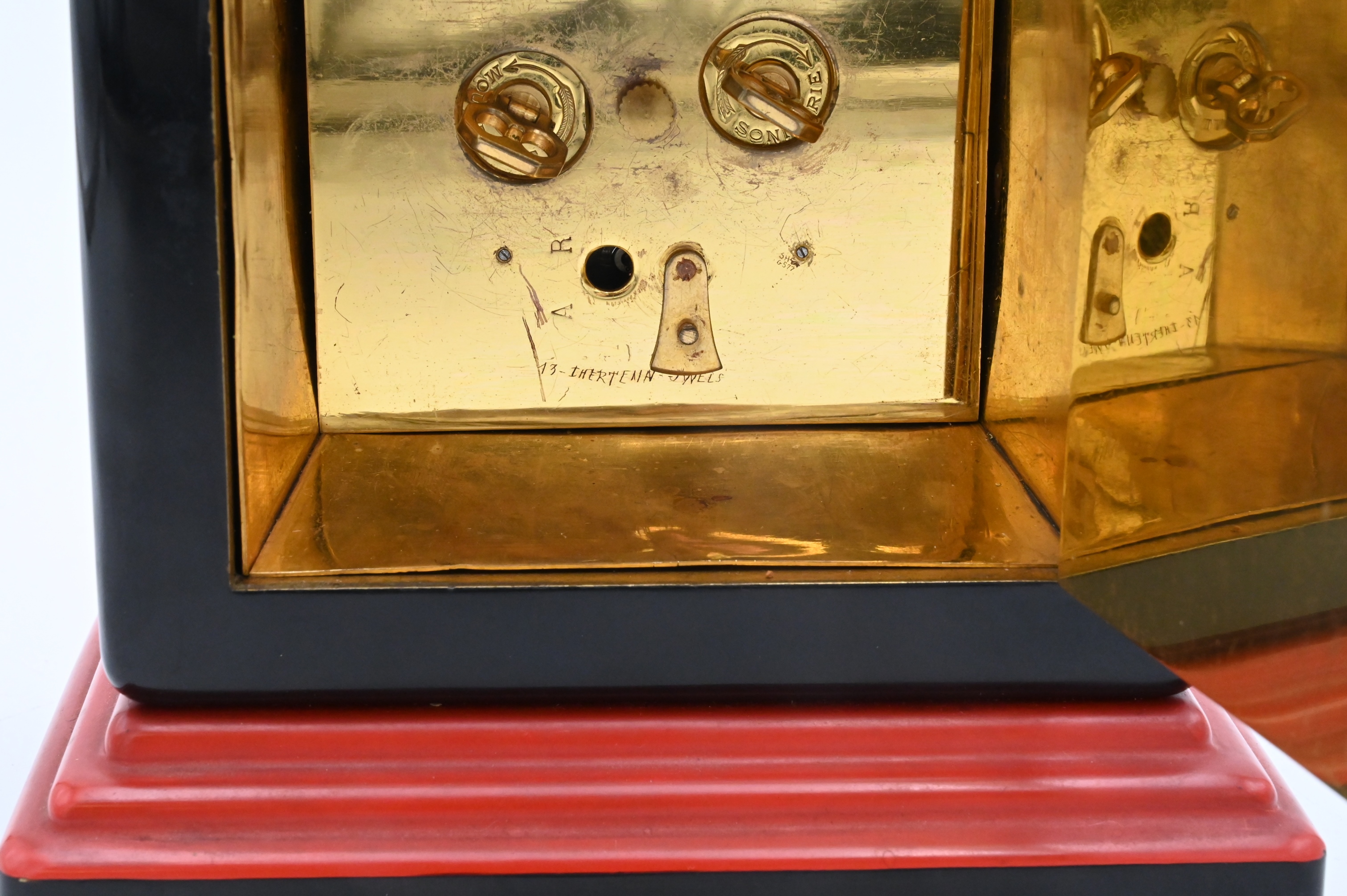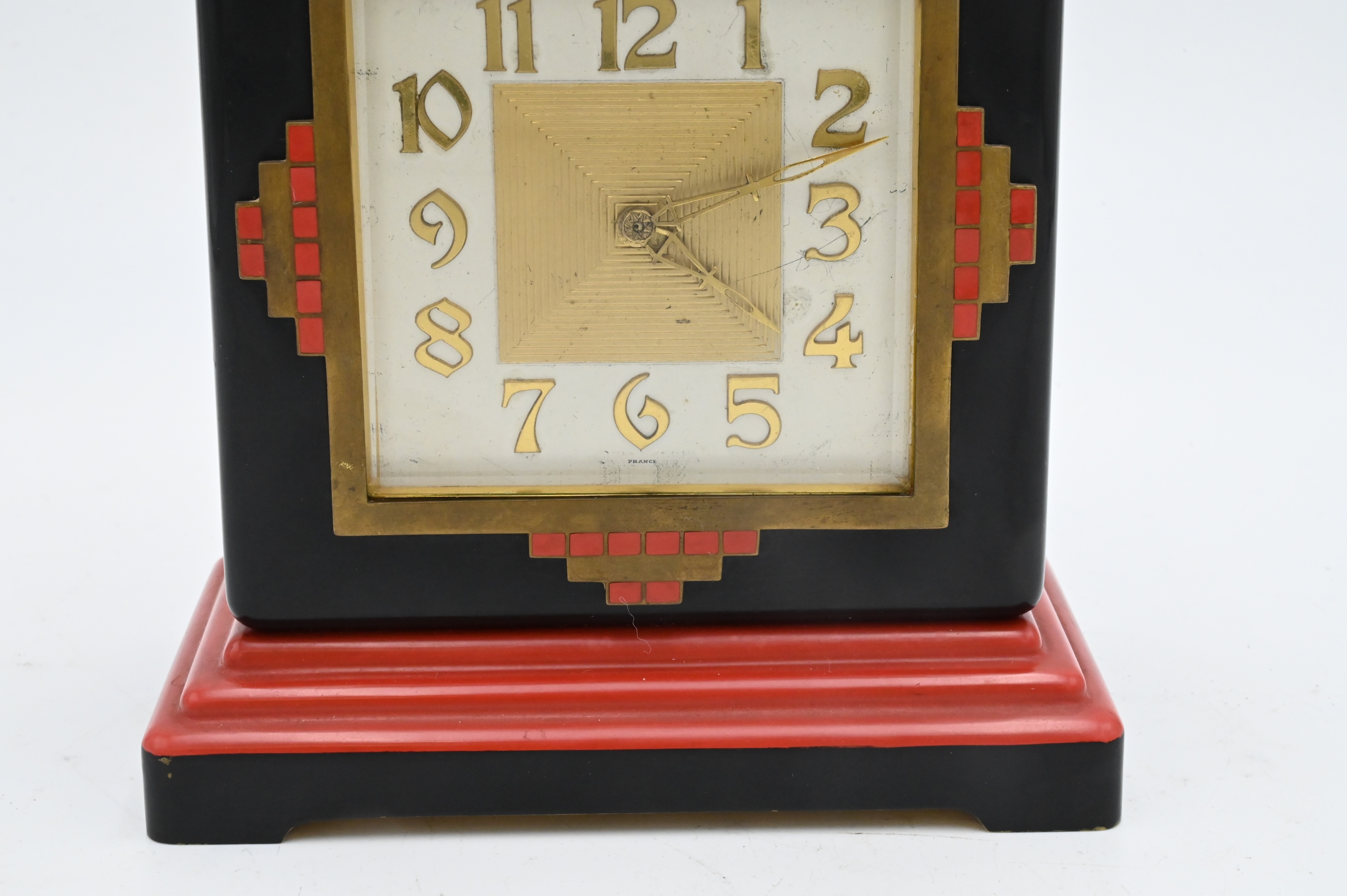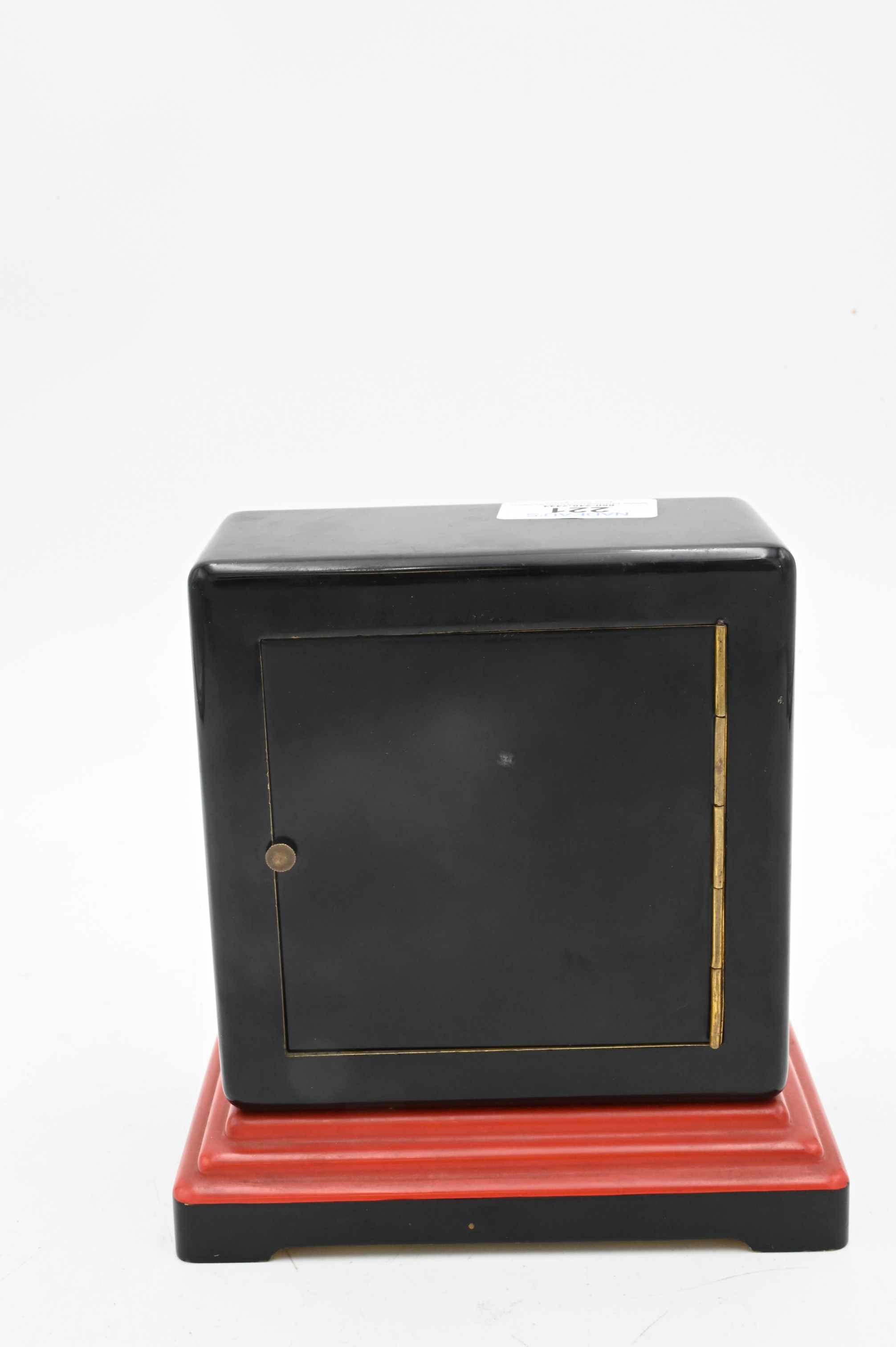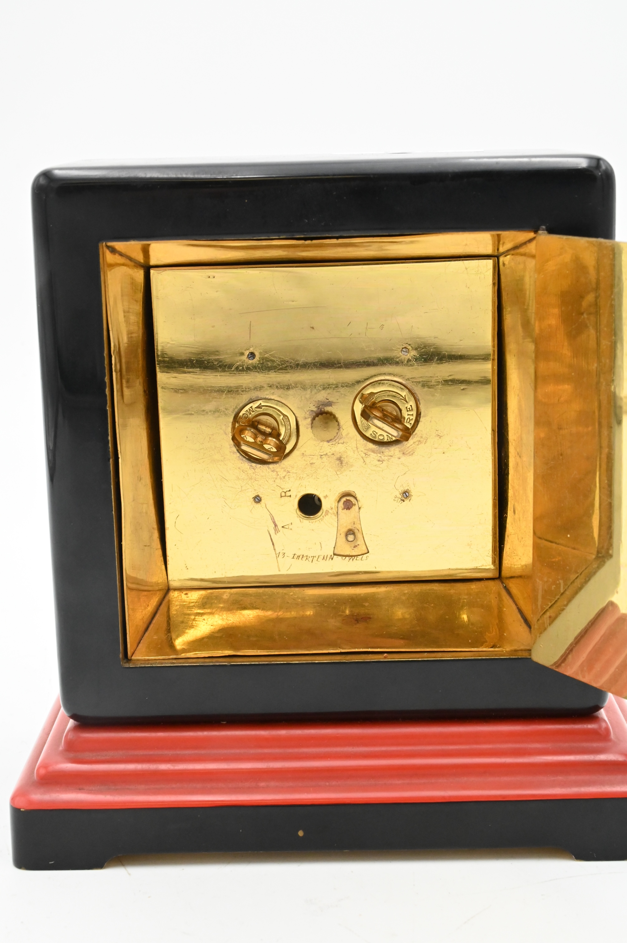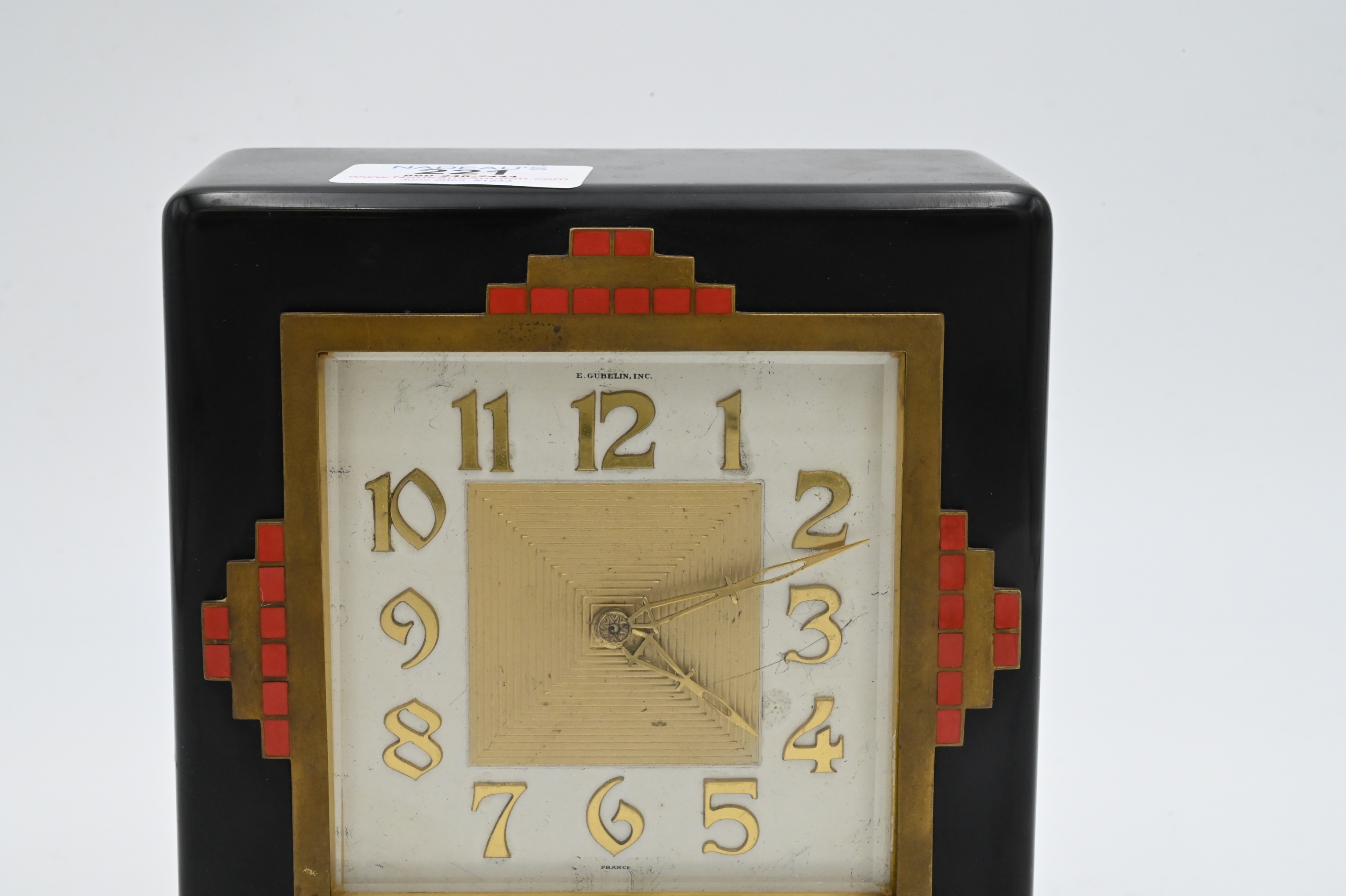 Gubelin ArtDeco Chime Clock, square in black cafe with red and brass decoration on a stepped red and black foot, face signed “E. Gubelin France”, height 6 3/4 inches