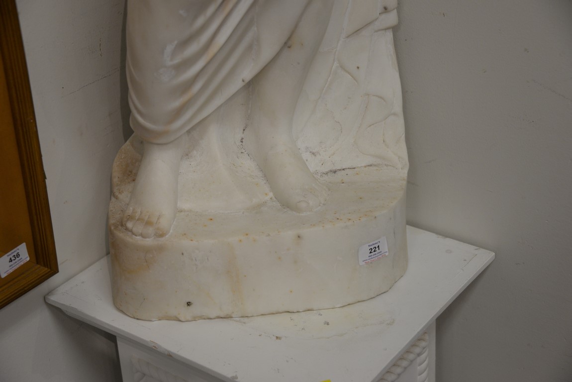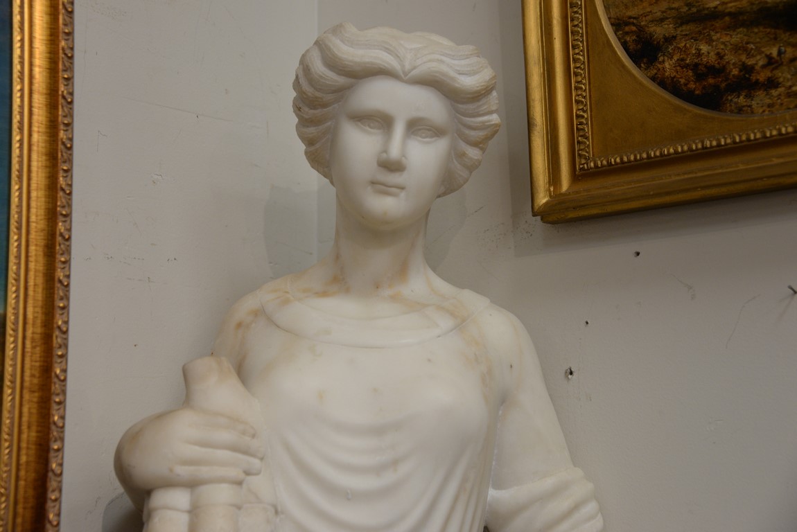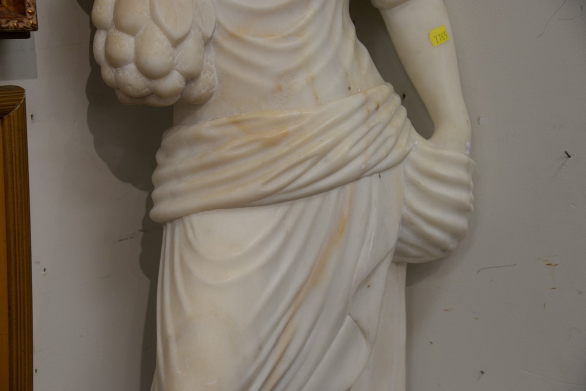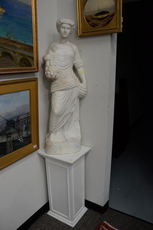 Marble sculpture of woman with grapes along with a wood pedestal. ht. of woman 48 in. total ht. 78 1/2in.