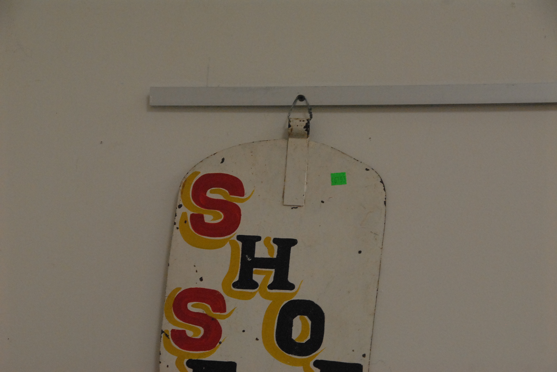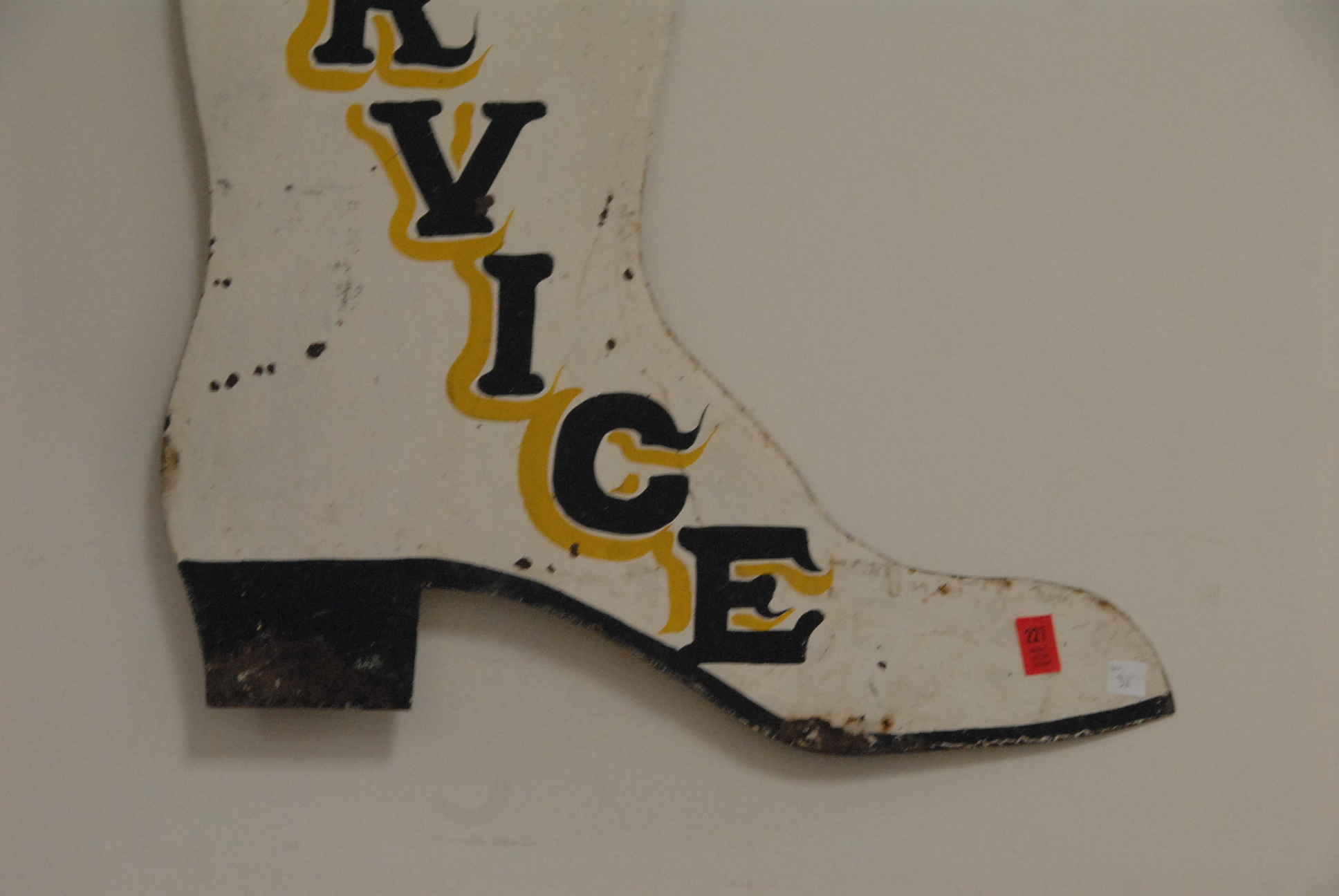 Old Shoe Service tin sign in the shape of a boot, ht. 32.