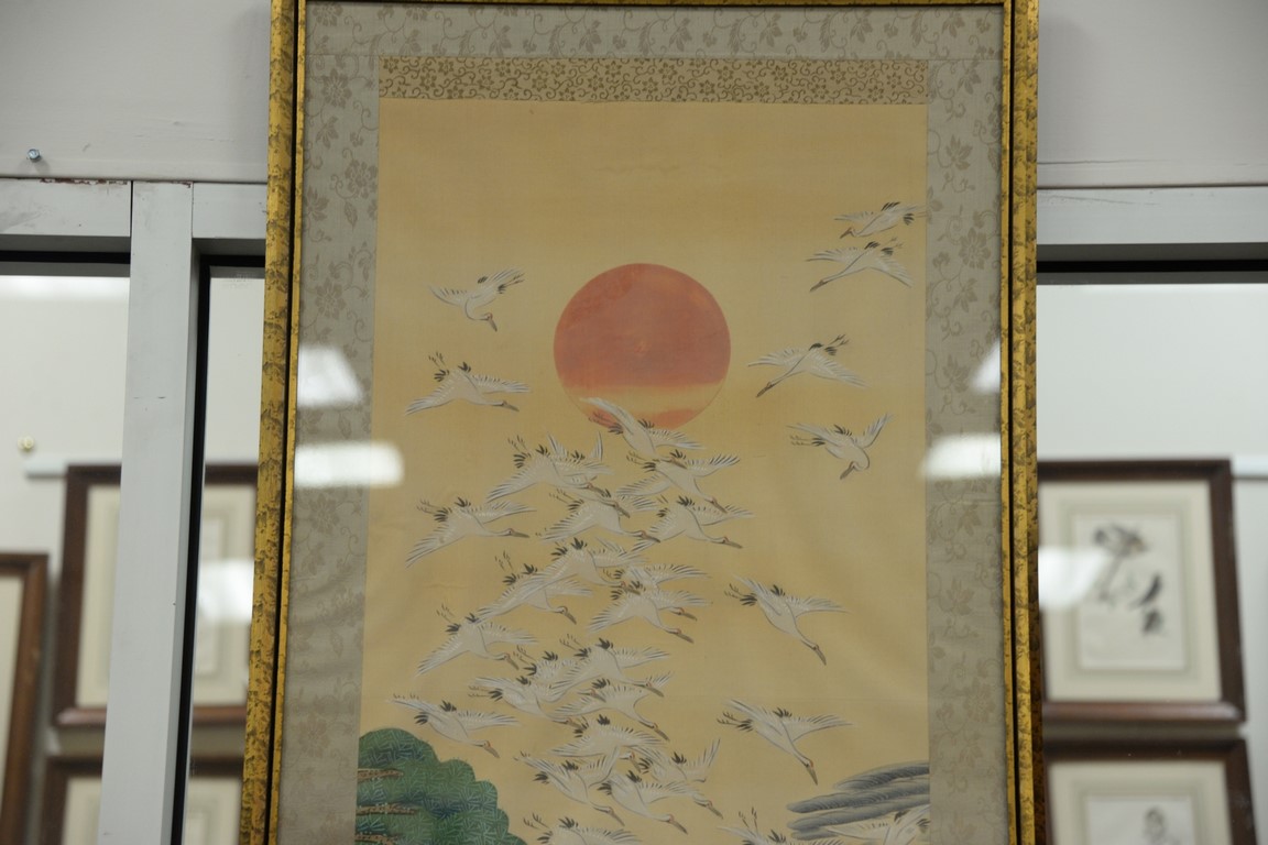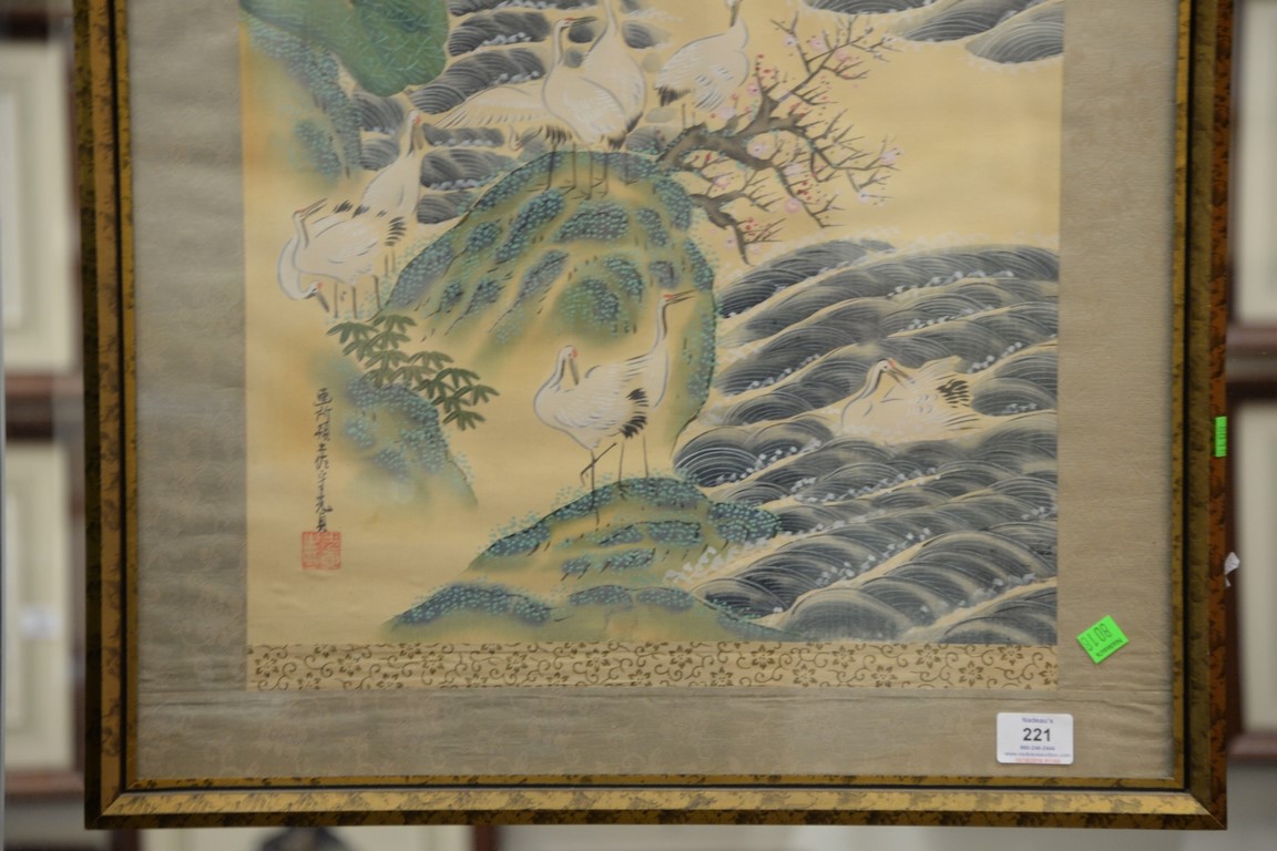 Lot 221: Oriental framed scroll, oil on silk of cranes flying in, signed and seal mark lower left. 44 x 16 1/2