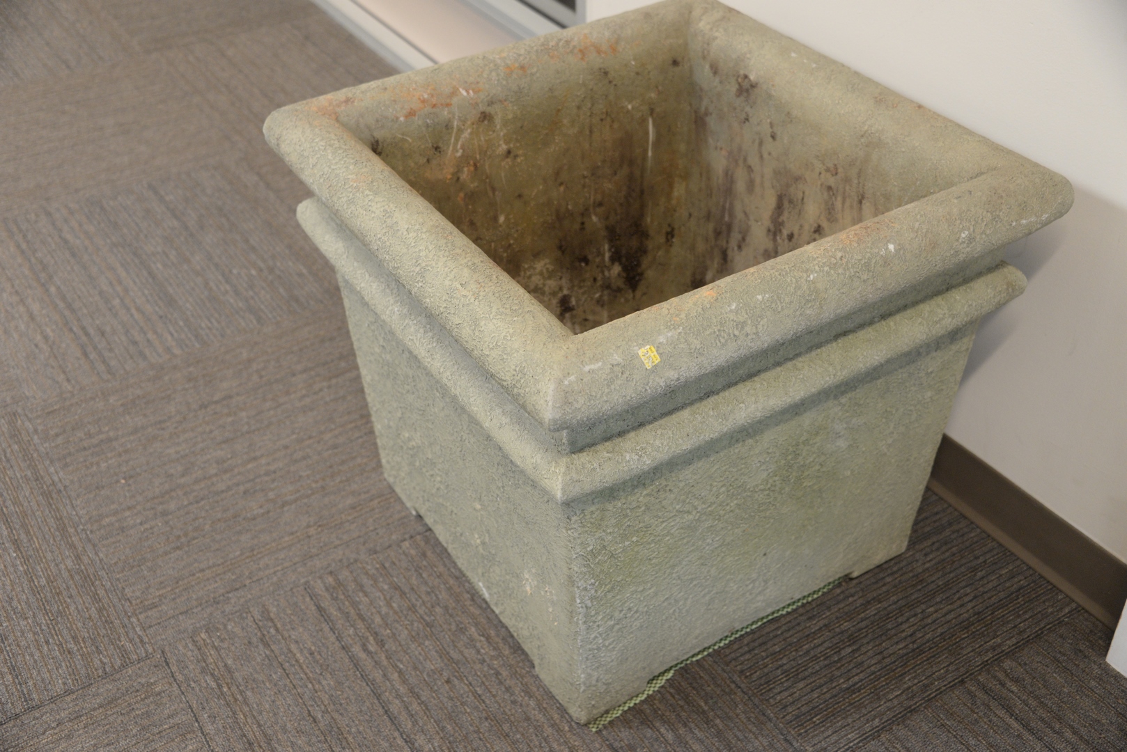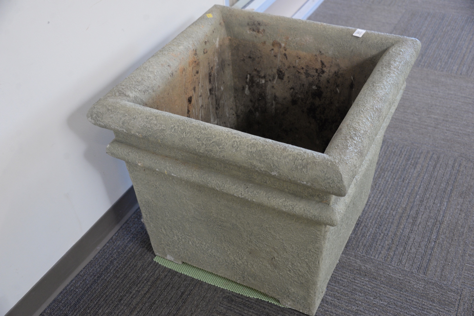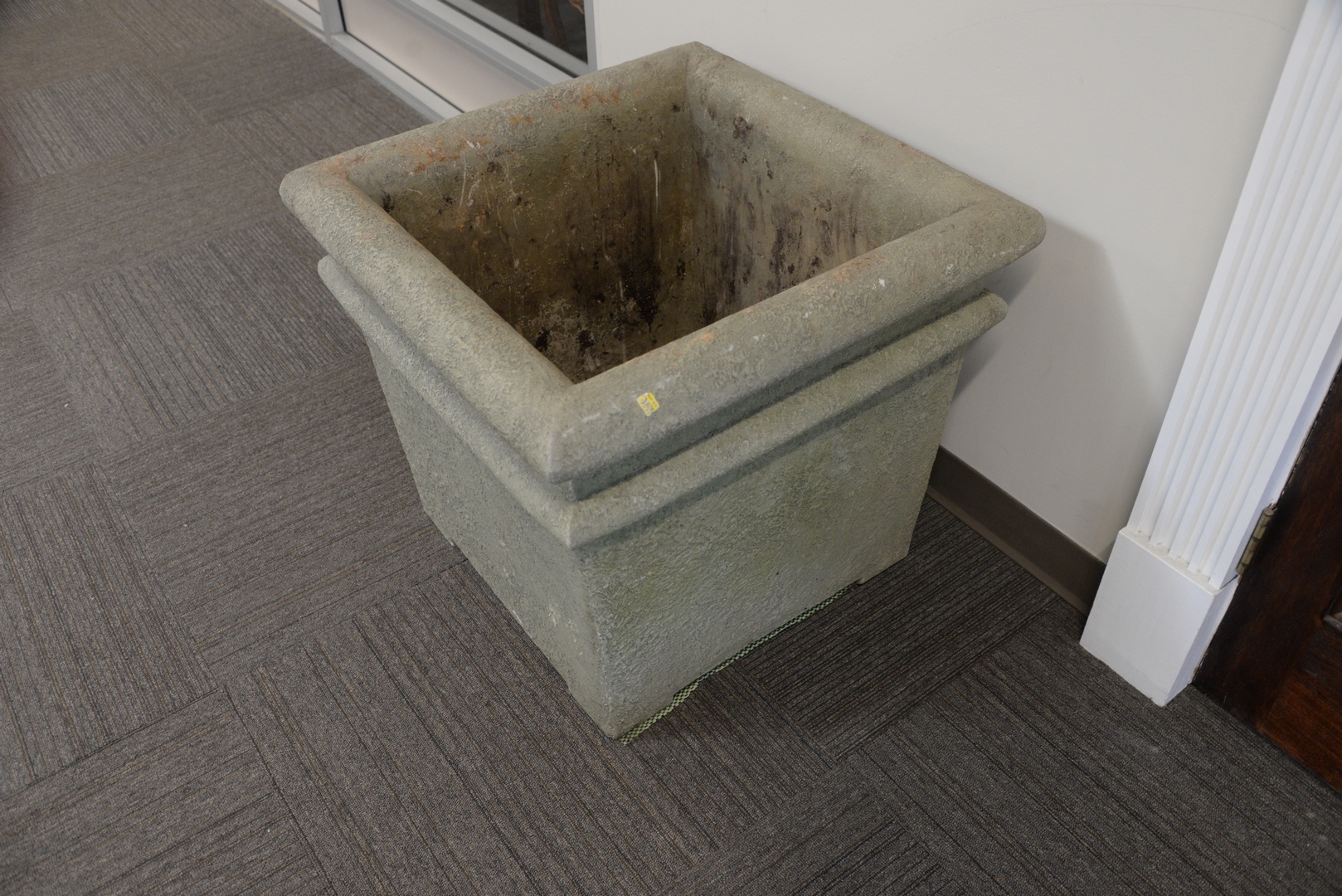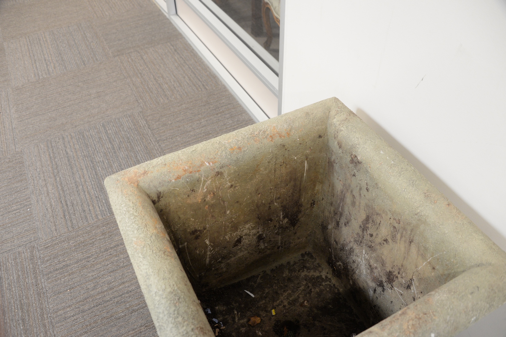 Pair of Oversized Square Cast Cement Outdoor Planters, height 24 inches, top 27″ x 27″.