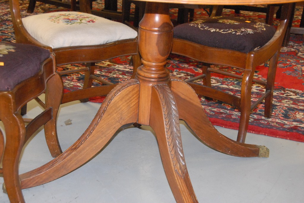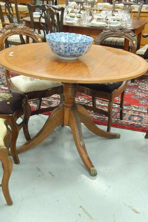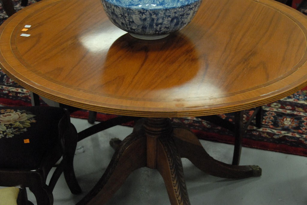 Round inlaid single pedestal table with inlaid top minor imperfections, dia. 45 1/2.