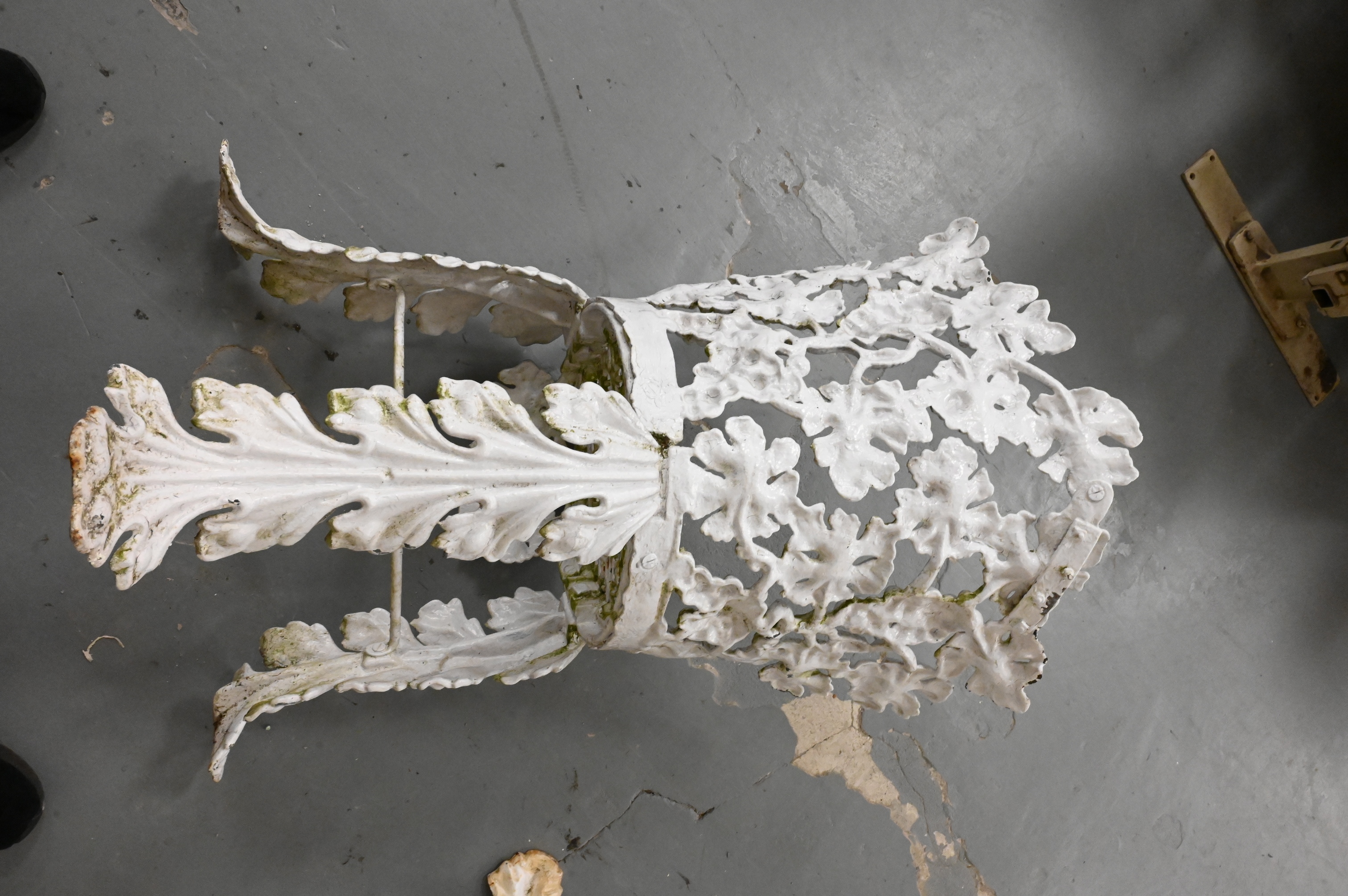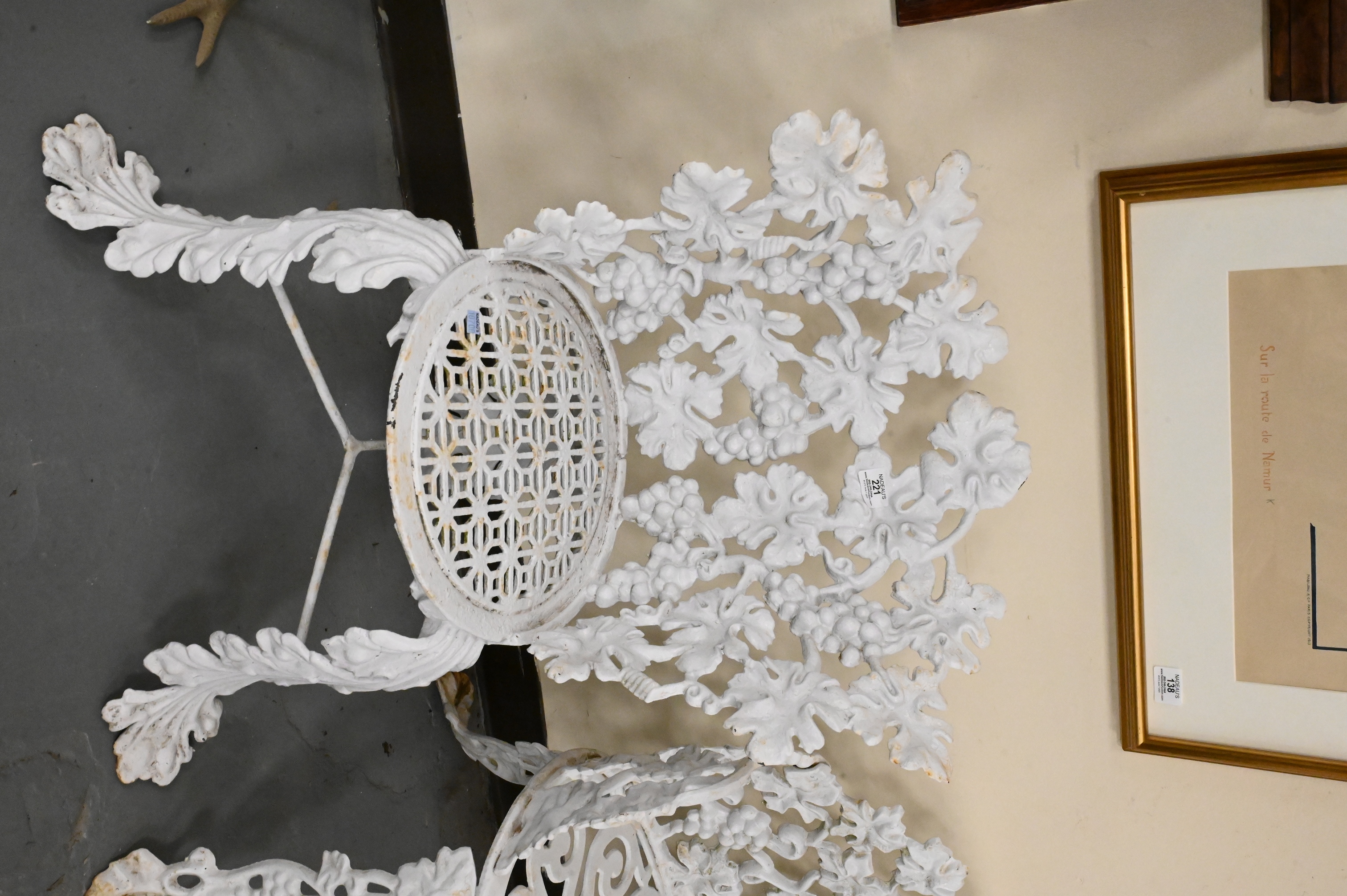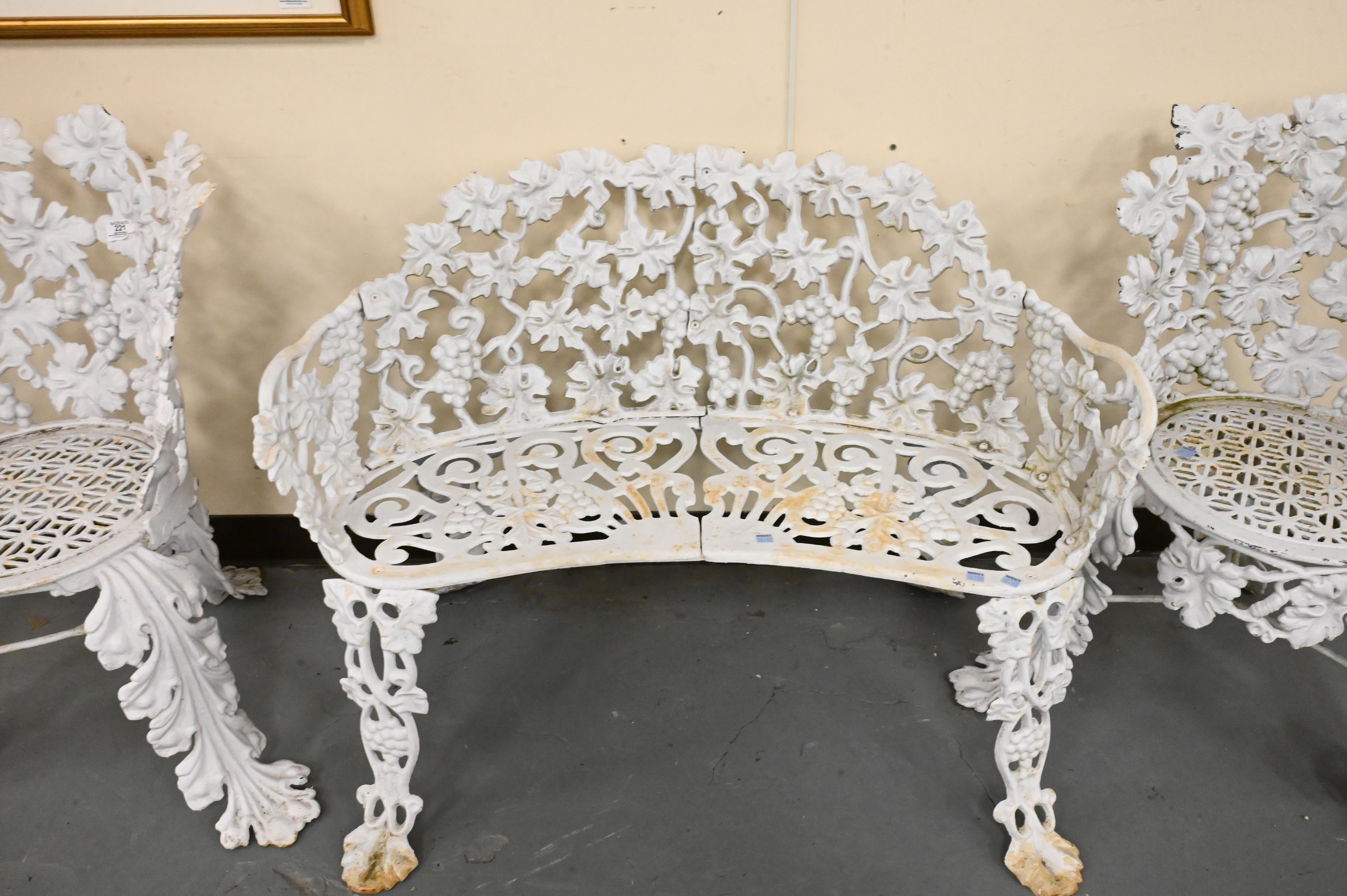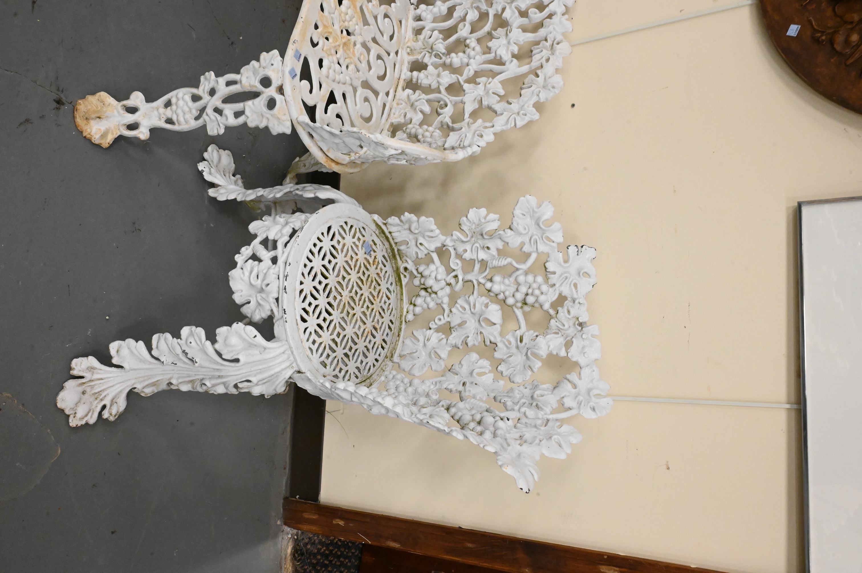 white painted bench and two chairs having grape vine motif