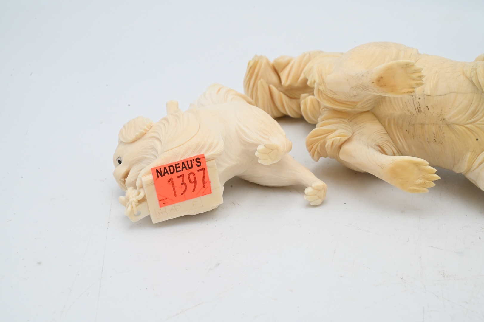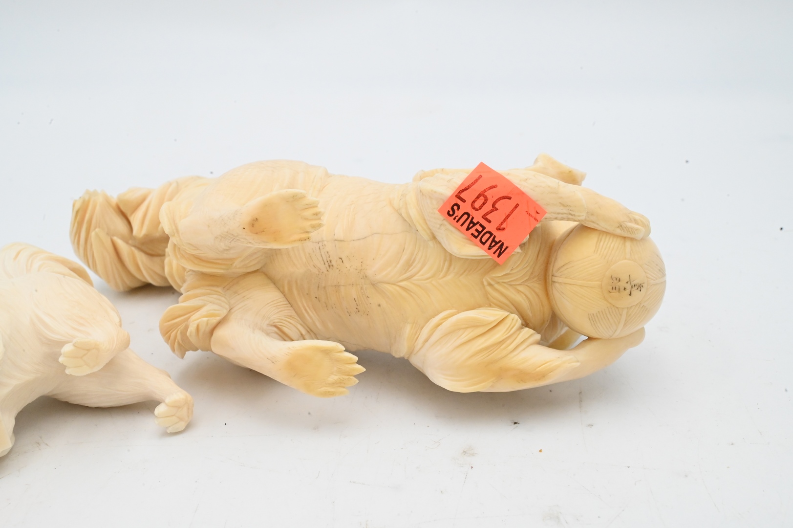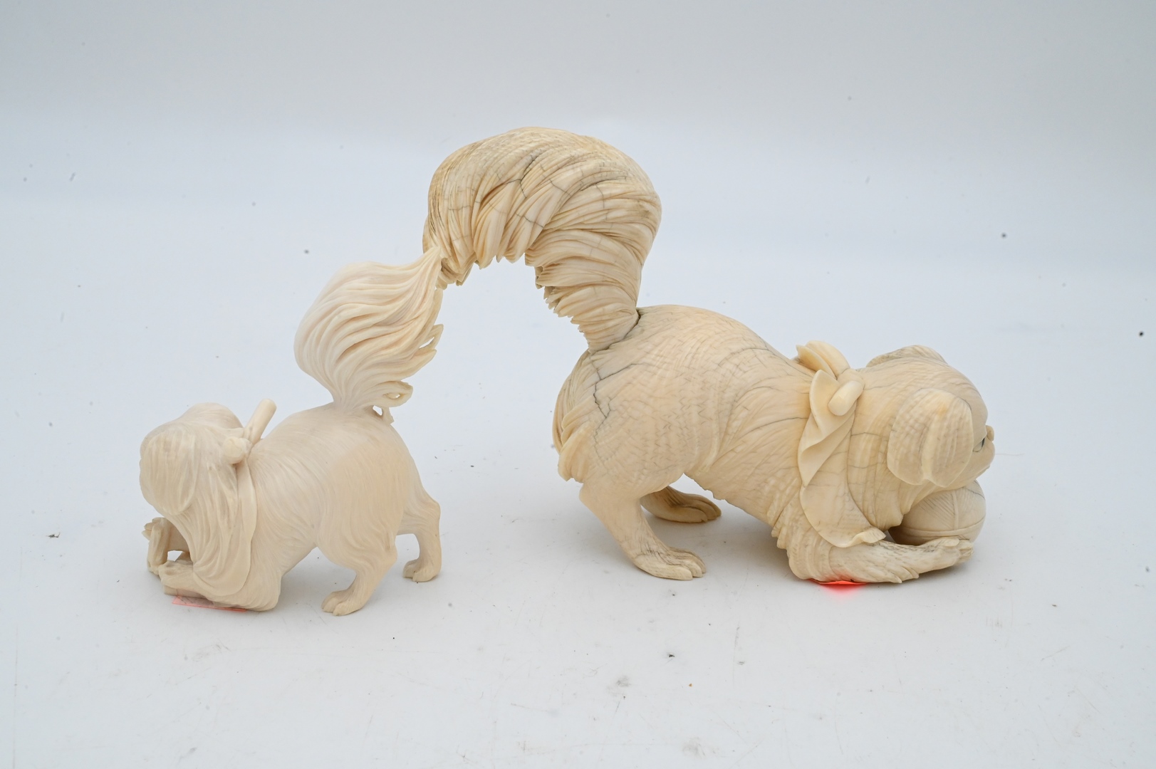 Two 19th Century Carved Pekingese Figures, pouncing on a bookmark, Japan 1890 with raised tail, open mouth showing teeth, inlaid eyes, height 4 3/4 inches. Provenance: Orientation Gallery, New York, reference S1127, 6/27/95, signed on bottom; along with a 19th century Pekingese with a ball, 6 3/4″ x 5″.