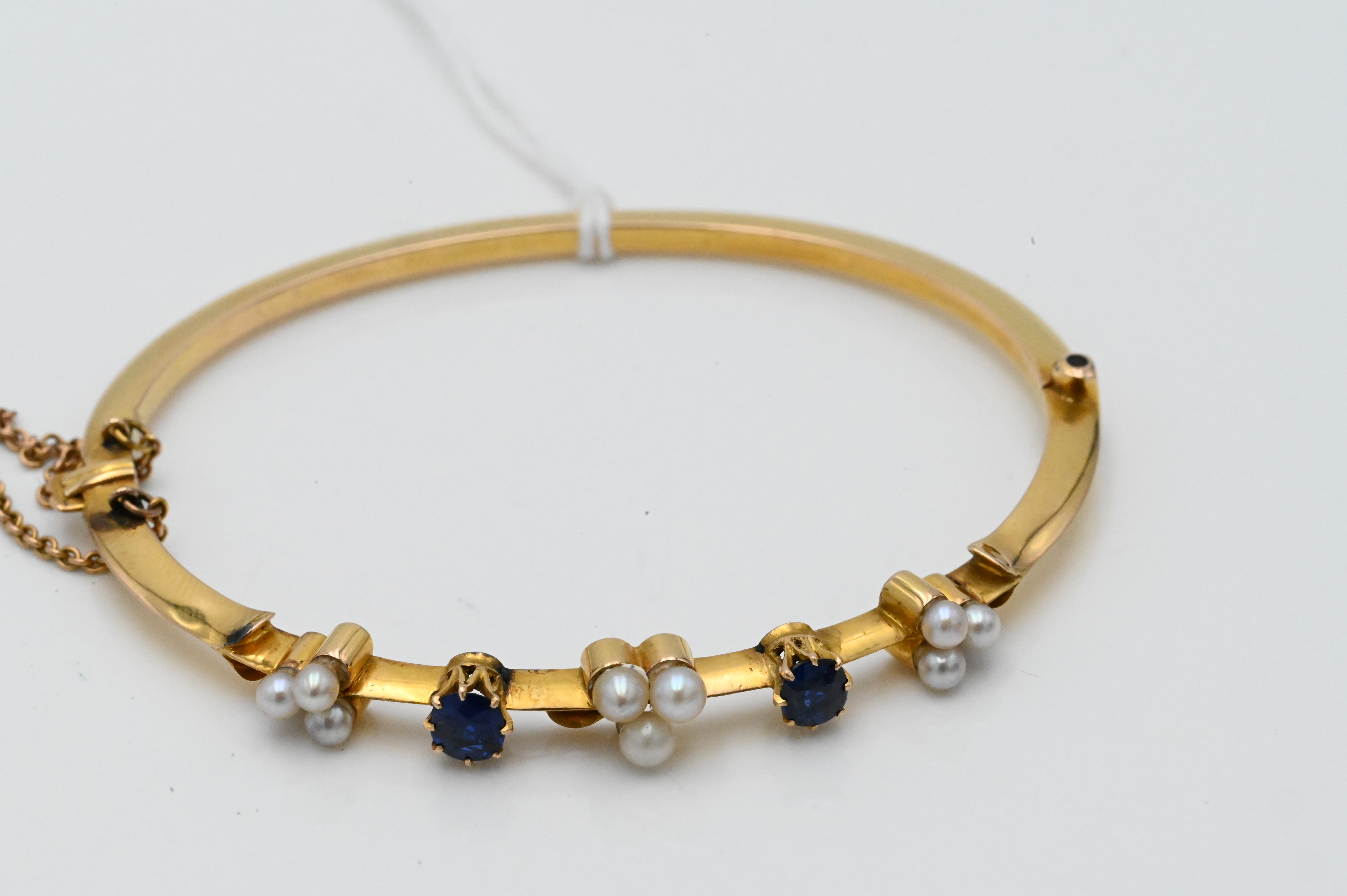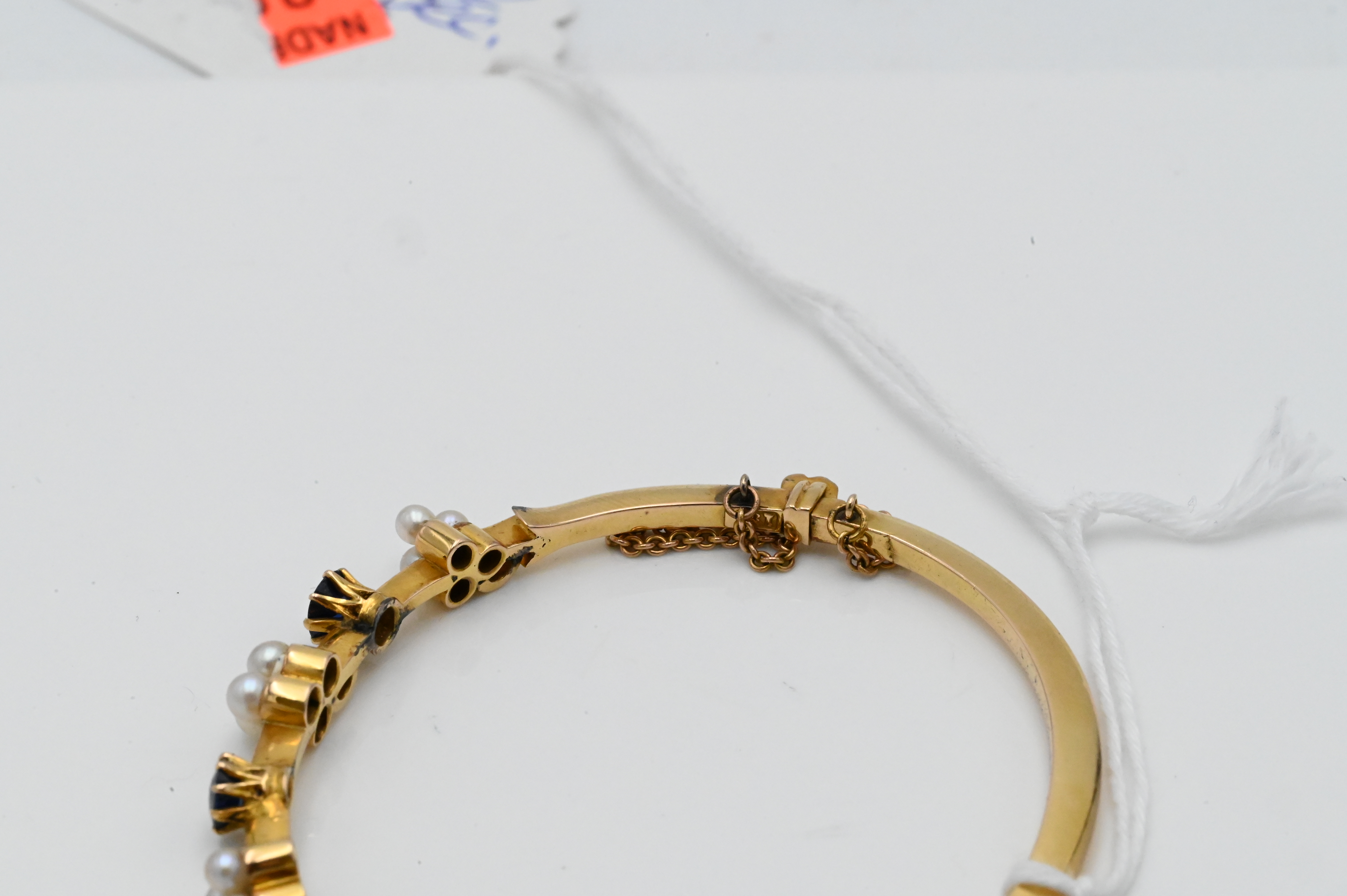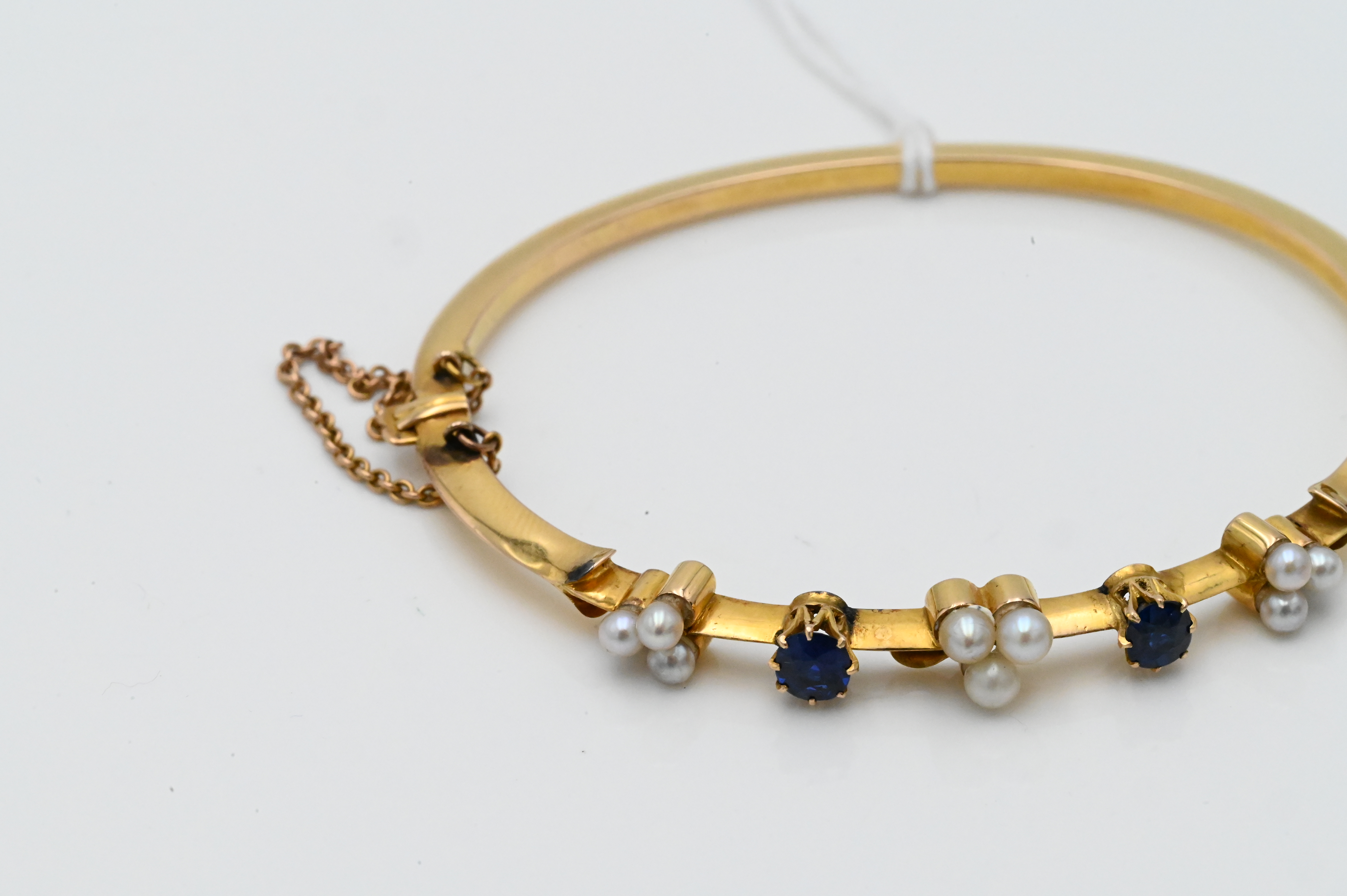15 Karat Yellow Gold English Bangle Bracelet, set with pearls, along with two sapphires, in original box, Connard & Sons Goldsmith’s, Southport, 9.4 grams.