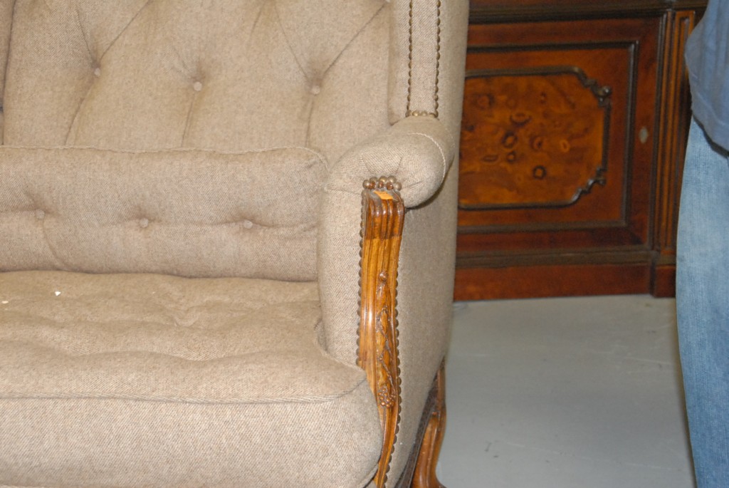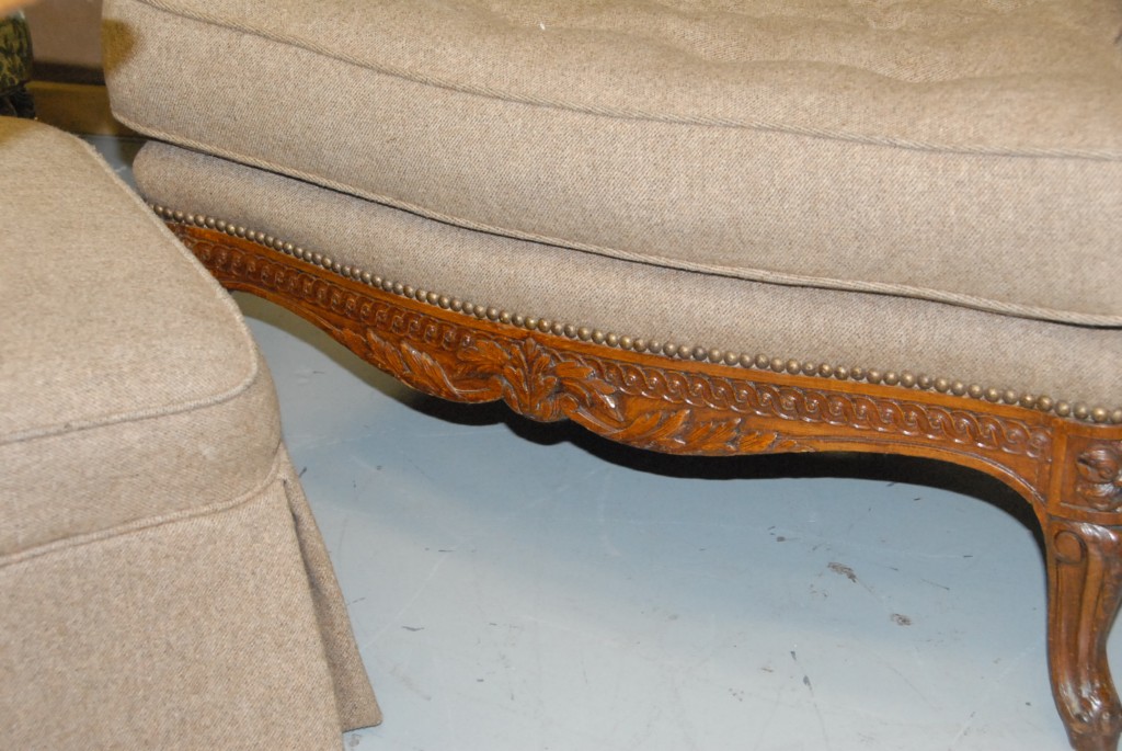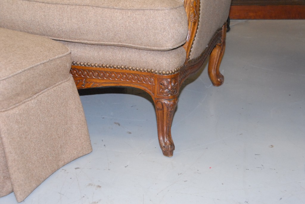 Carved oak Continental style easy chair and ottoman in clean upholstery.
