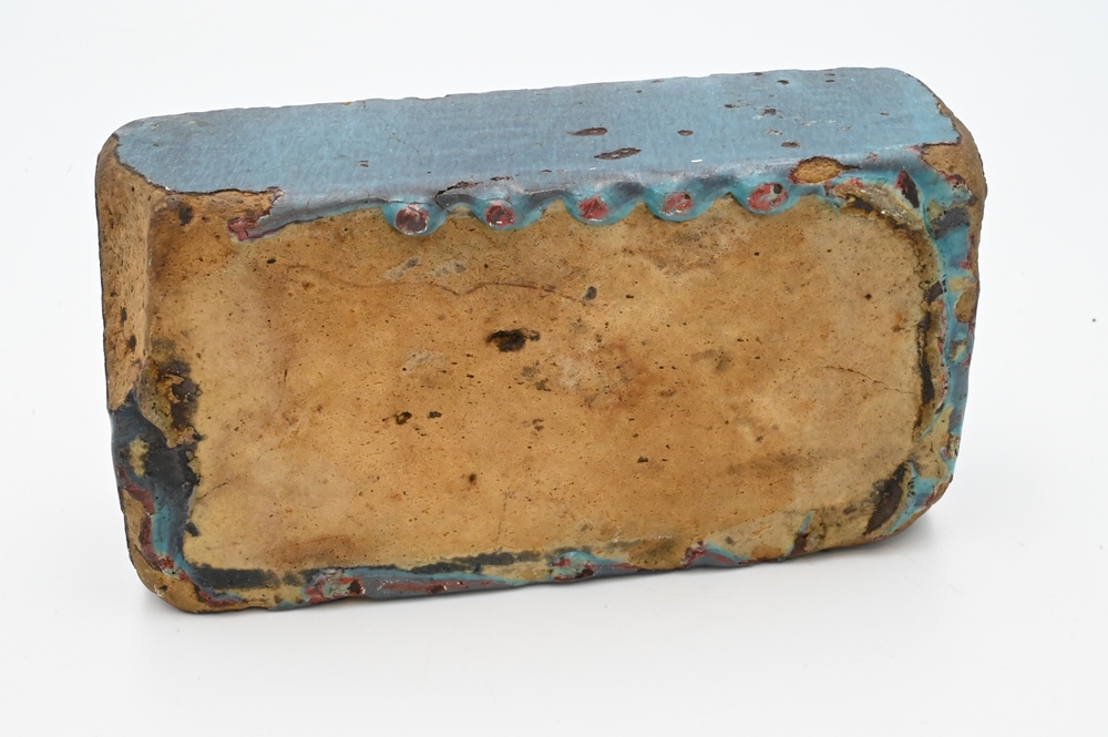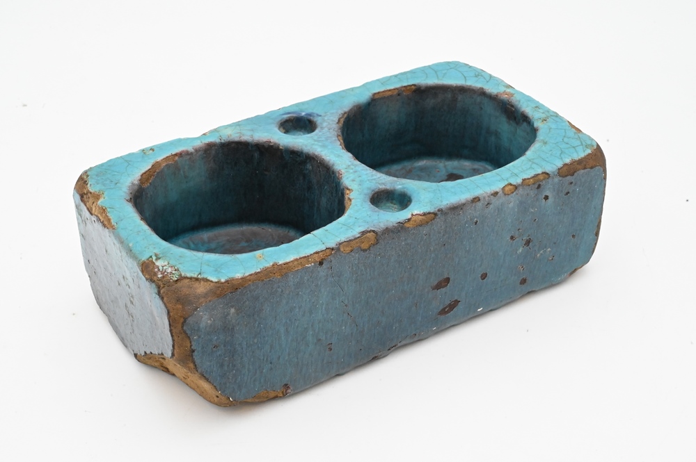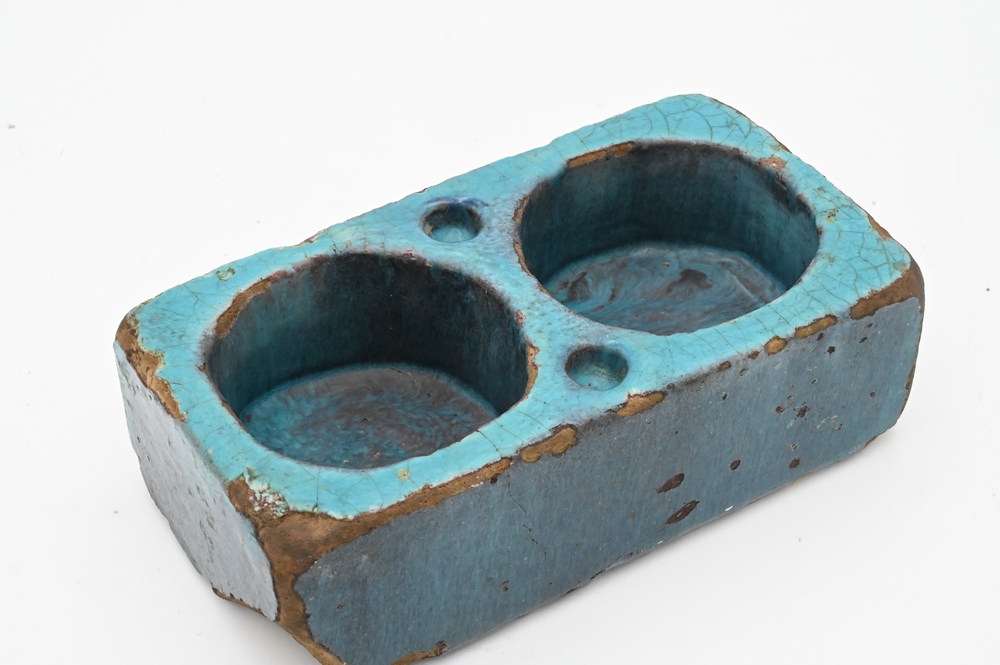 Lot 222: Chinese Stoneware Double Container, Ming Dynasty (or older), possibly a brush washer, the rectangular shape covered with a jun yao-like glaze, length 8 1/2 inches.