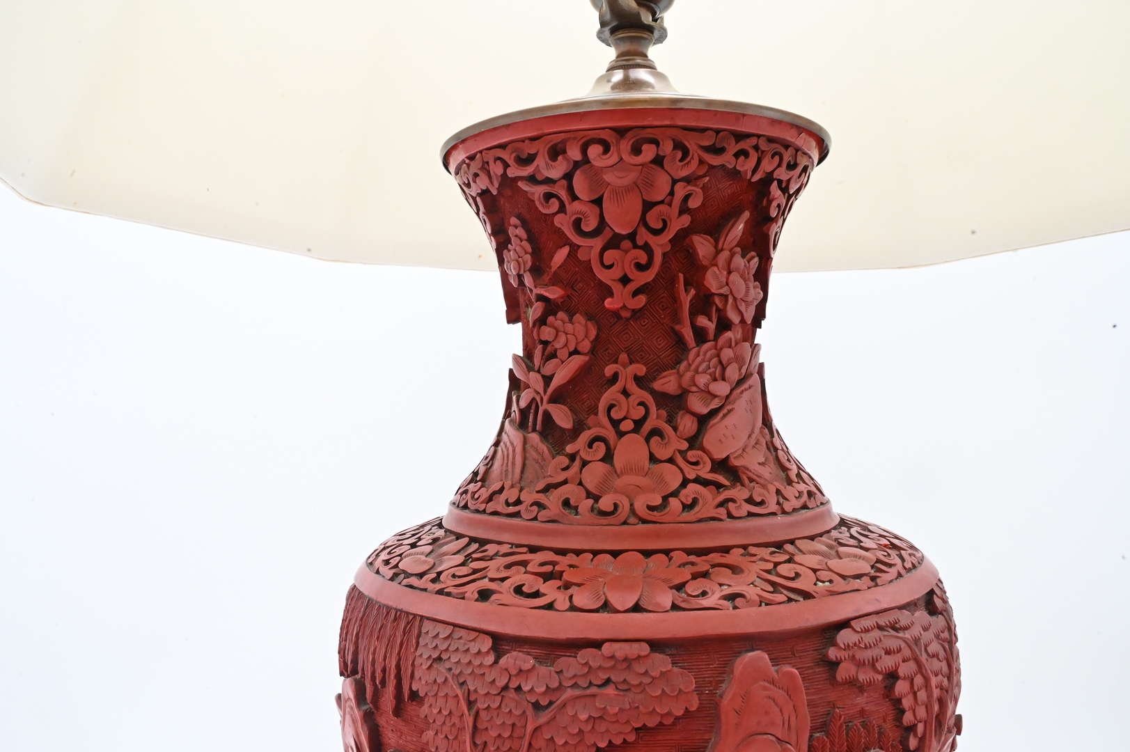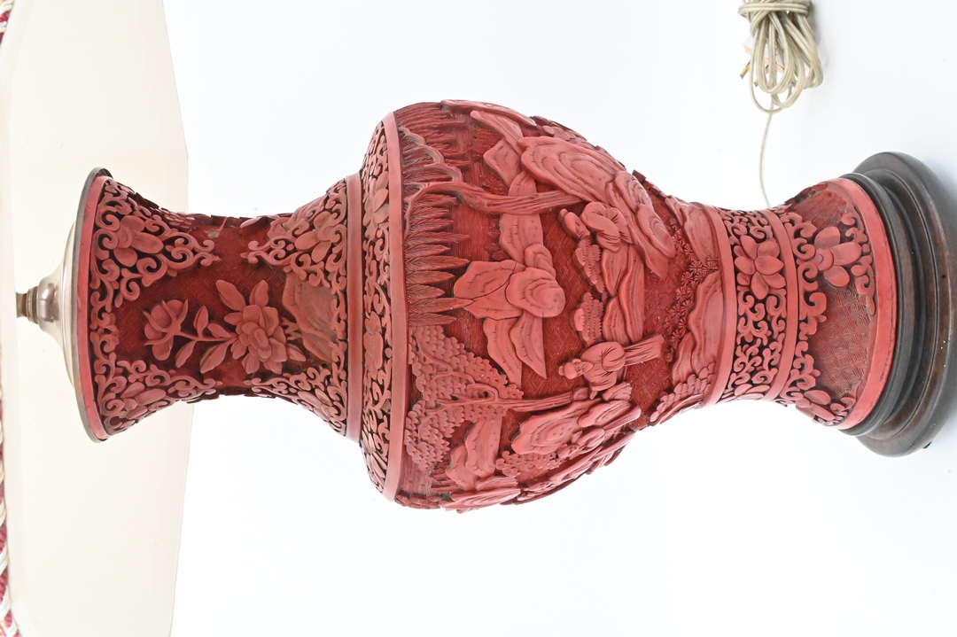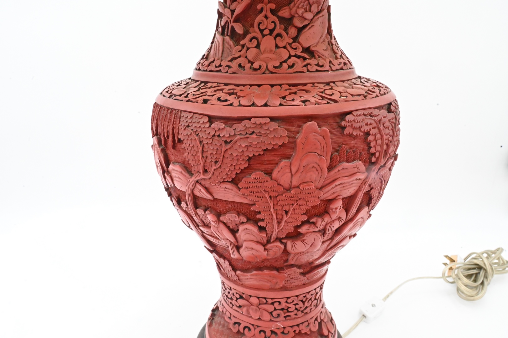 Cinnabar Lacquer Vase, made into a table lamp, mountainous scene, vase height 15 inches, total height 29 inches, one small chip.