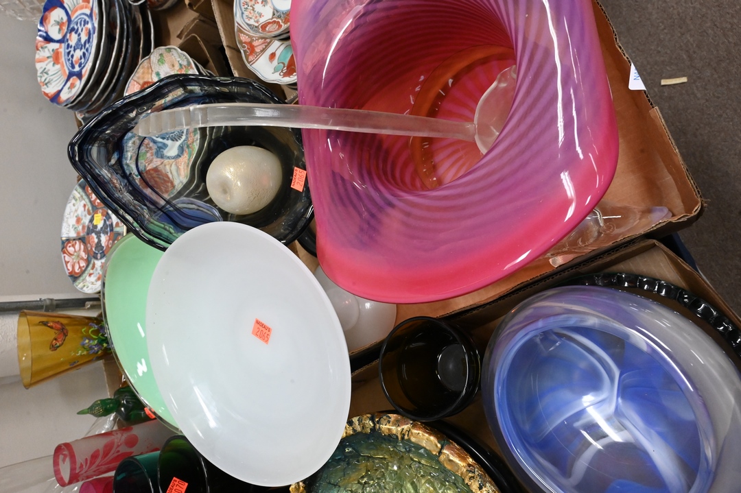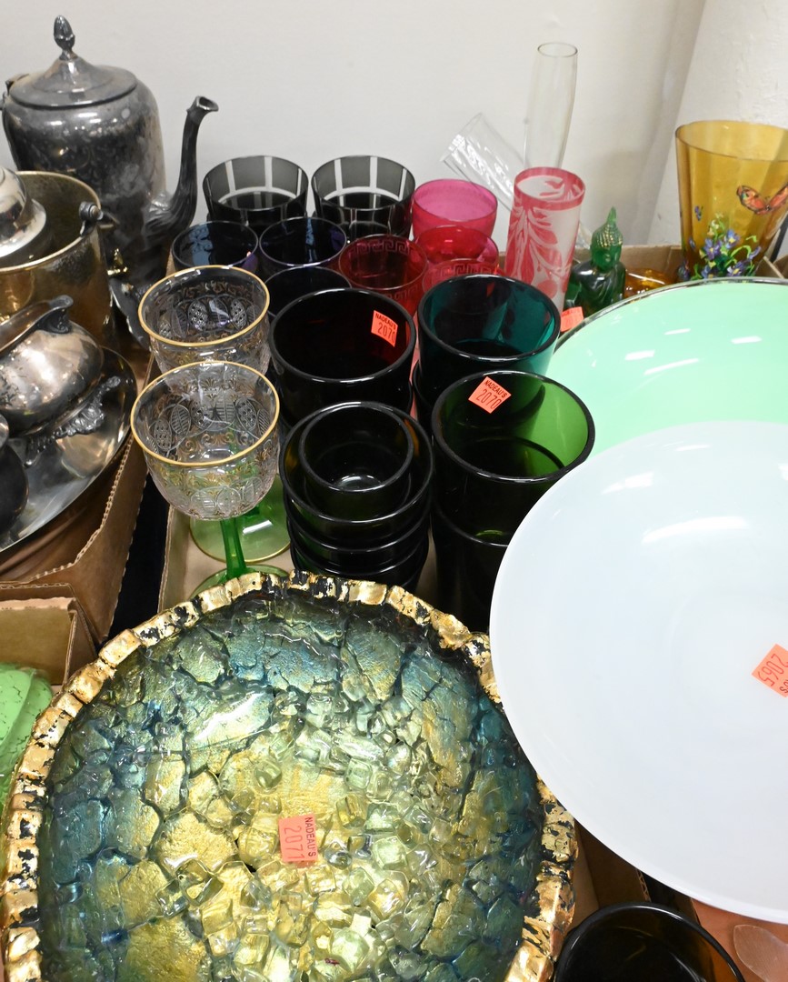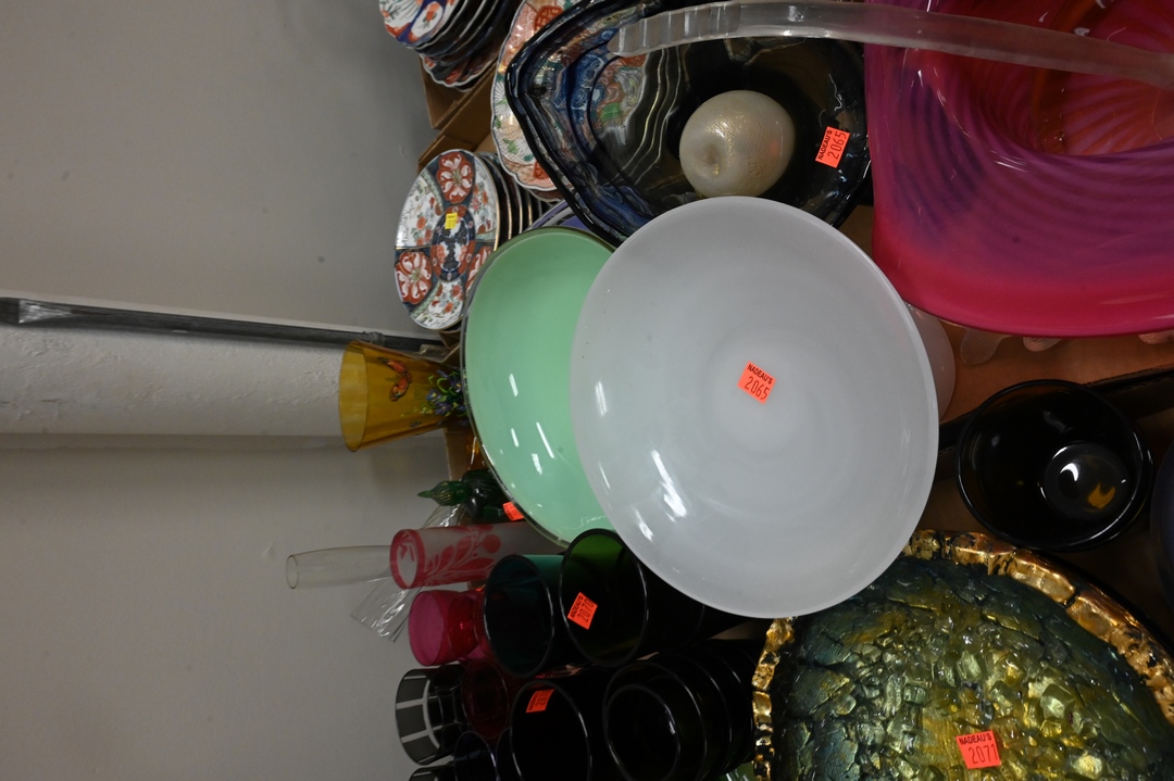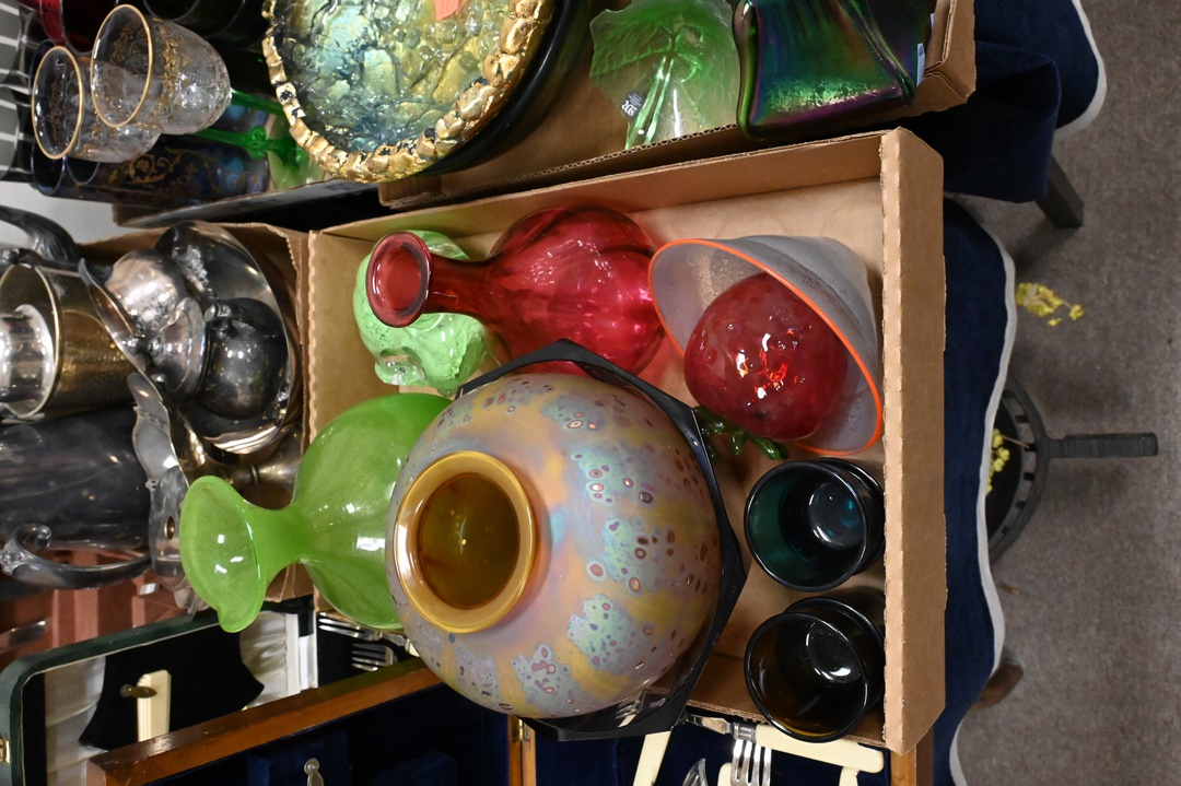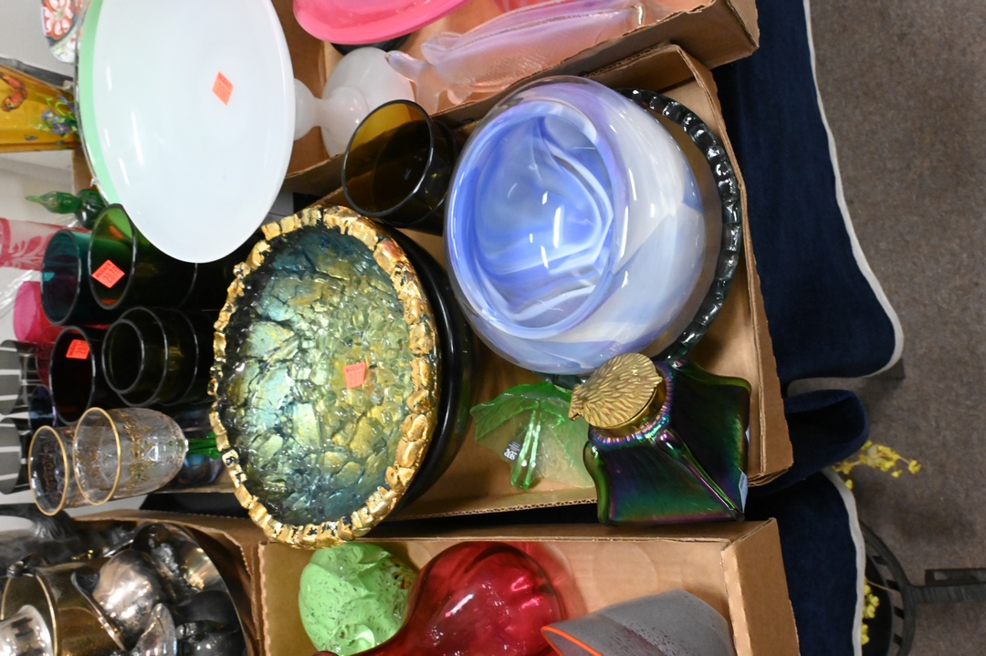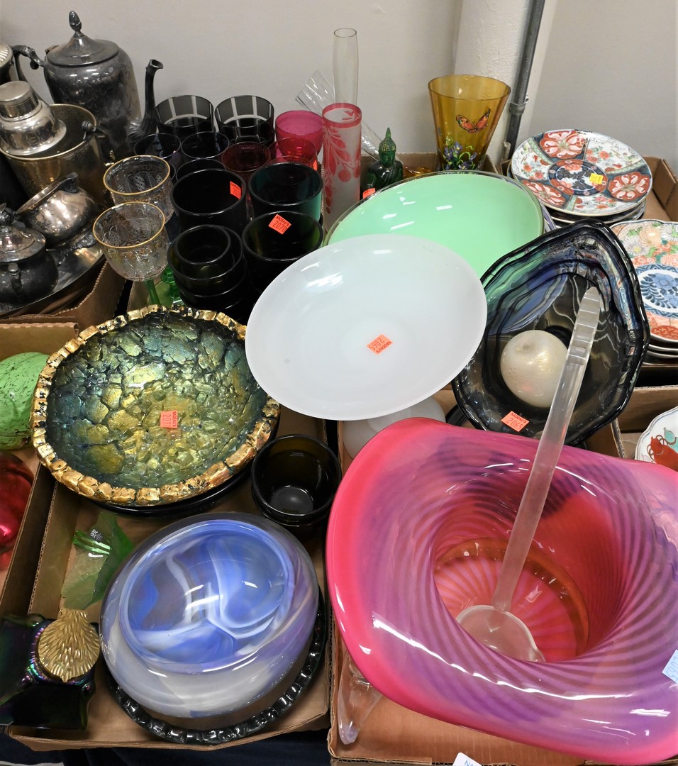 Four Tray Lots of Art Glass, to include bowls, vases, stems, water glasses, etc.