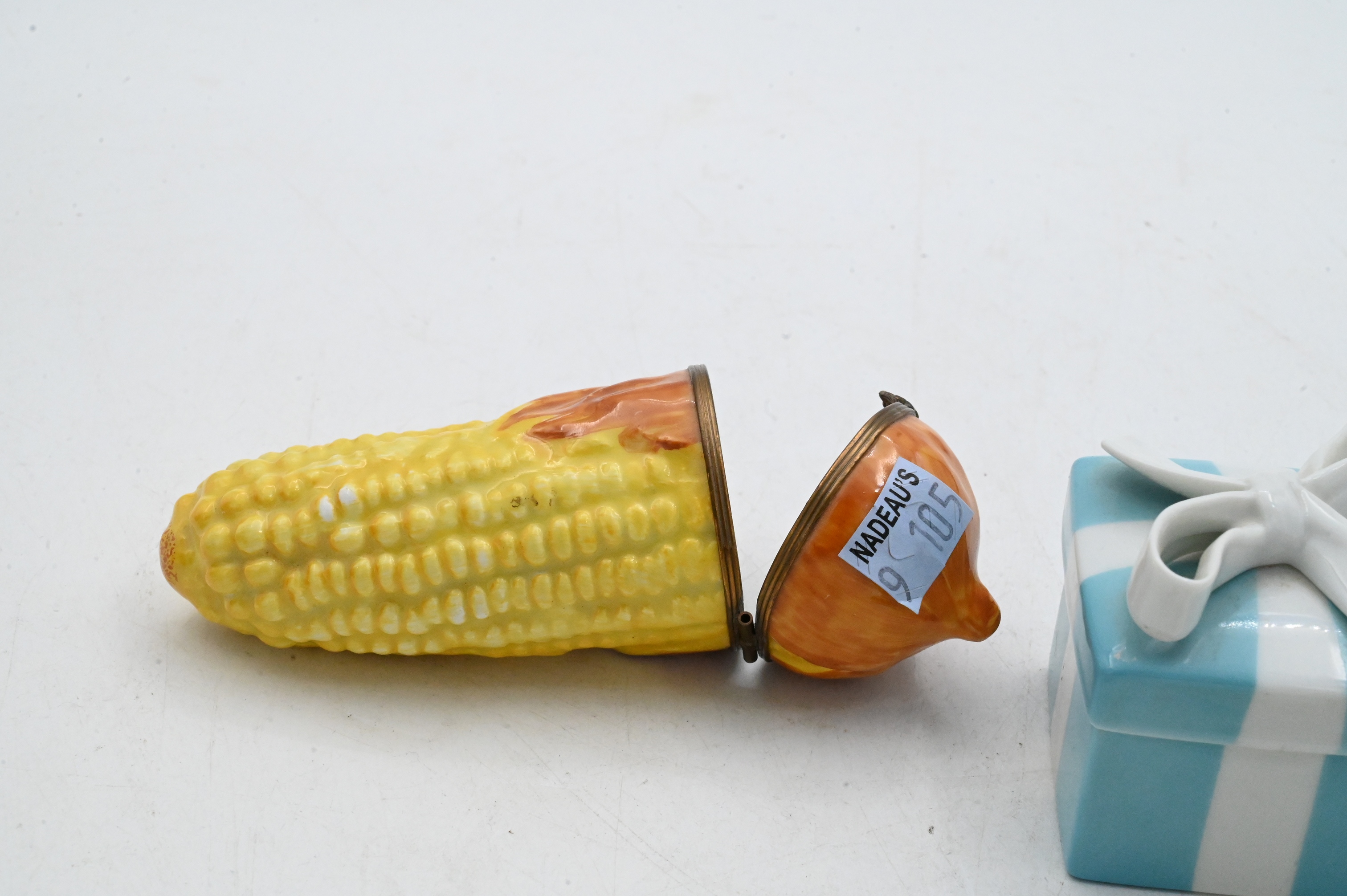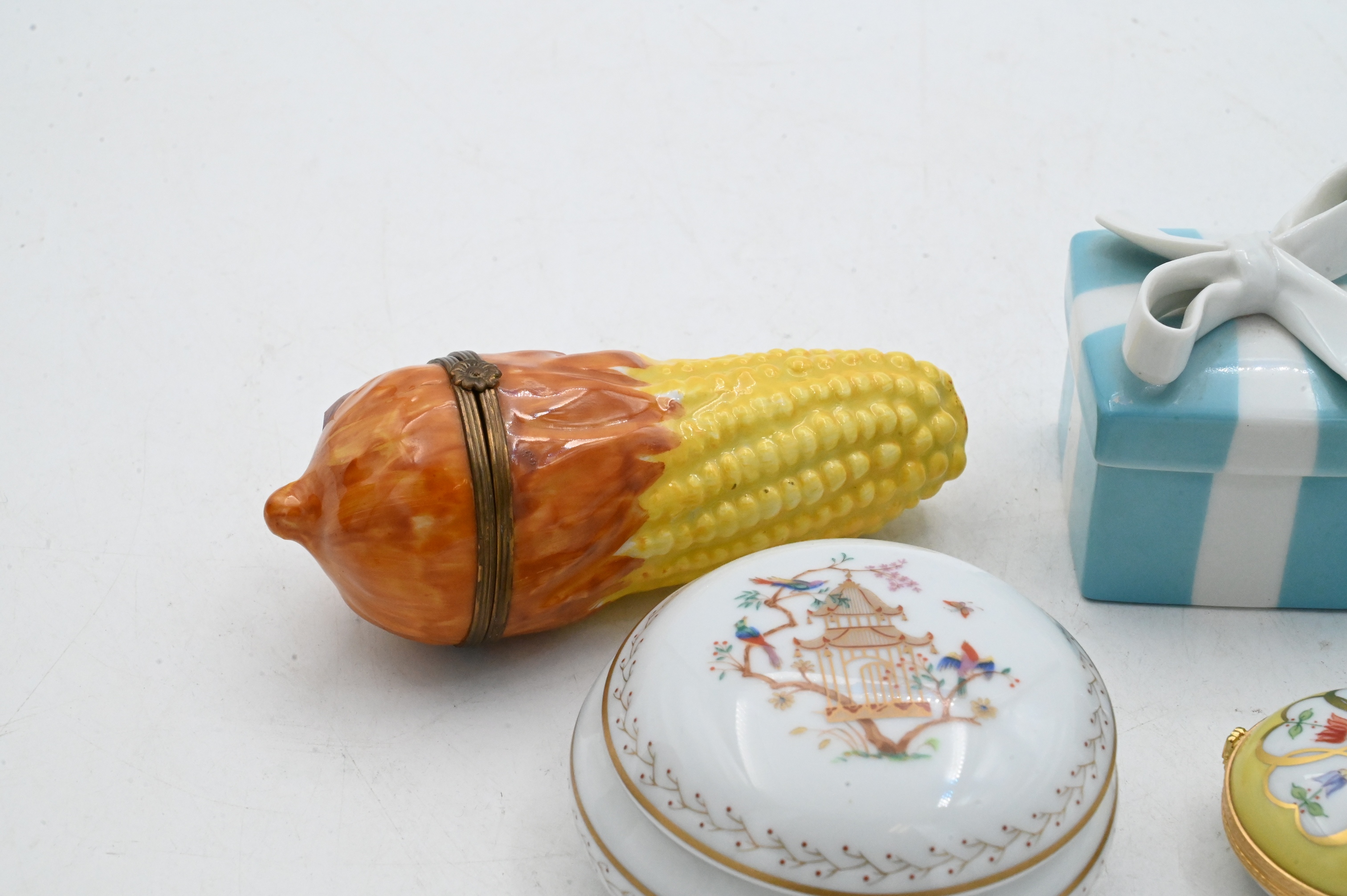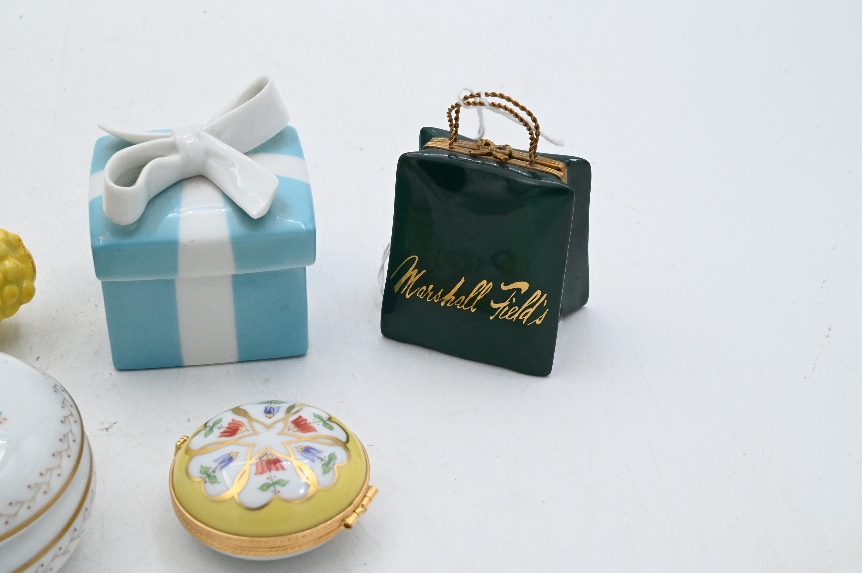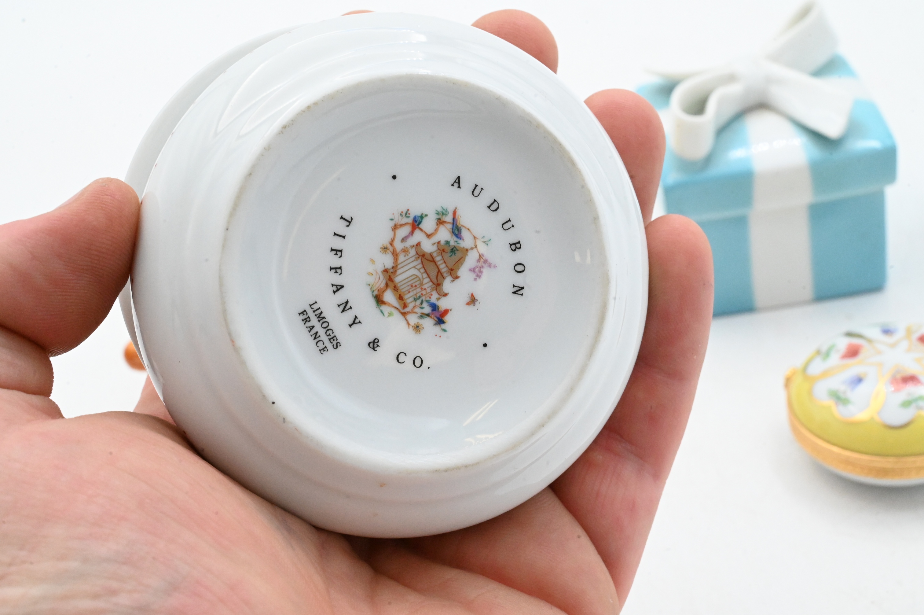 Including a Tiffany & Co. Audubon Limoges oval box; a Tiffany & Co. round floral box marked Made in France; a Tiffany & Co. blue gift box; a green Marshall Field’s shopping bag box by Le Vieux Paris; and a corn-form box marked Peint Main Limoges France for Tiffany & Co.