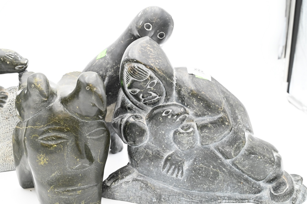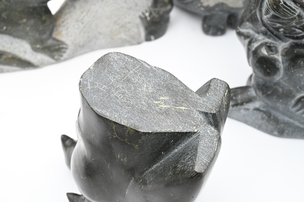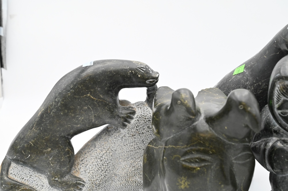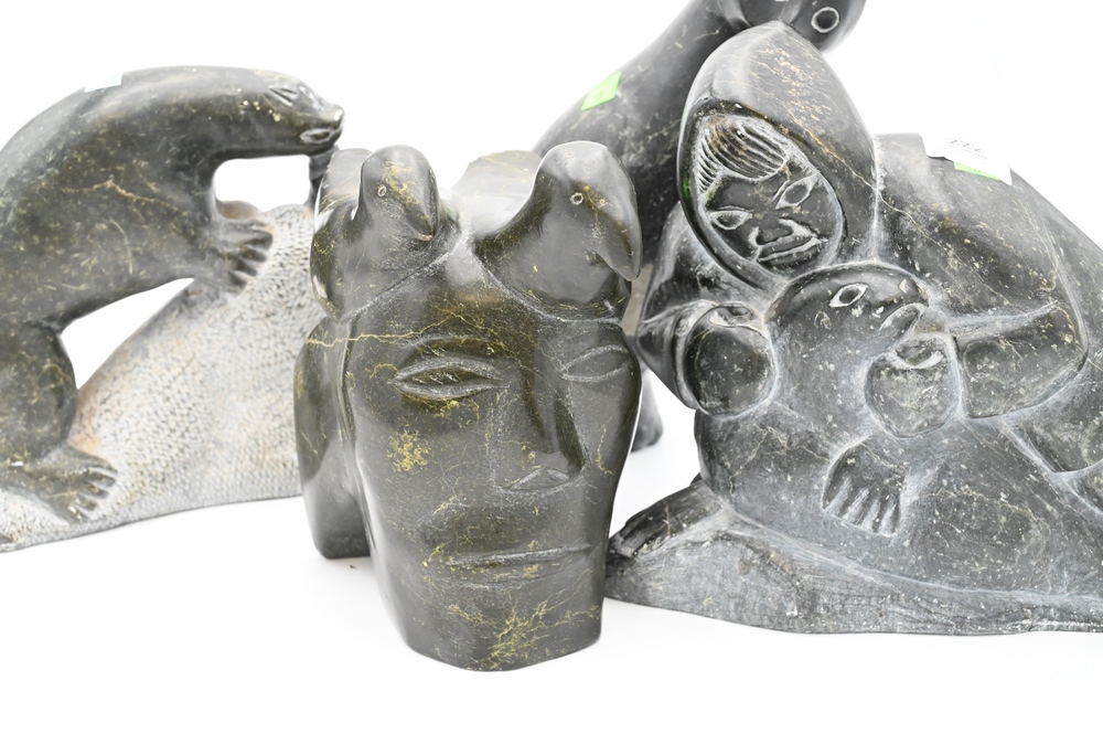 Lot 222: Group of Four Eskimo Carved Sculptures, to include Peter Tuki Walrus, carved head with bird headdress, kaling carved bird, and an Eskimo figure with sea lion, tallest 11 inches.