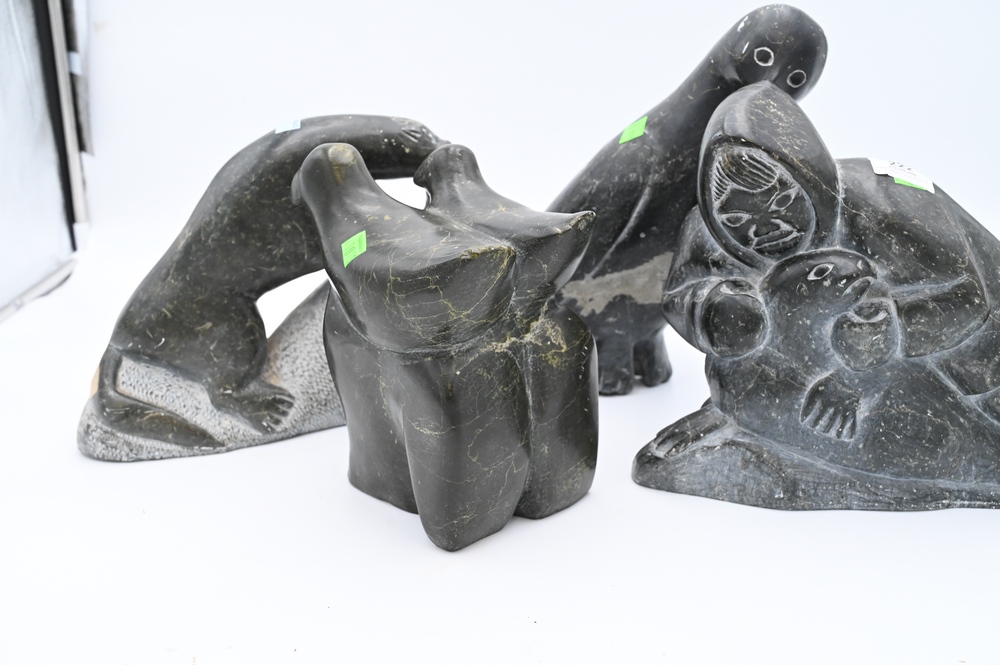 Group of Four Eskimo Carved Sculptures, to include Peter Tuki Walrus, carved head with bird headdress, kaling carved bird, and an Eskimo figure with sea lion, tallest 11 inches.