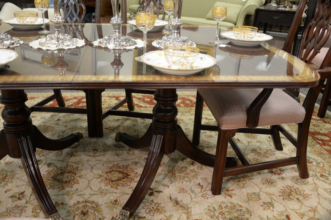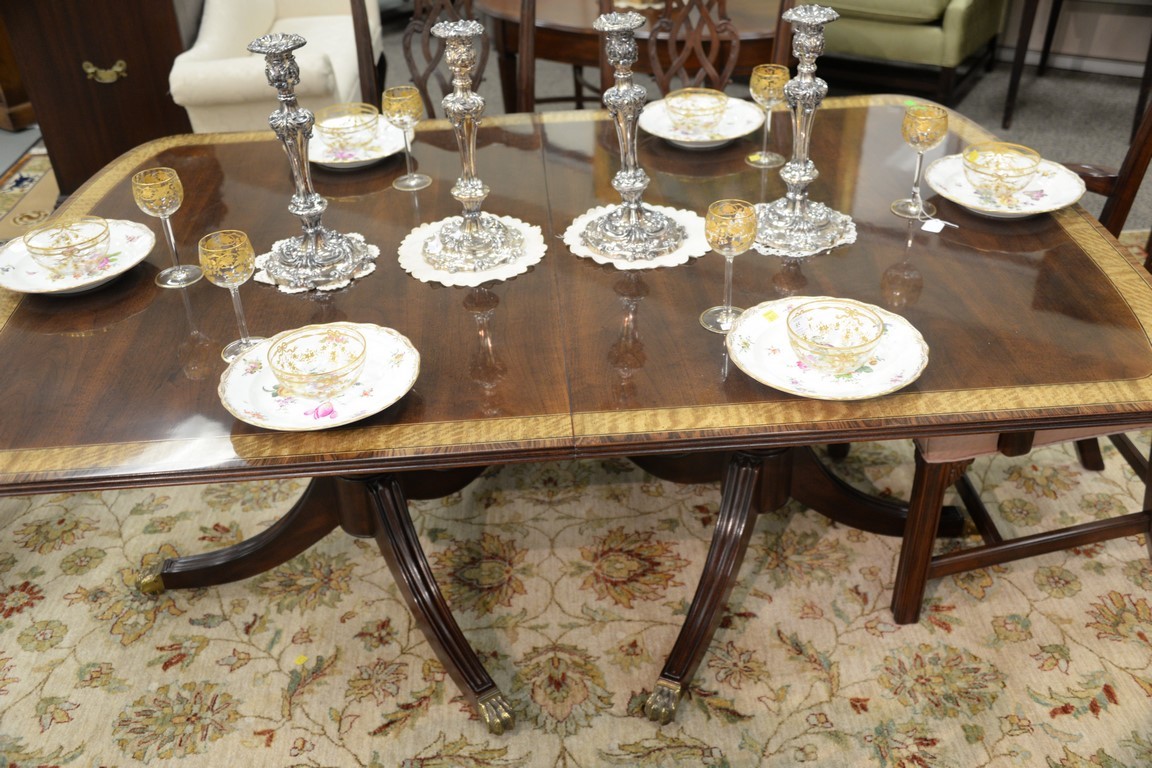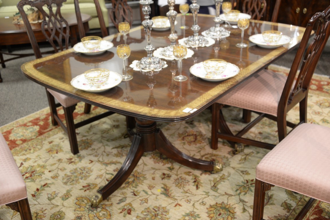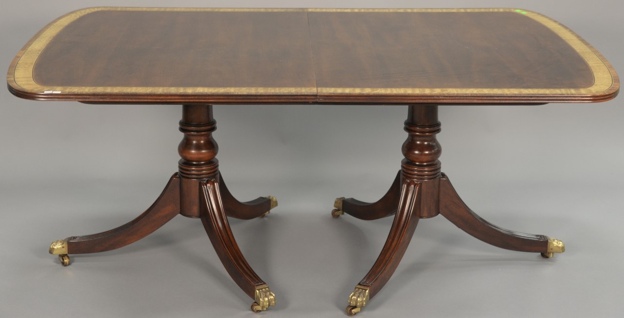 Lot 222: Henredon mahogany double pedestal dining table with banded inlaid top plus two 22 inch leaves and custom pads. ht. 29in., top: 45 x…