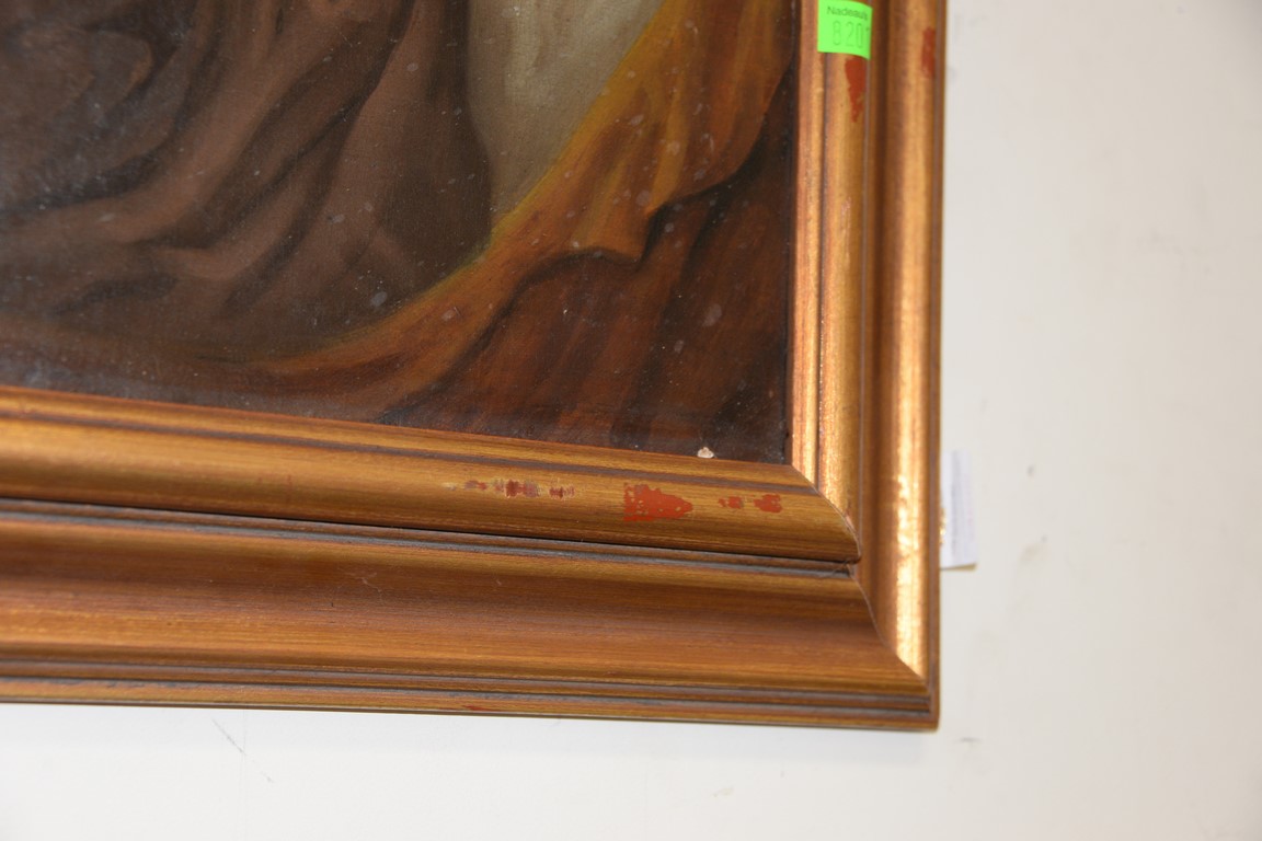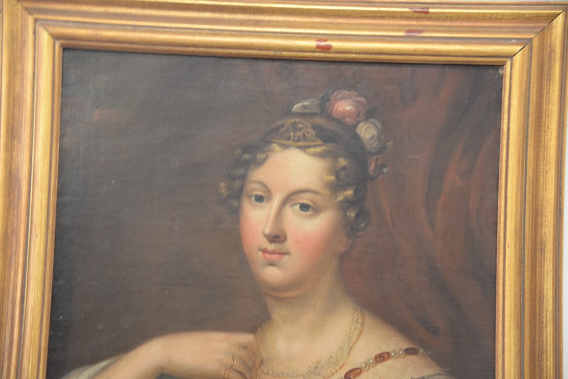Lot 222: Oil on canvas portrait of a woman wearing pearls and jewels, painted initials and crest lower left, 26 x 20.