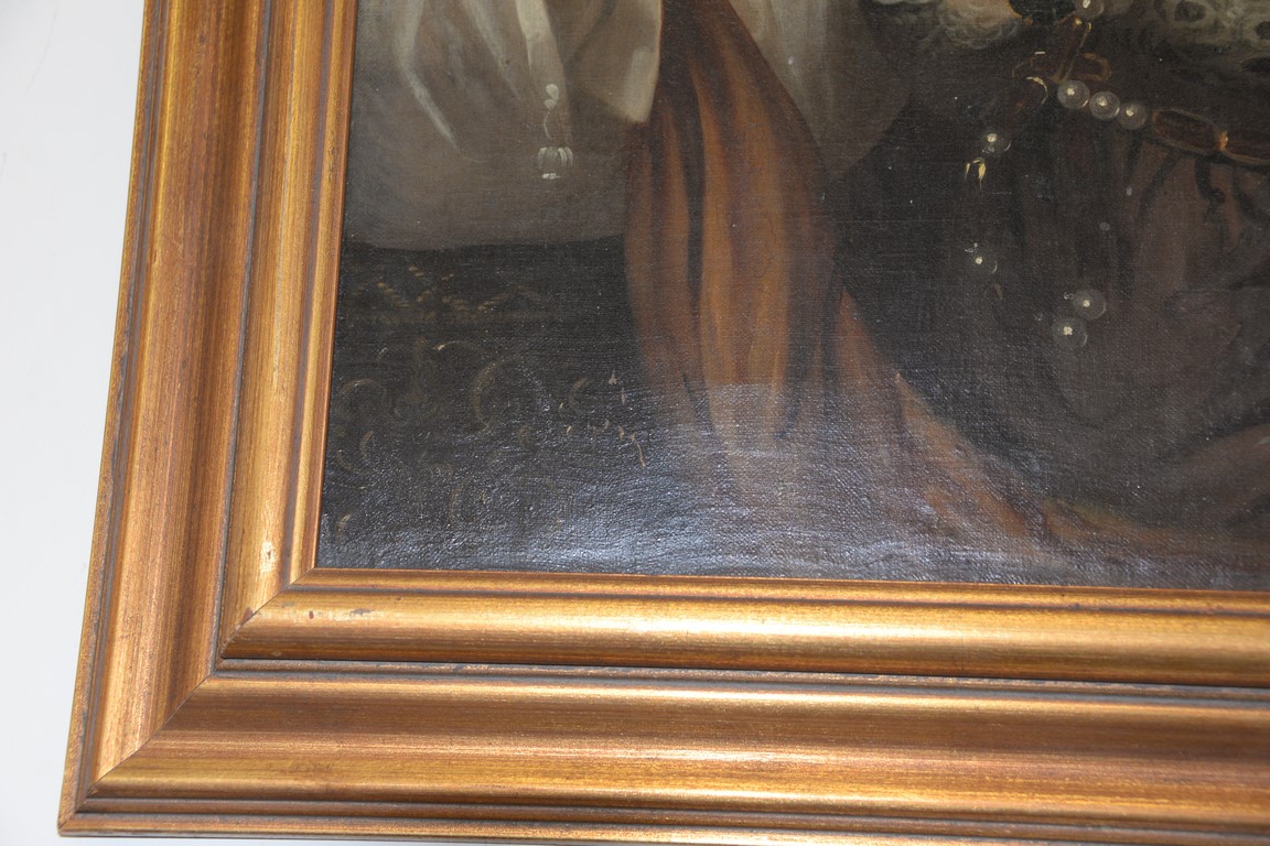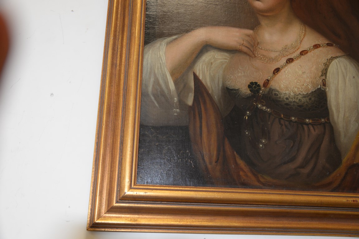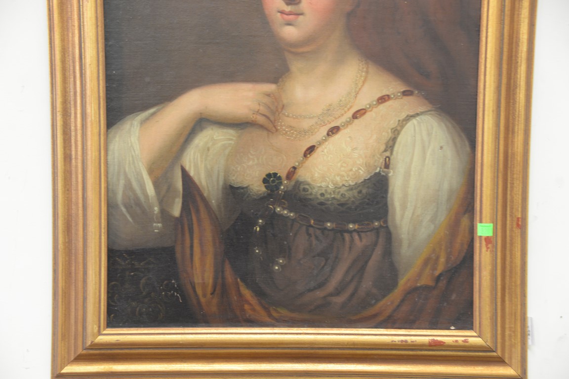 Oil on canvas portrait of a woman wearing pearls and jewels, painted initials and crest lower left, 26 x 20.