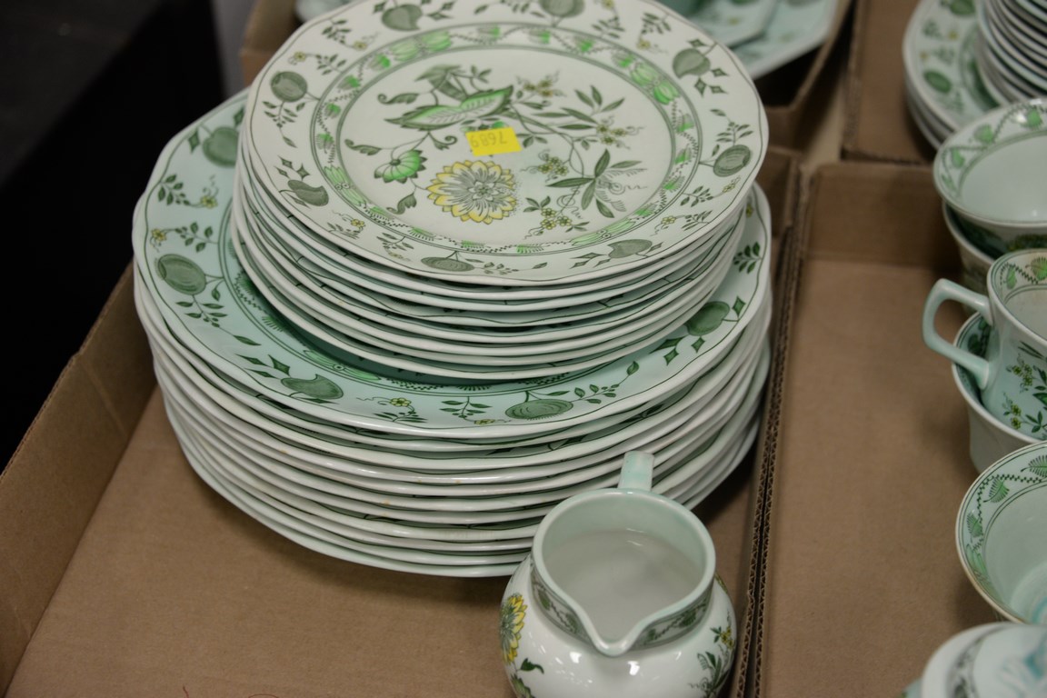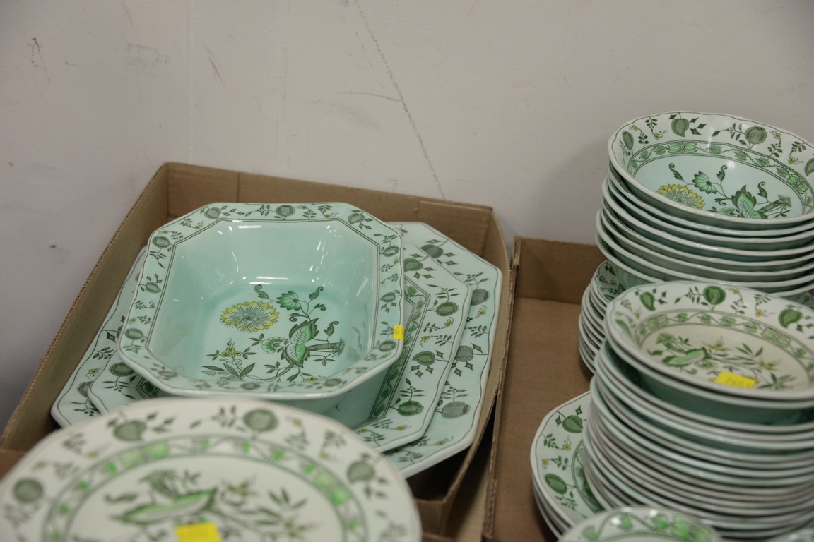 Oriental lamp and six box lots of two dinnerware sets including Adams Calyxware and Holiday china, approximately 135 total pieces.