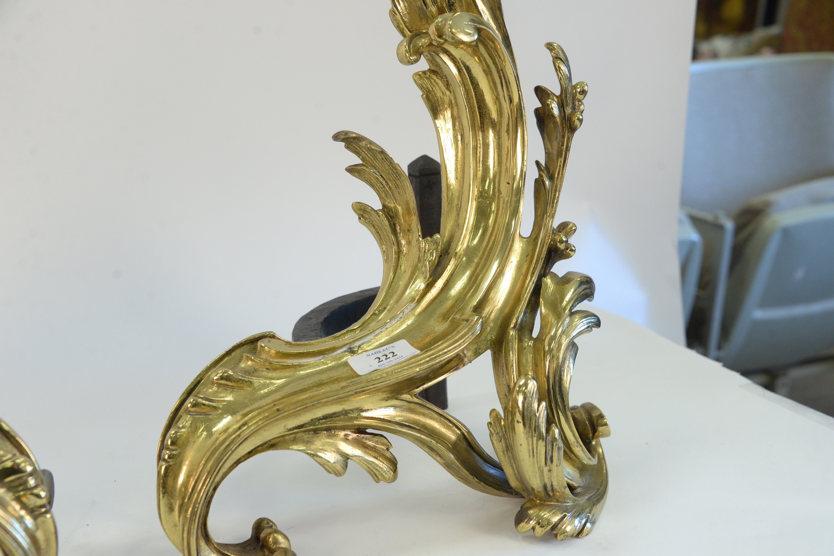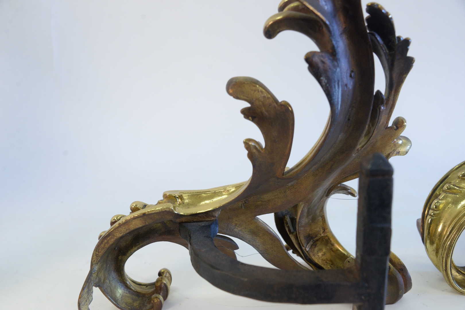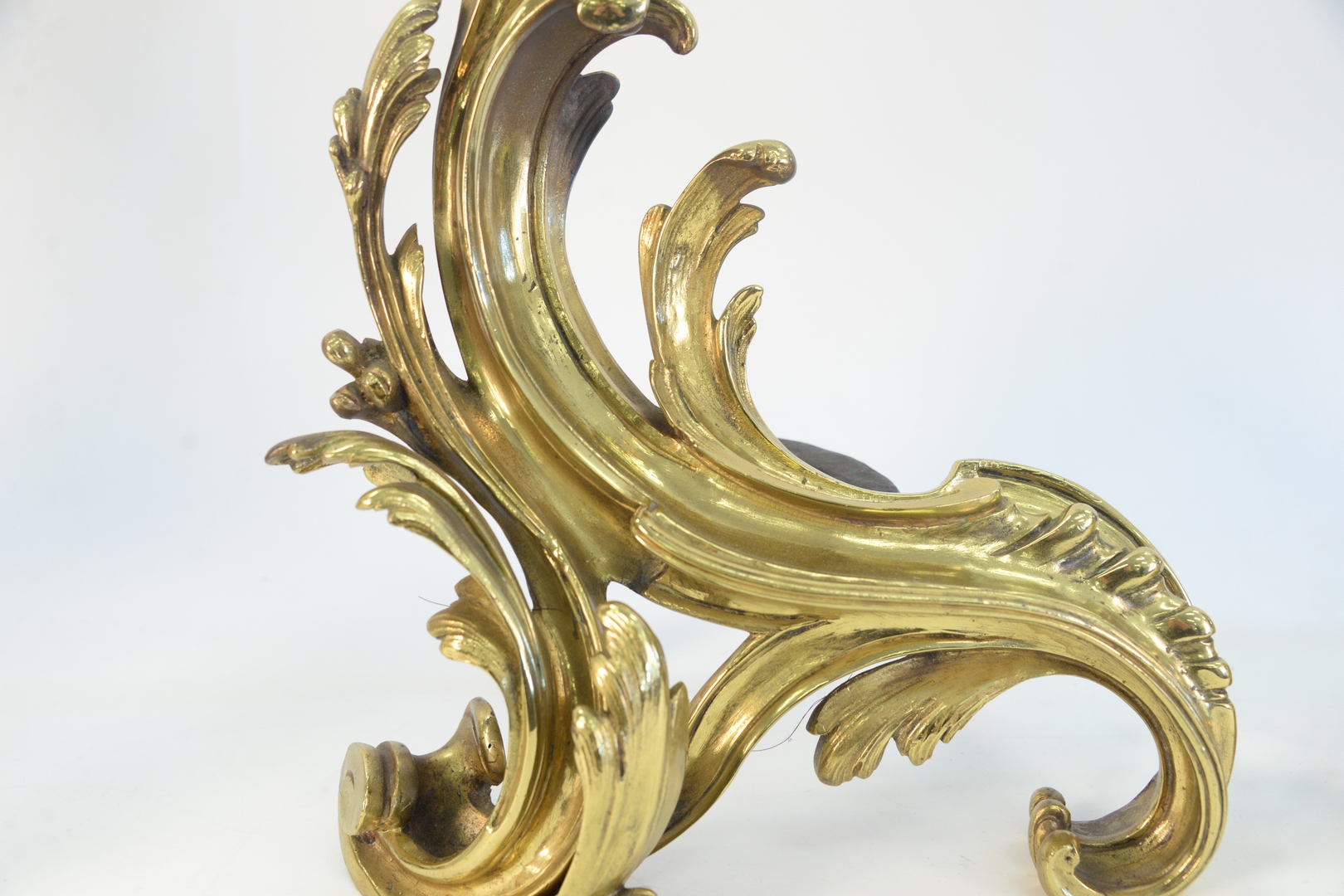 Lot 222: Pair of Louis XV Style Bronze Chenets, modeled as stylized acanthus leaf, marked Made in Germany, height 15 inches.