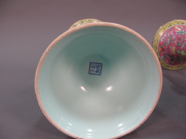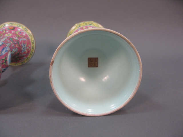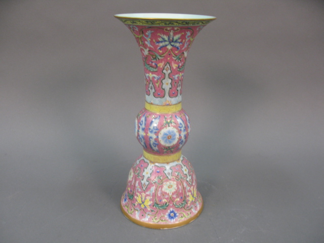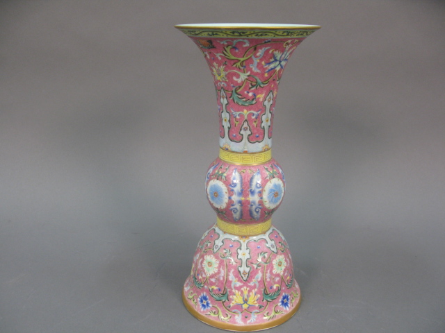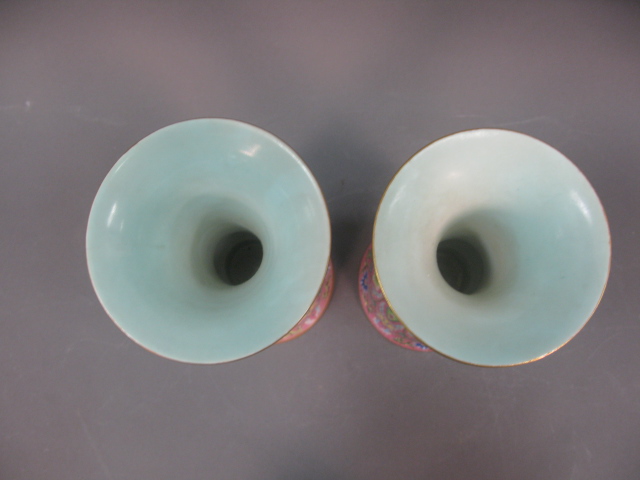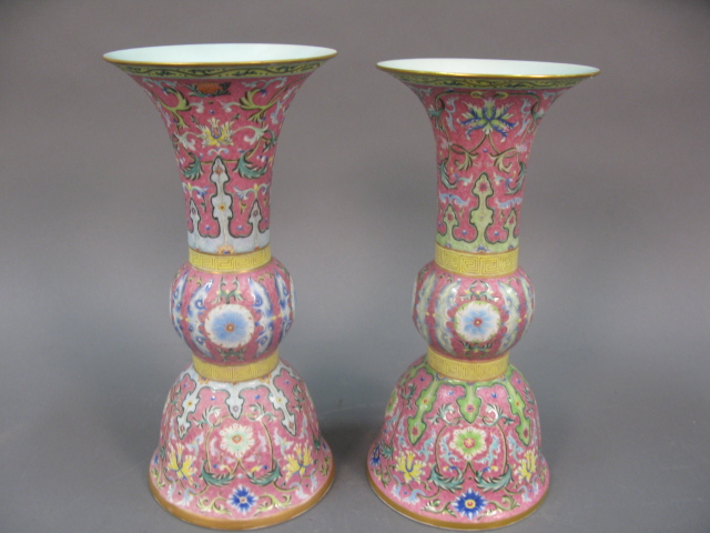 Pair of Qing dynasty Famille Rose porcelain Gu shaped vases.