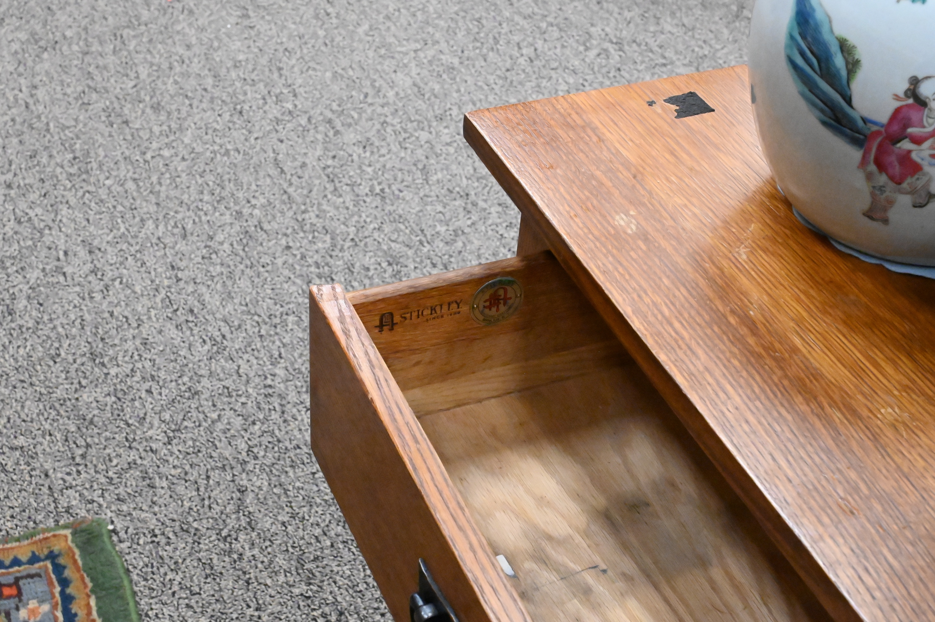 each having three drawers and backsplash, marked 89-910 #35 June 11 2010 on bottom of drawer, Stickley tag and mark on inside