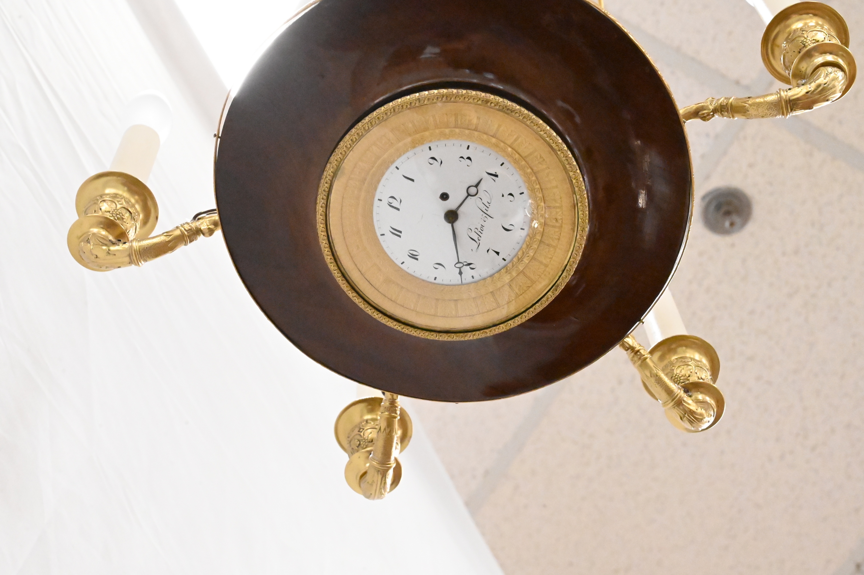 Unusual Empire chandelier fitted with six finely cast gilt-bronze scrolling arms, each terminating in classical candle nozzles with foliate ornament. The circular patinated bronze dish below is centered by a built-in clock, framed by a gilt bezel and supported by three small gilt masks. The upper section features alternating gilt turned elements and cut-glass roundels, rising to a matching canopy. A rare survival combining timekeeping with early 19th-century lighting design.