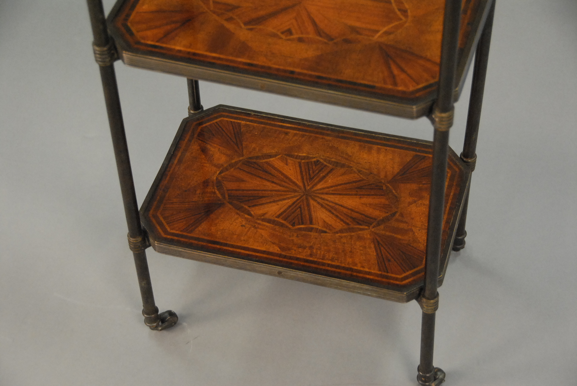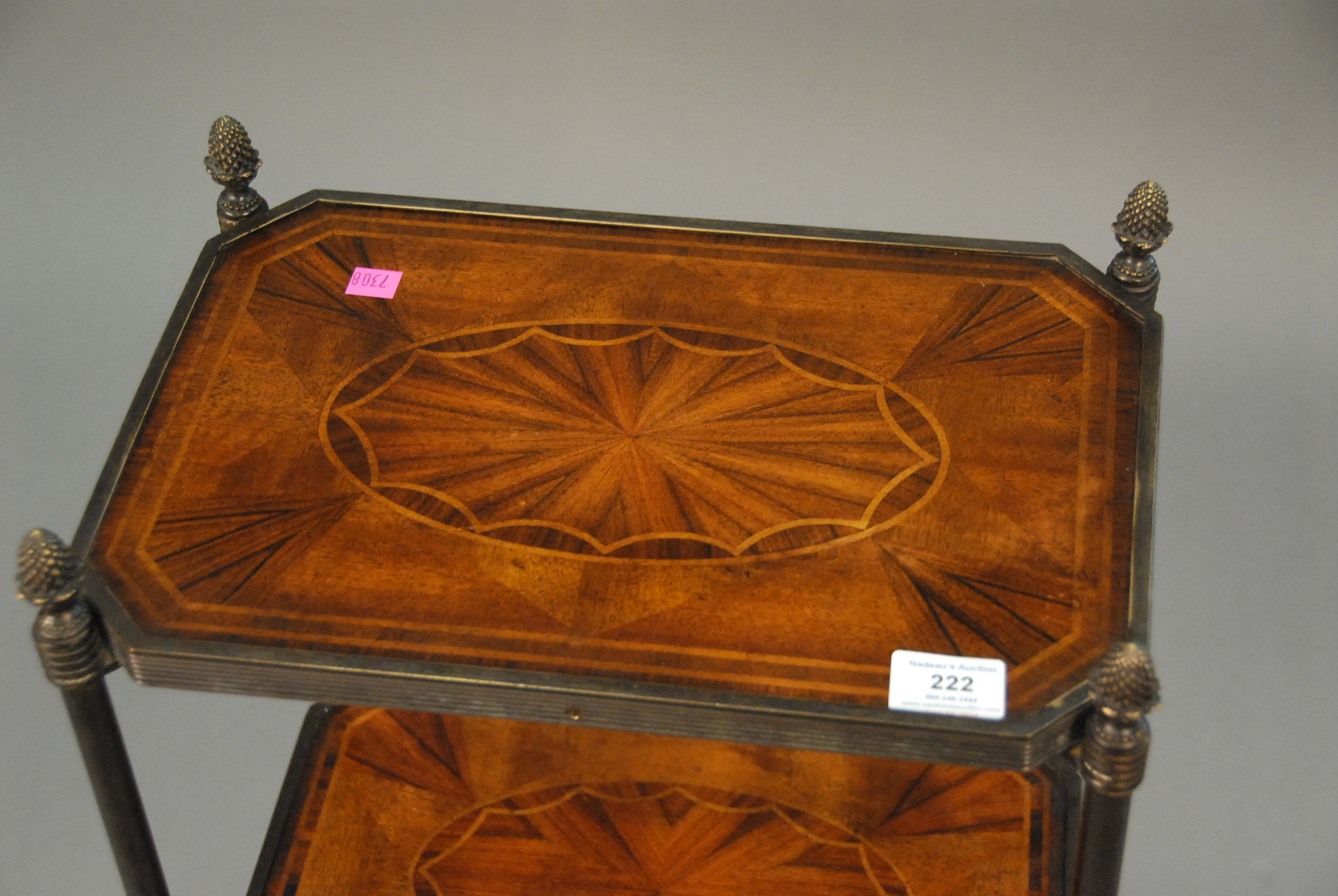 Lot 222: Regency mahogany three tier inlaid stand, ht. 33in. top: 10 1/2 x 5 1/2.