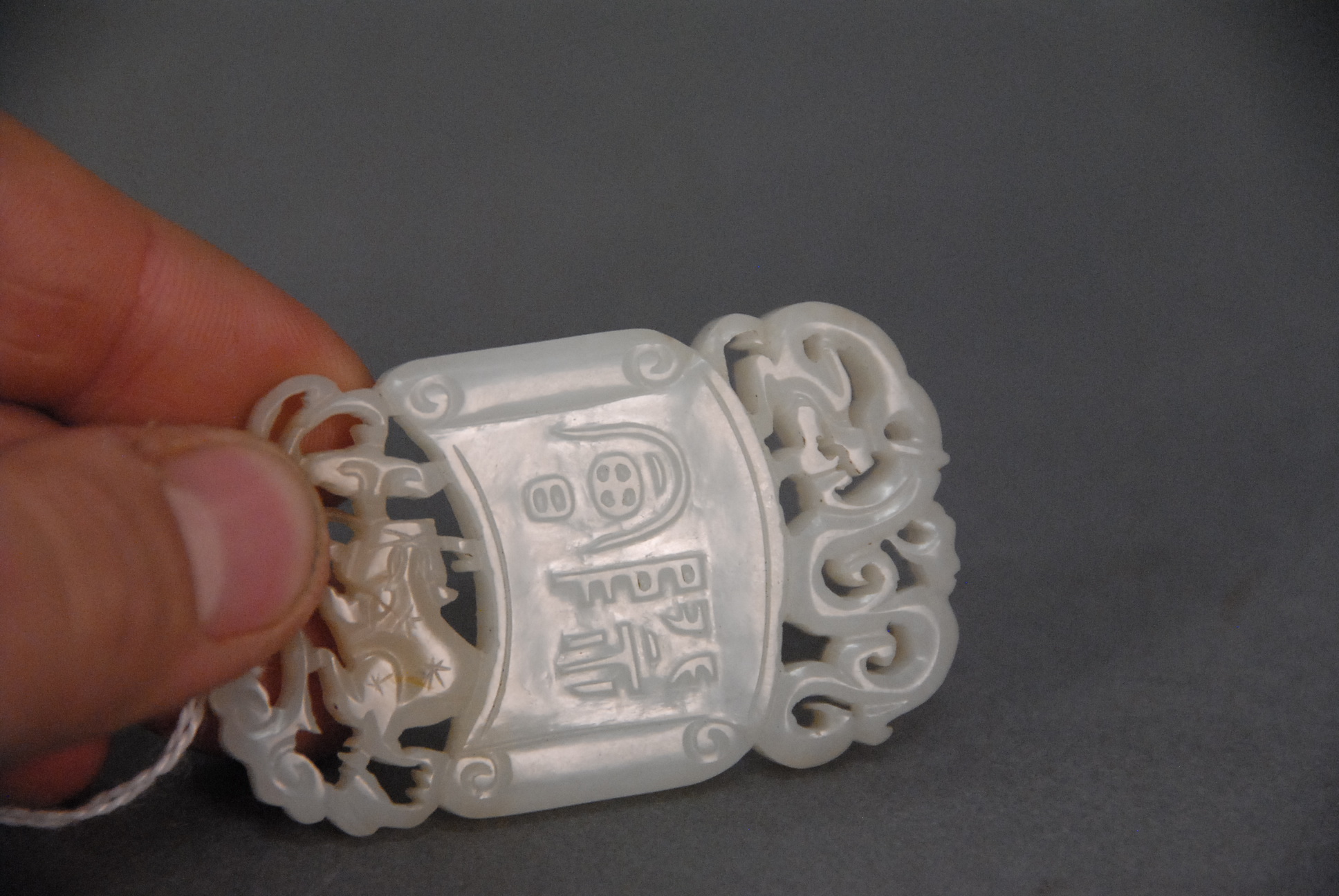 Lot 222: Small jade reticulated carved dragon pendent with incised character on both sides, 2 1/2 x 1 1/2.