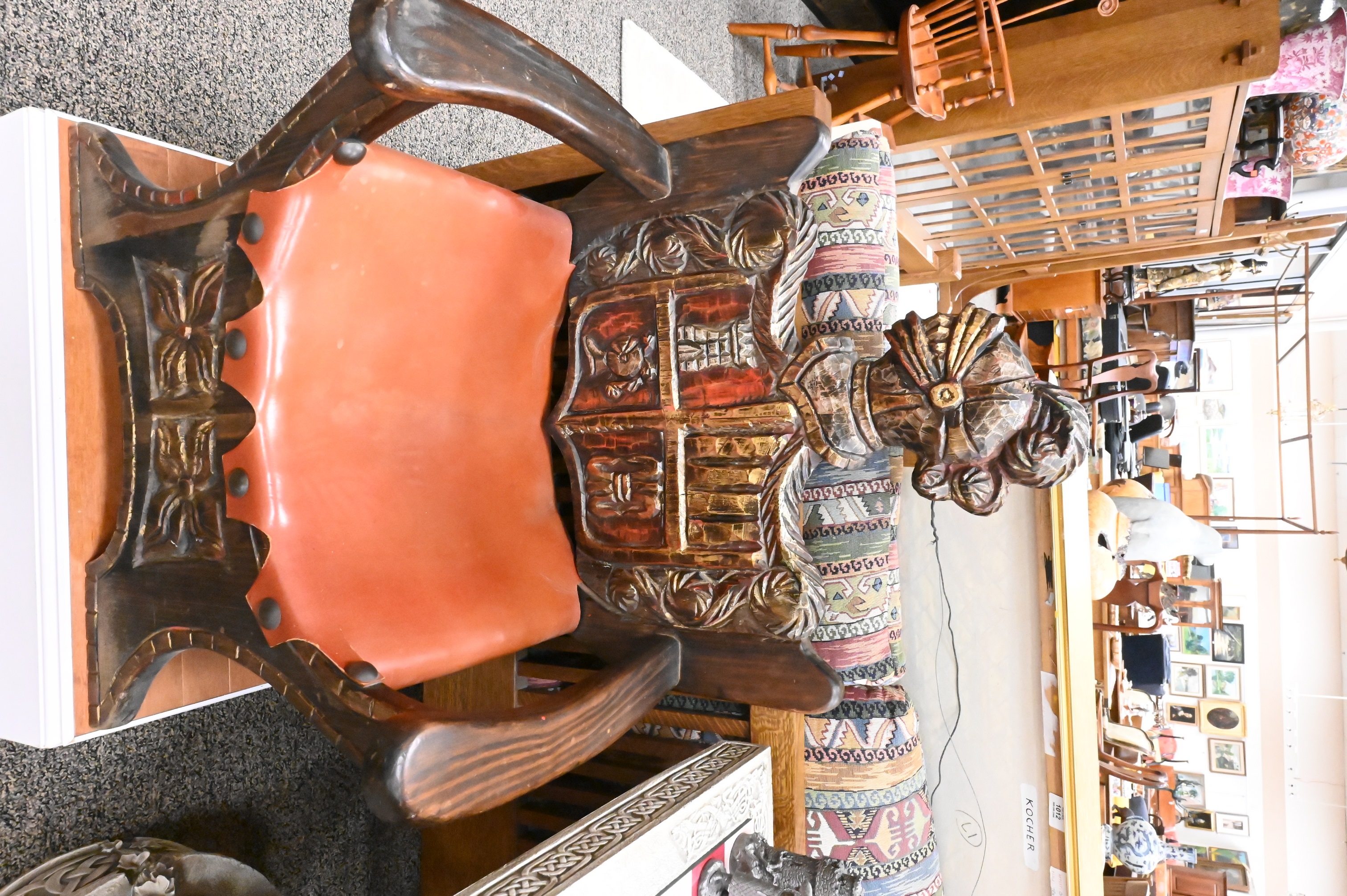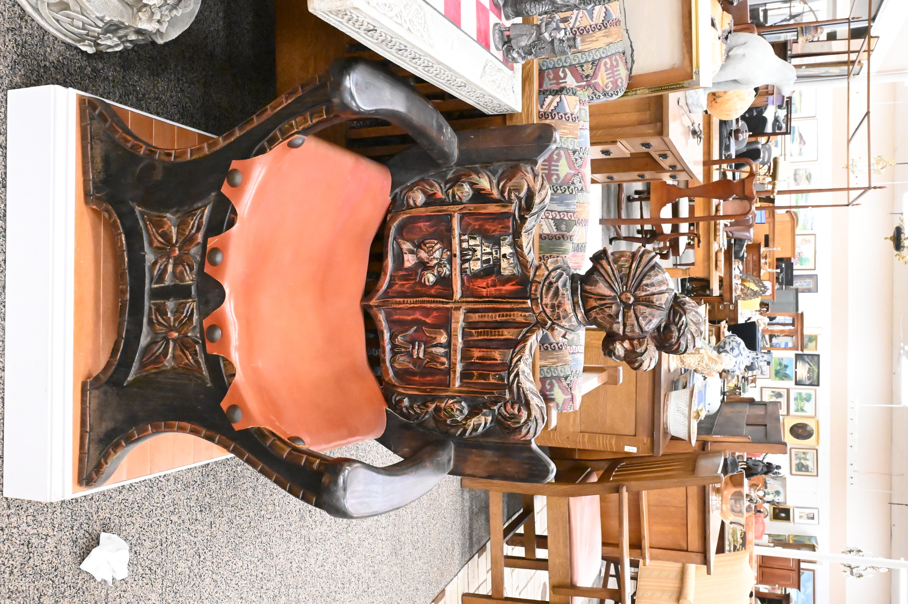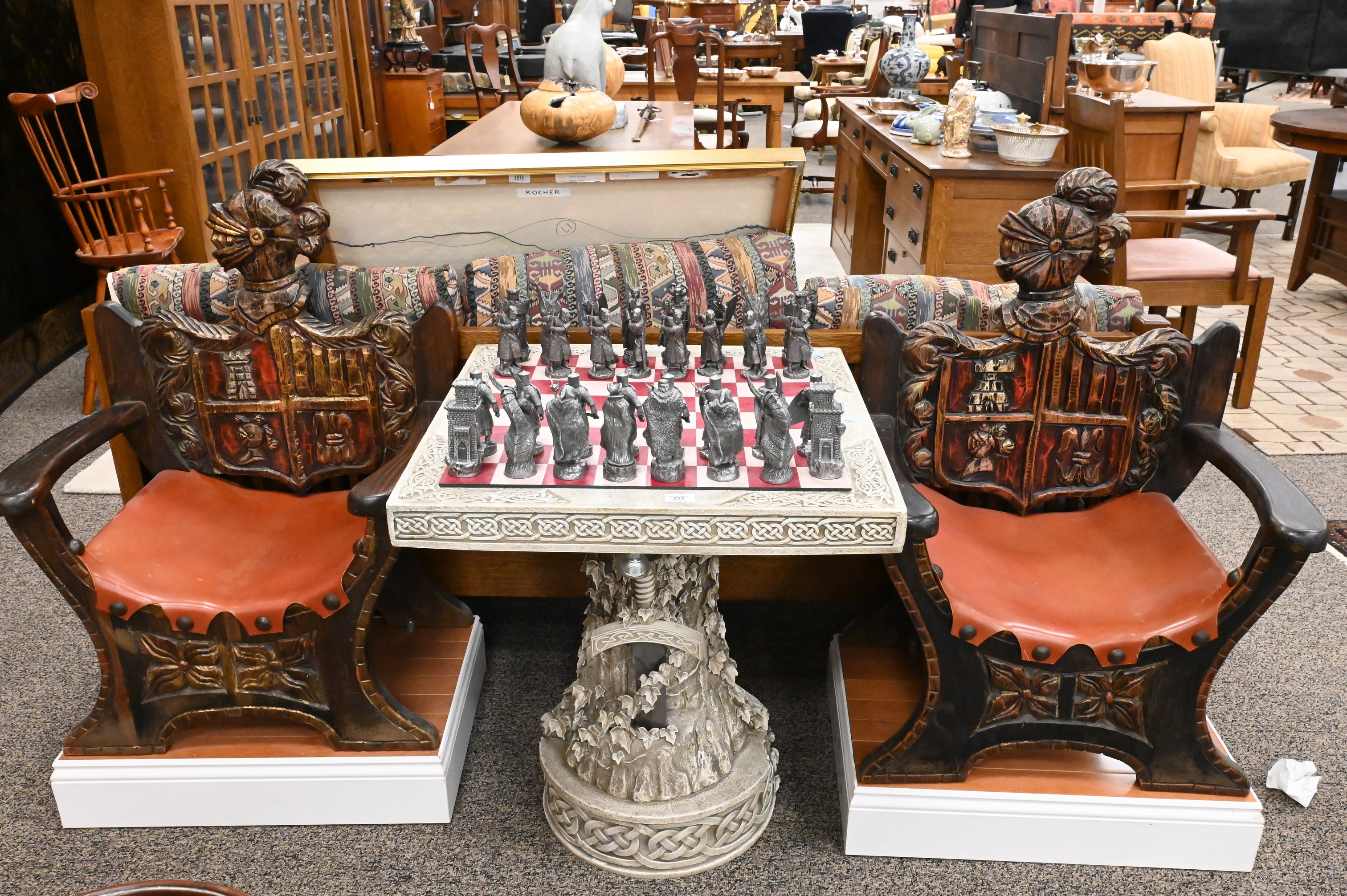 to include custom chess board / table having carved base along with two carved armchairs each set on platforms having castors, complete with chess pieces